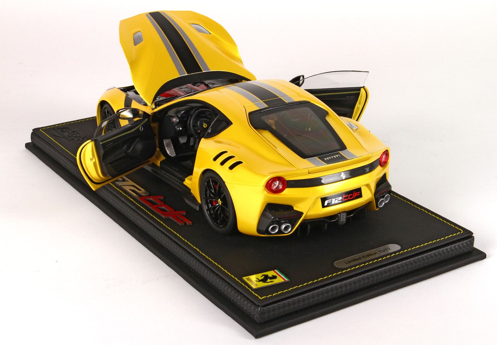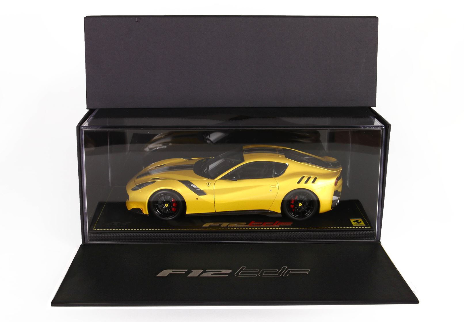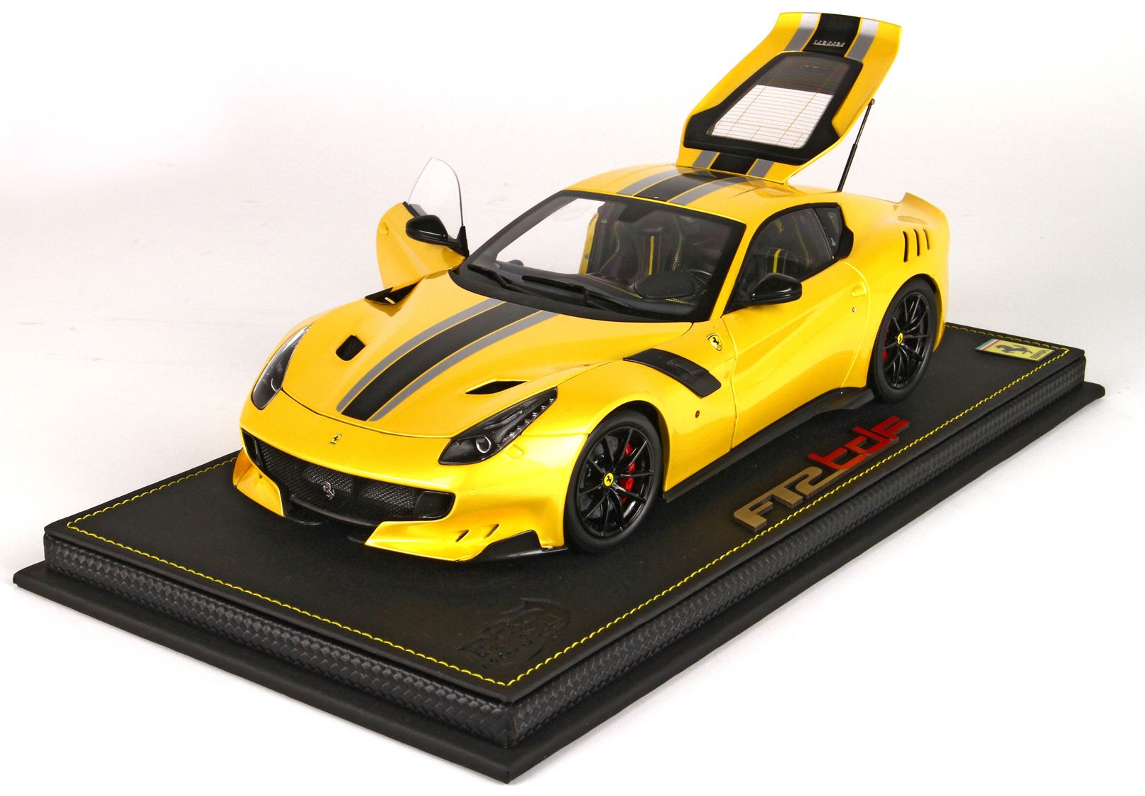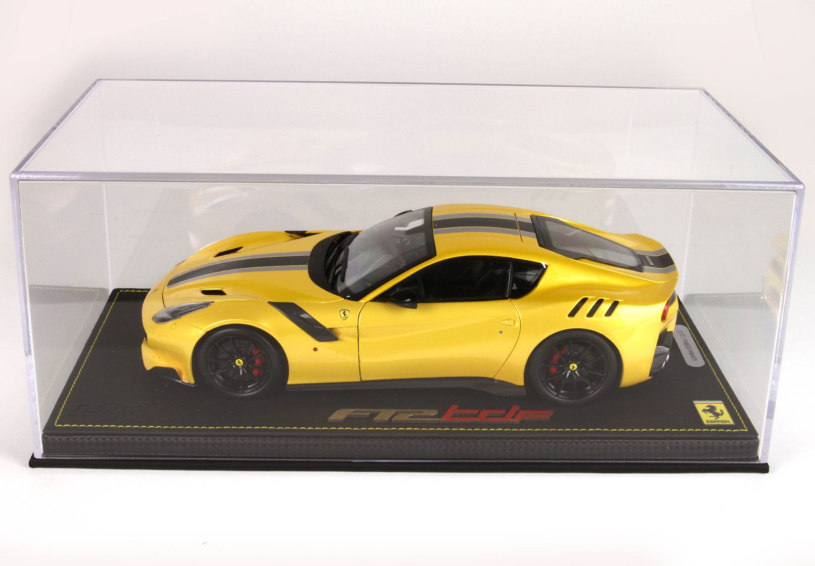 Modello venduto su base in tessuto tecnico ecopelle con cuciture gialle, vetrina in plexiglass. Confezione esterna personalizzata.