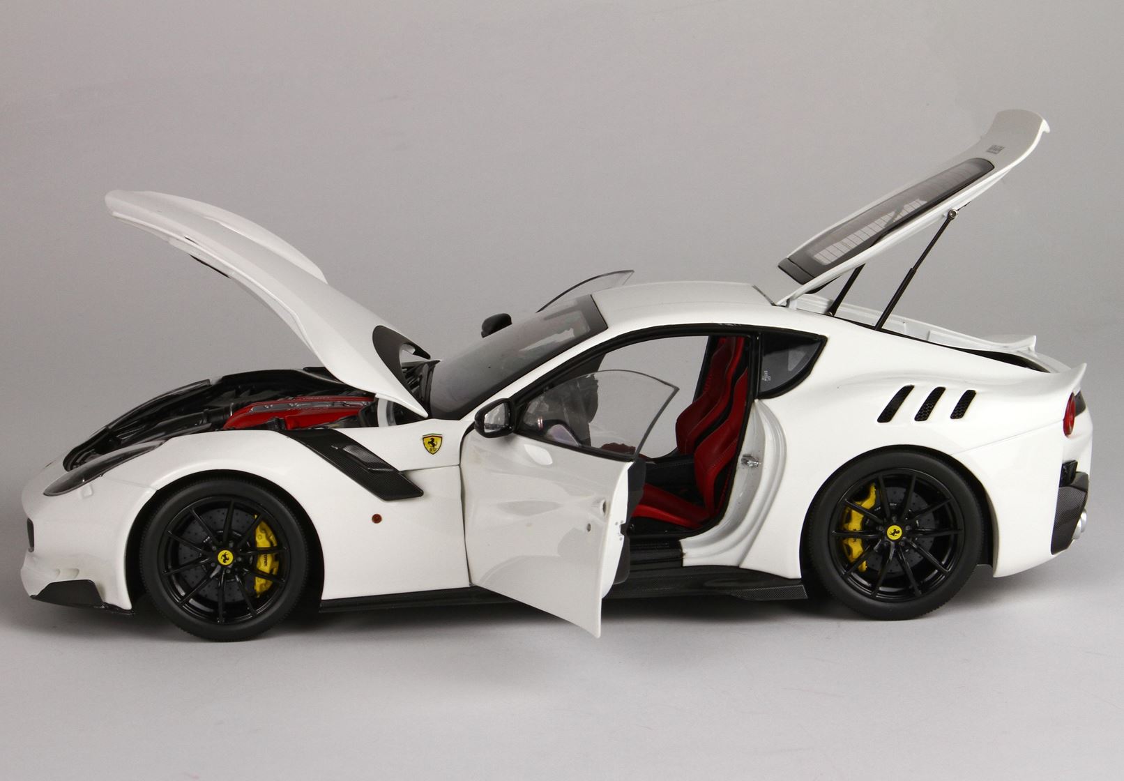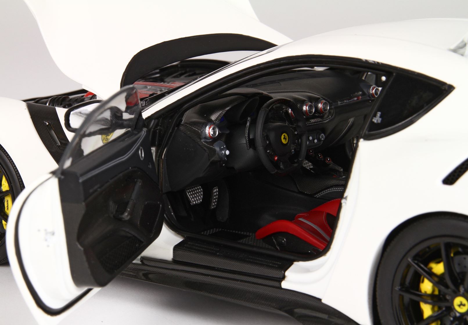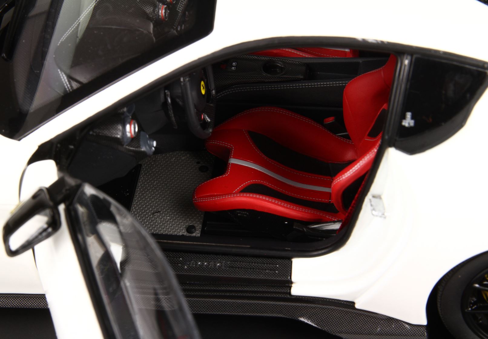 Automodello in DIE-CAST, composto dal corpo macchina tutto in metallo ed apribile. Colore originale Ferrari bianco Awus, ruote nero lucido e sedili rossi..