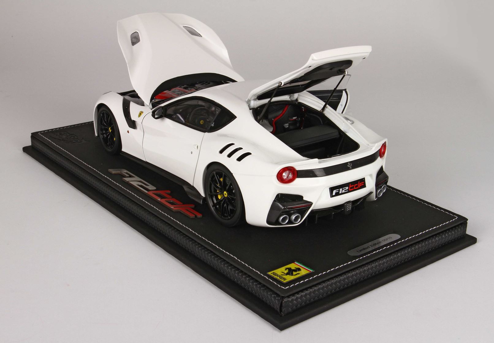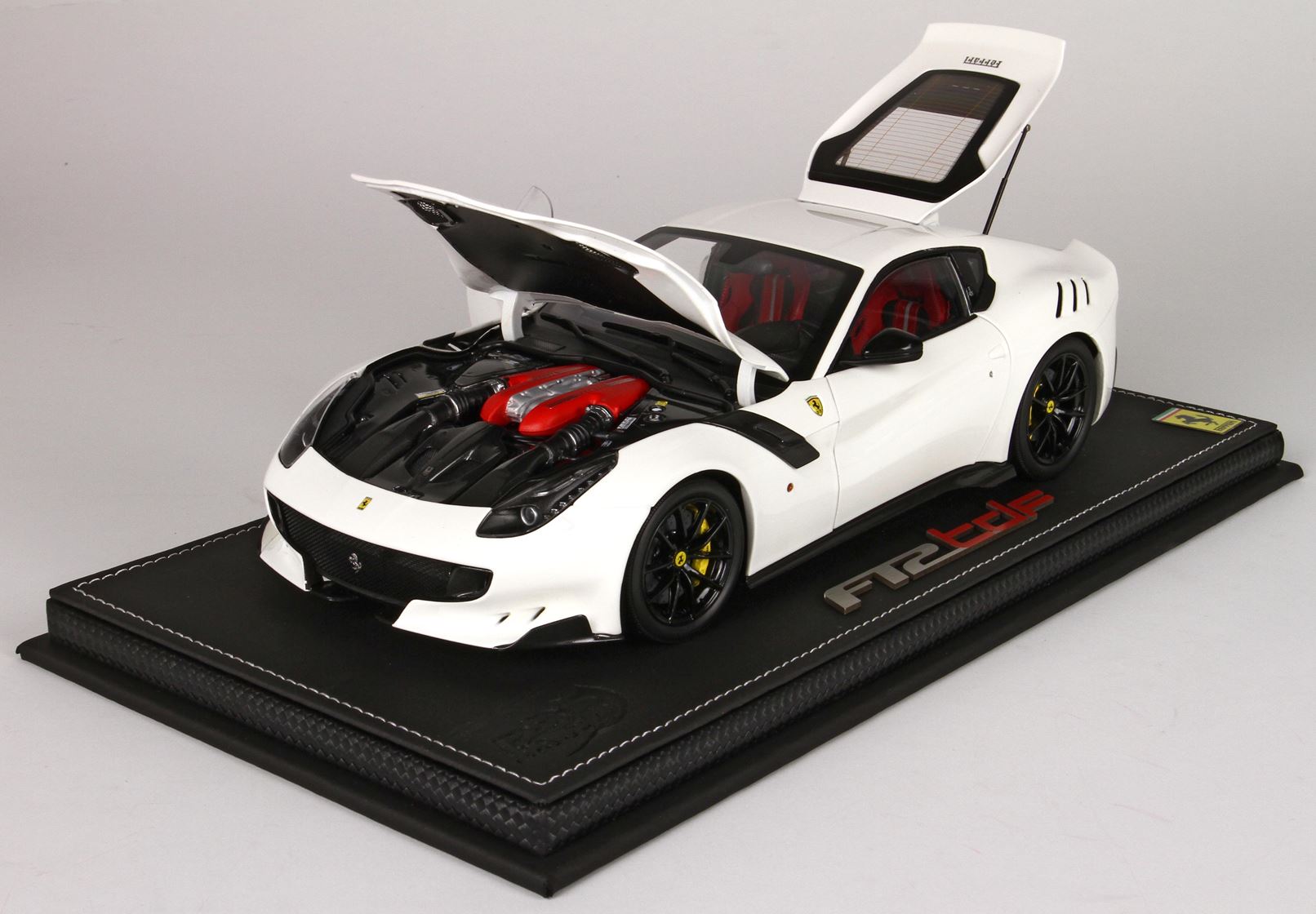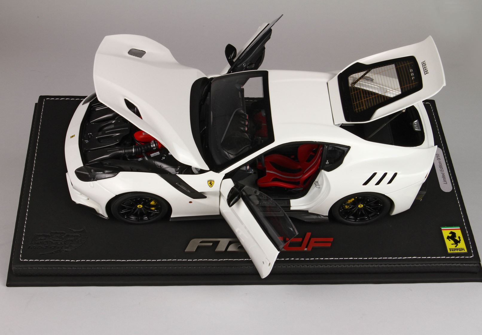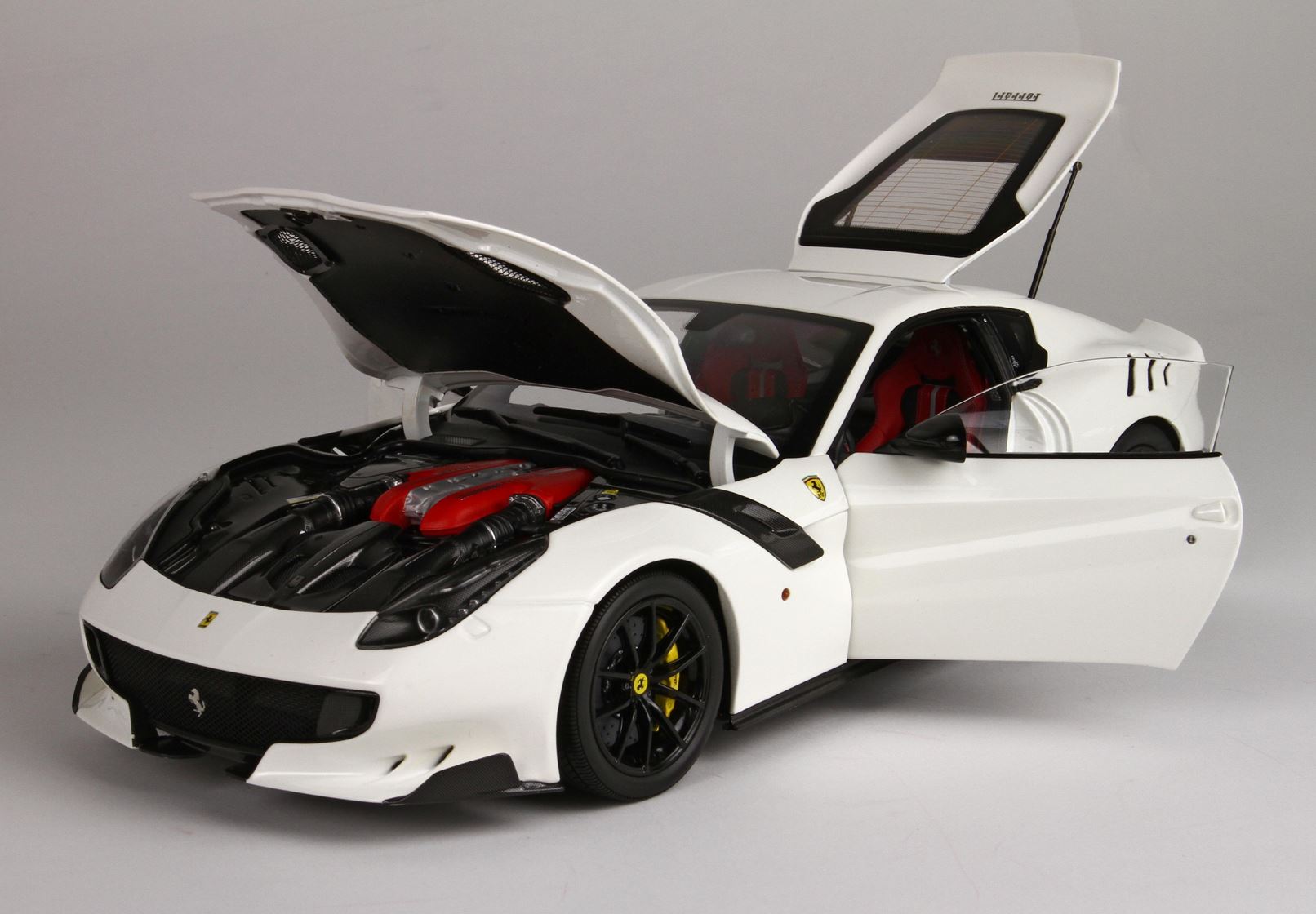 Automodello in DIE-CAST, composto dal corpo macchina tutto in metallo ed apribile. Colore originale Ferrari bianco Awus, ruote nero lucido e sedili rossi..