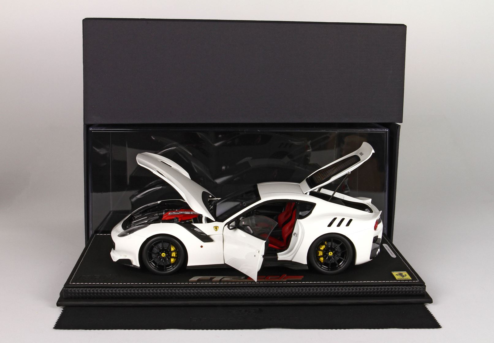 Modello venduto su base in tessuto tecnico ecopelle con cuciture gialle e con vetrina in plexiglass prodotta in Italia. Confezione esterna personalizzata.