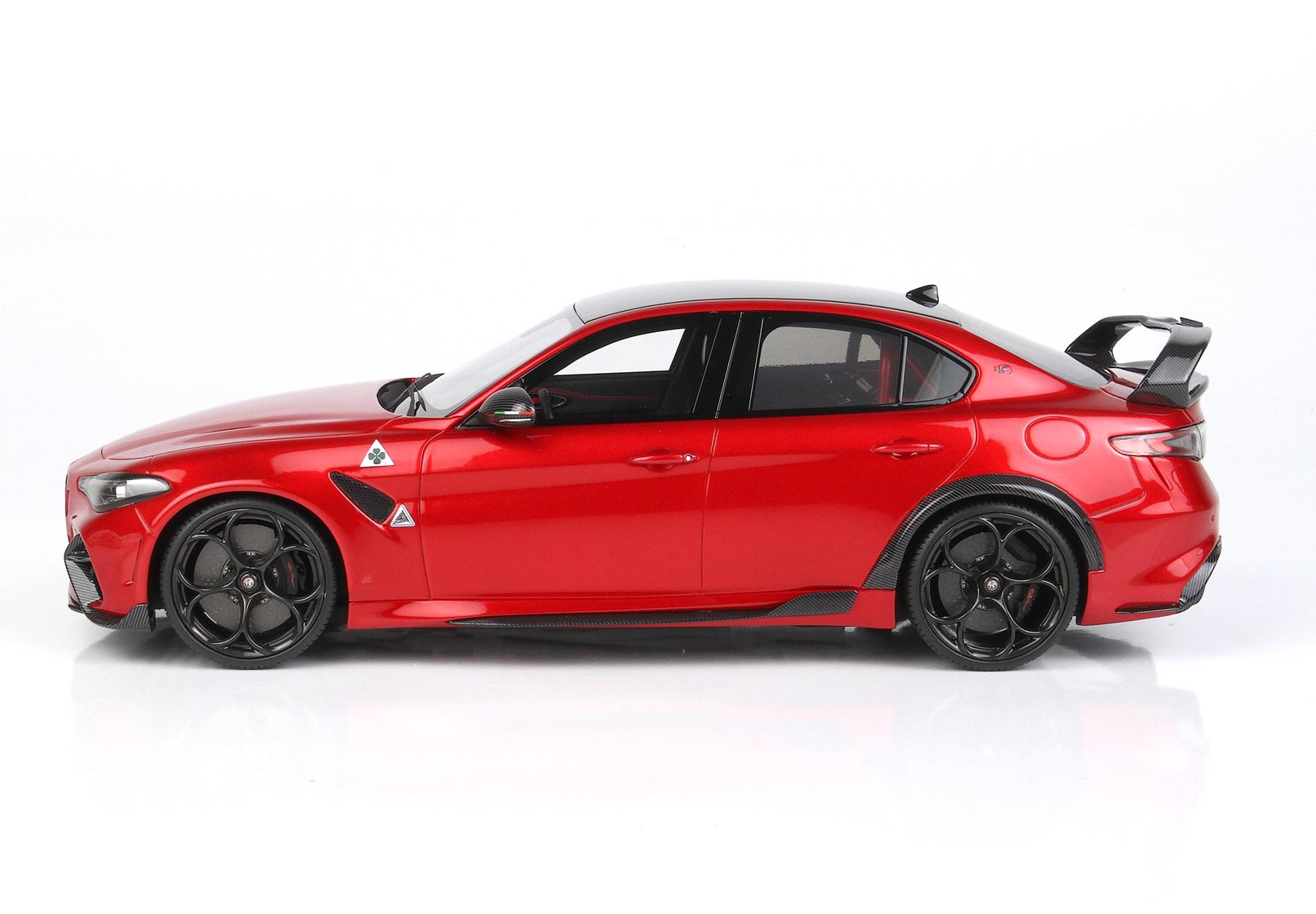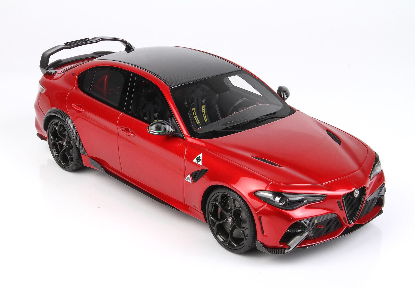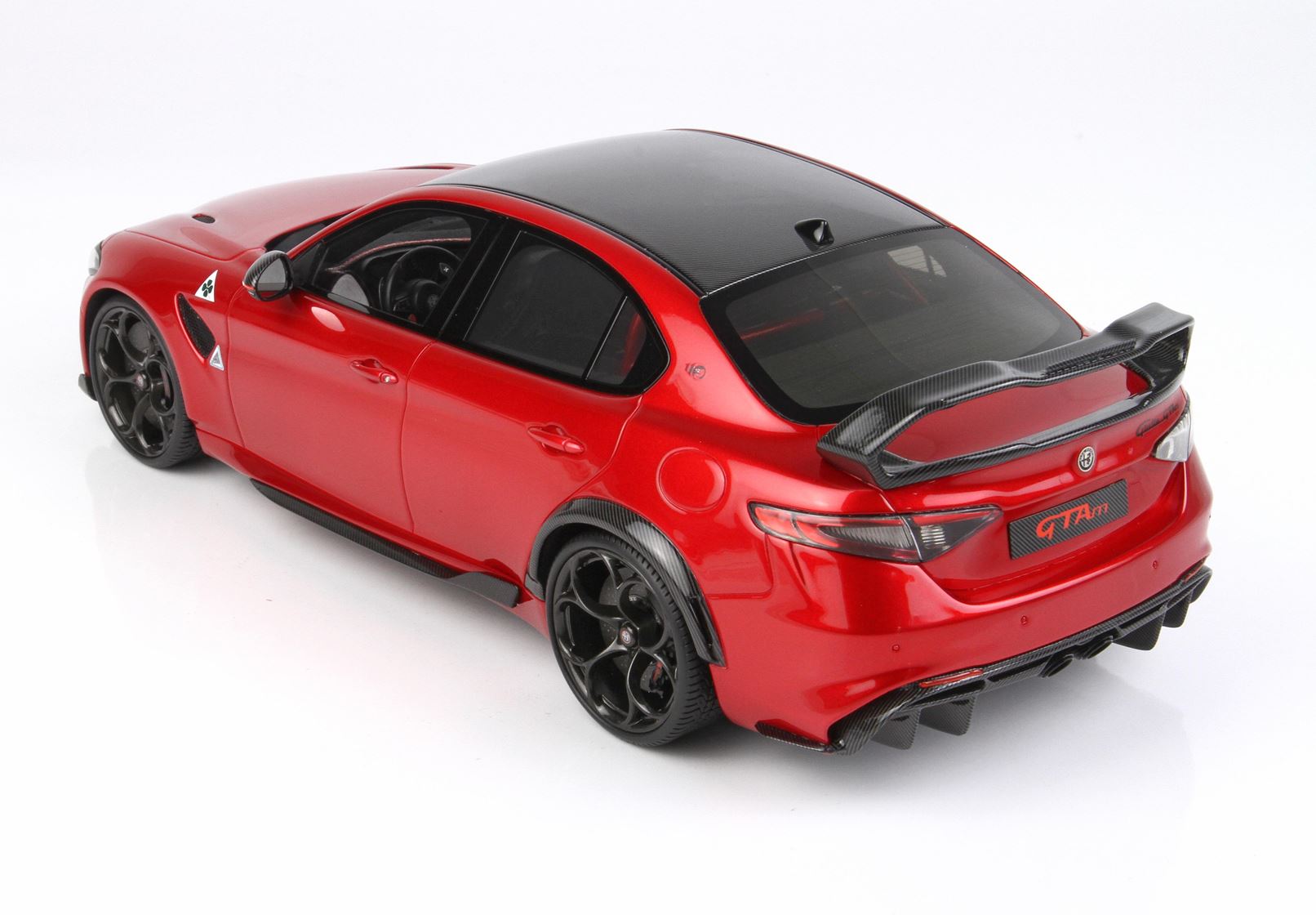 la GTAm: la variante più spinta dell’attuale gamma del Biscione, oltre al frontale specifico con splitter attivo e all’ala posteriore di fibra di carbonio, è caratterizzata da diverse soluzioni derivate dal mondo delle competizioni. La Giulia GTAm è caratterizzata dalla presenza di due soli sedili: il divano posteriore è stato sostituito da un roll bar, sotto il quale sono stati ricavati degli alloggiamenti per due caschi e un estintore.