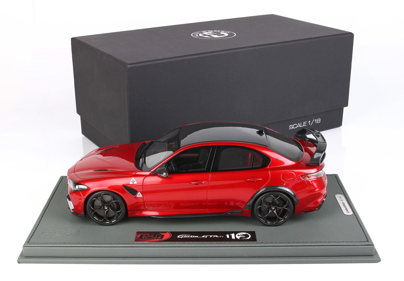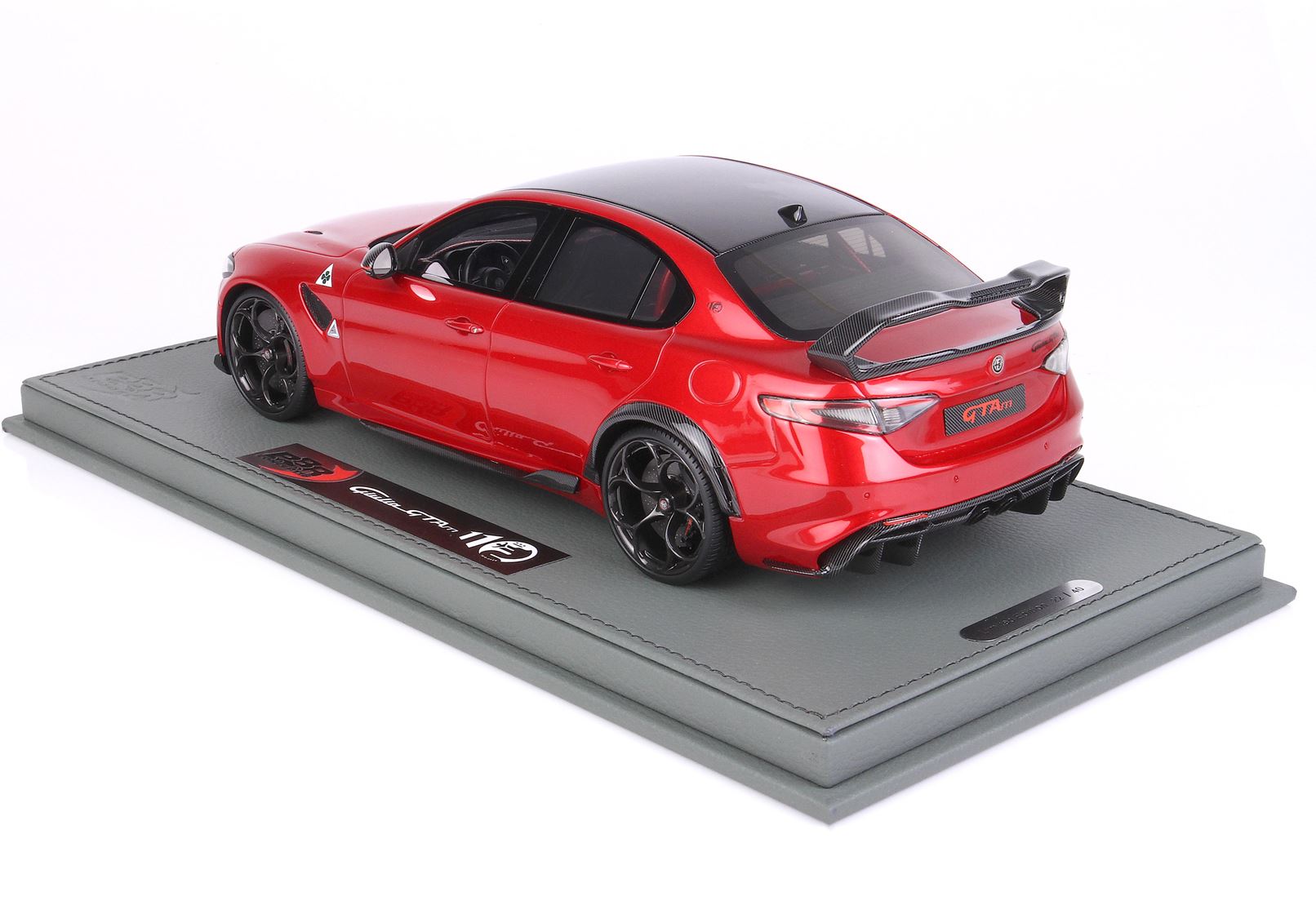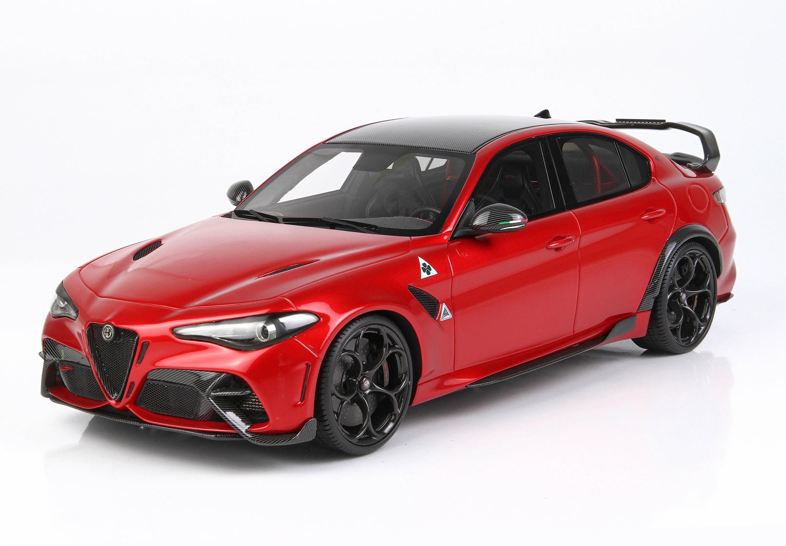 la GTAm: la variante più spinta dell’attuale gamma del Biscione, oltre al frontale specifico con splitter attivo e all’ala posteriore di fibra di carbonio, è caratterizzata da diverse soluzioni derivate dal mondo delle competizioni. La Giulia GTAm è caratterizzata dalla presenza di due soli sedili: il divano posteriore è stato sostituito da un roll bar, sotto il quale sono stati ricavati degli alloggiamenti per due caschi e un estintore.