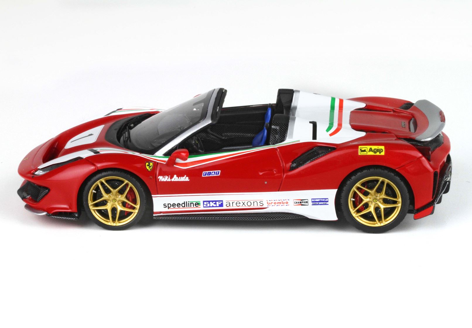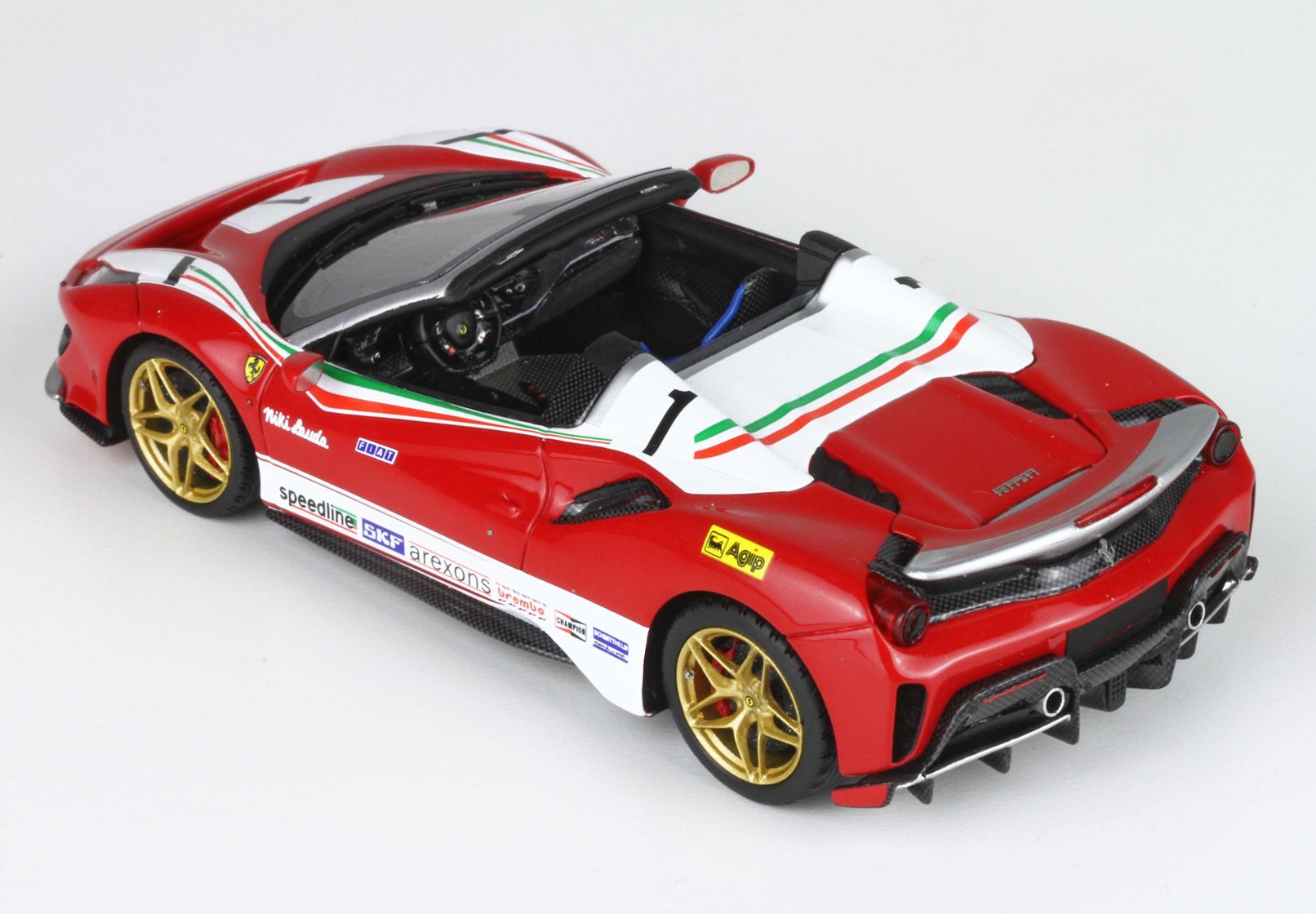 L’auto di Maranello, in strada con immatricolazione e con targa tedesca, è stata colorata di bianco e rosso, con profili tricolore, aggiungendo tutti gli adesivi e le scritte degli sponsor Ferrari F1 nel 1976. Con tanto di nome pilota in corsivo accostato a quella scritta Fiat, che iniziava a caratterizzare proprio da quei tempi le monoposto Ferrari. I cerchi, ovviamente in energica tinta bronzo.