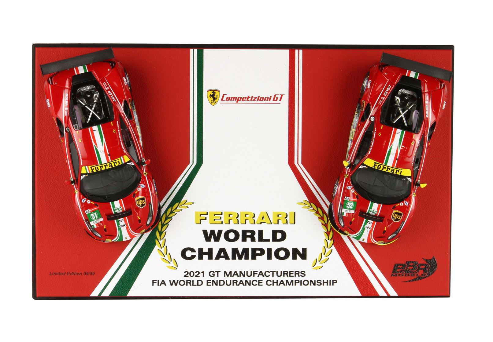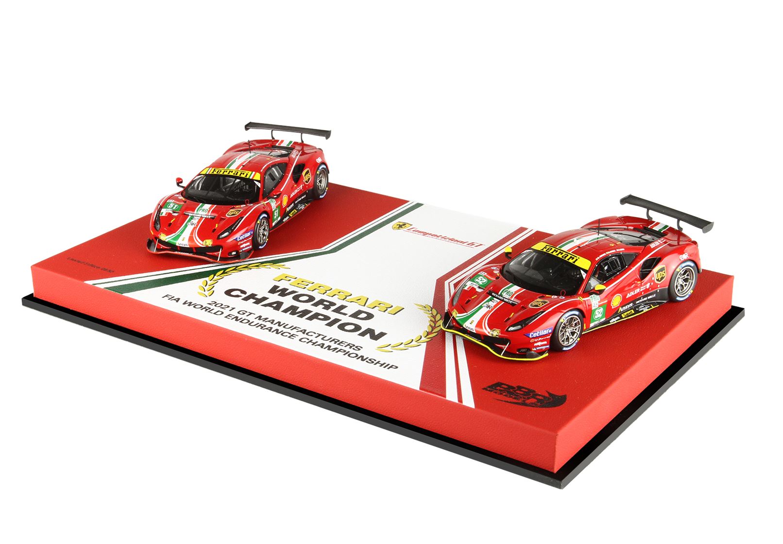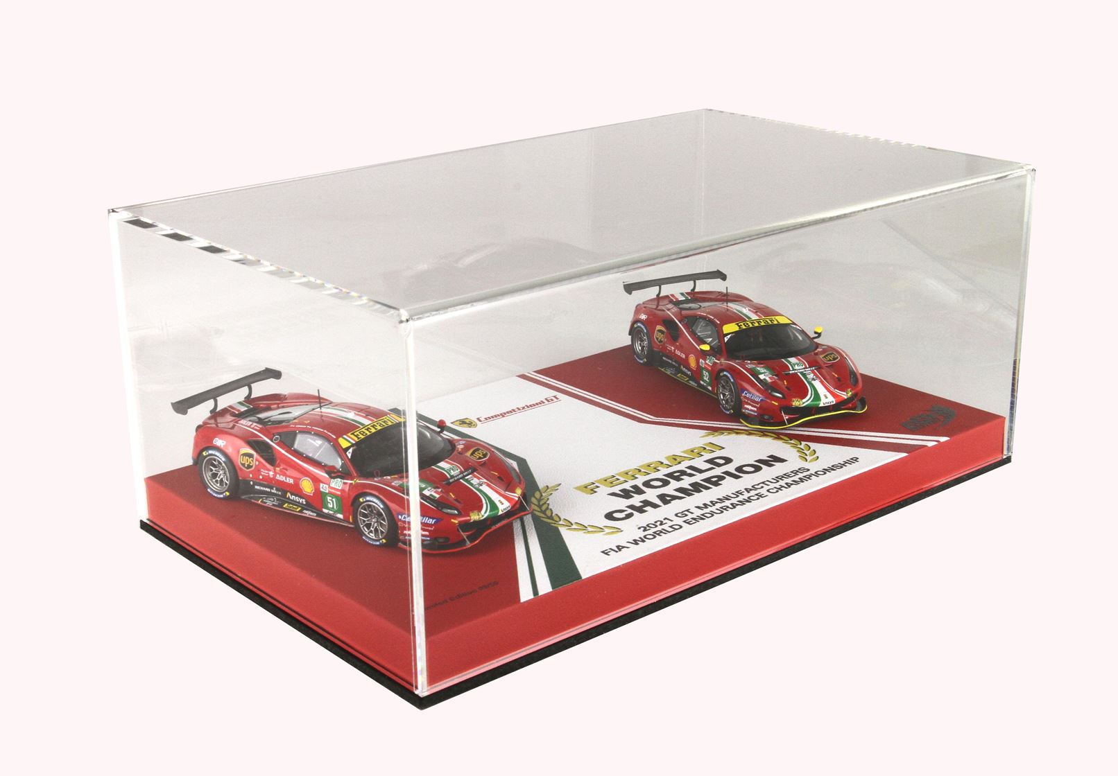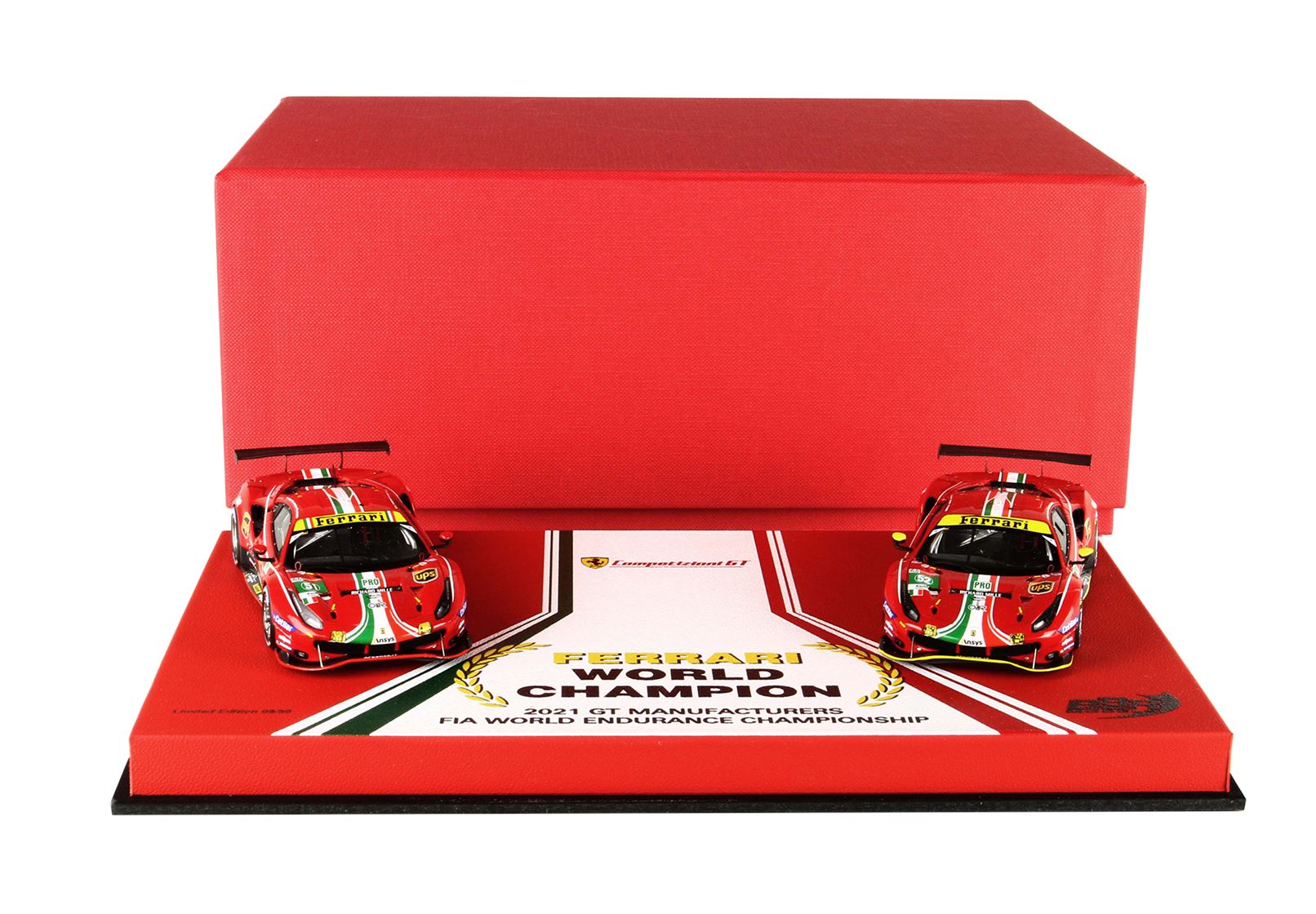 Cofanetto commemorativo con le due 488 GTE, confezione speciale con base in vera pelle e vetrinetta, solo 50 pezzi prodotti in serie limitata e numerata.