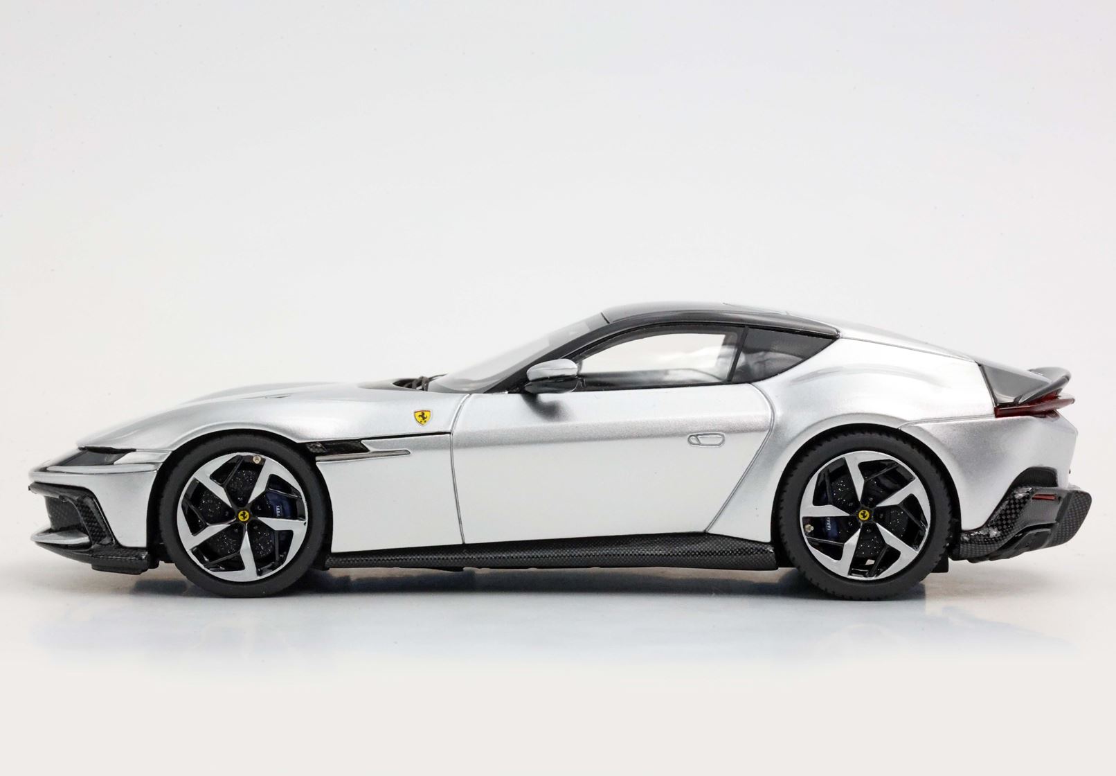 Le linee essenziali sono rese muscolari dai parafanghi. Quello posteriore prominente ma senza eccessi, è perfettamente integrato nella geometria dell'auto. Quello anteriore, con evidente richiamo alla 365GTB Daytona, mostra il suo fascino sinuoso impreziosendo la fiancata. Nel frontale, un'unica fascia avvolgente integra i fari e i DRL come due lame di luce. Proporzioni perfette per una GT: muso lunghissimo, abitacolo compatto e retro corto.