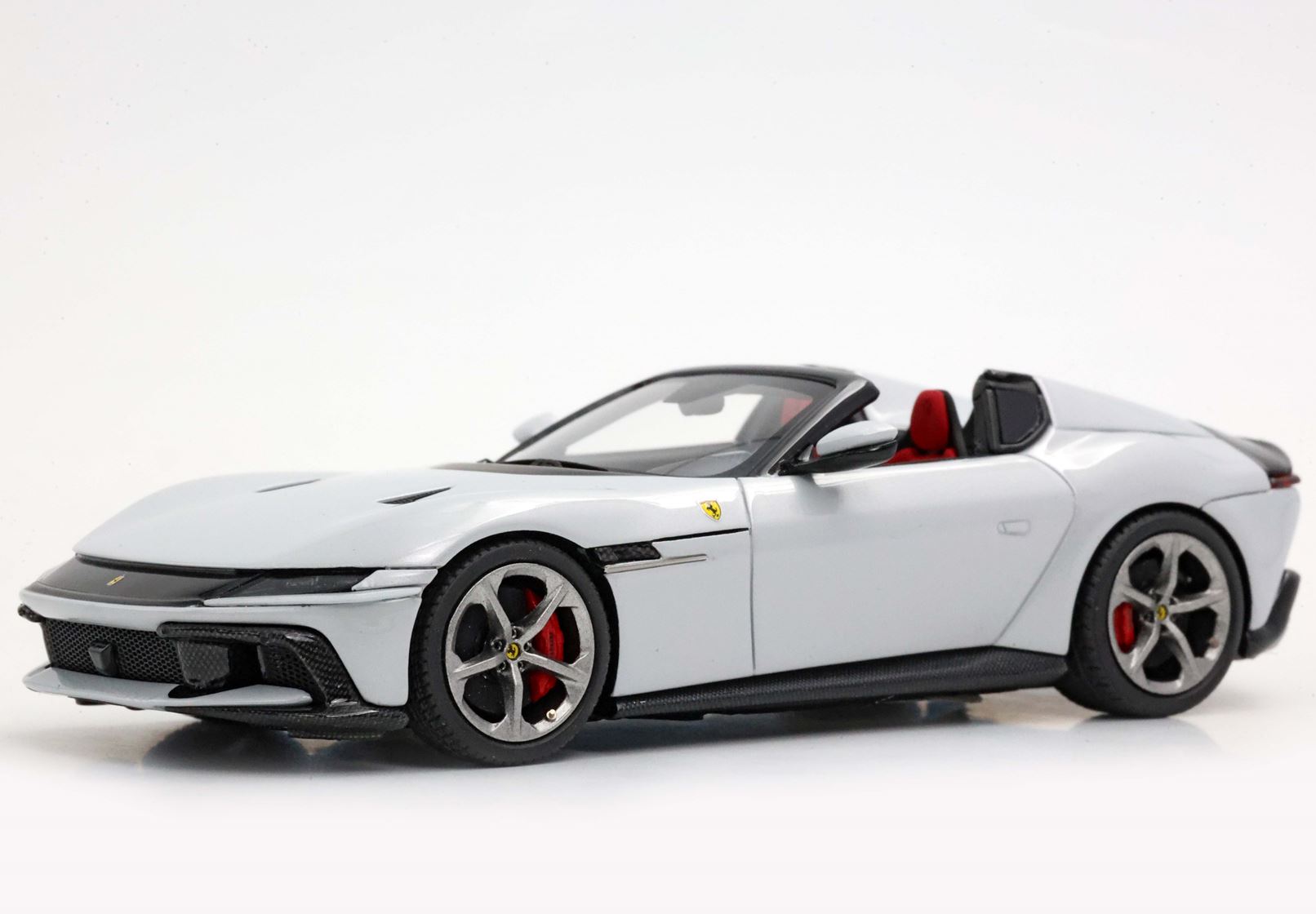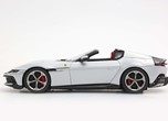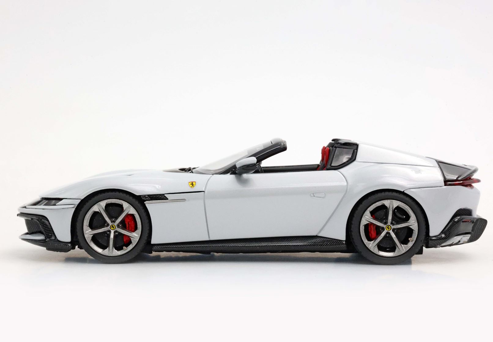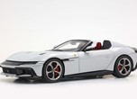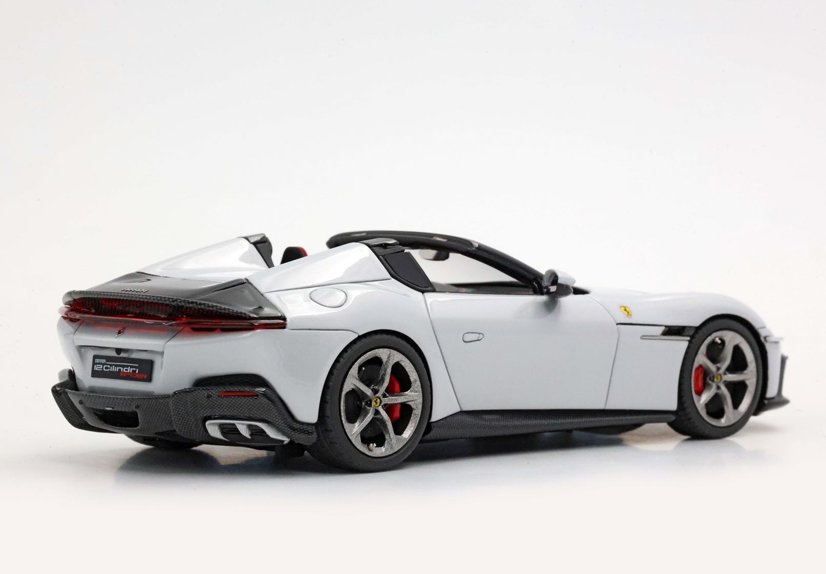 Le forme marcate delle due "pinne" posteriori costituiscono il carattere principale della Ferrari 12Cilindri Spider. Le linee essenziali sono rese muscolari dai parafanghi. Quello posteriore prominente ma senza eccessi, è perfettamente integrato nella geometria dell'auto. Quello anteriore, con evidente richiamo alla 365GTB Daytona, mostra il suo fascino sinuoso impreziosendo la fiancata. Nel frontale, un'unica fascia avvolgente integra i fari e i DRL come due lame di luce. Proporzioni perfette per una GT: muso lunghissimo, abitacolo compatto e retro corto.