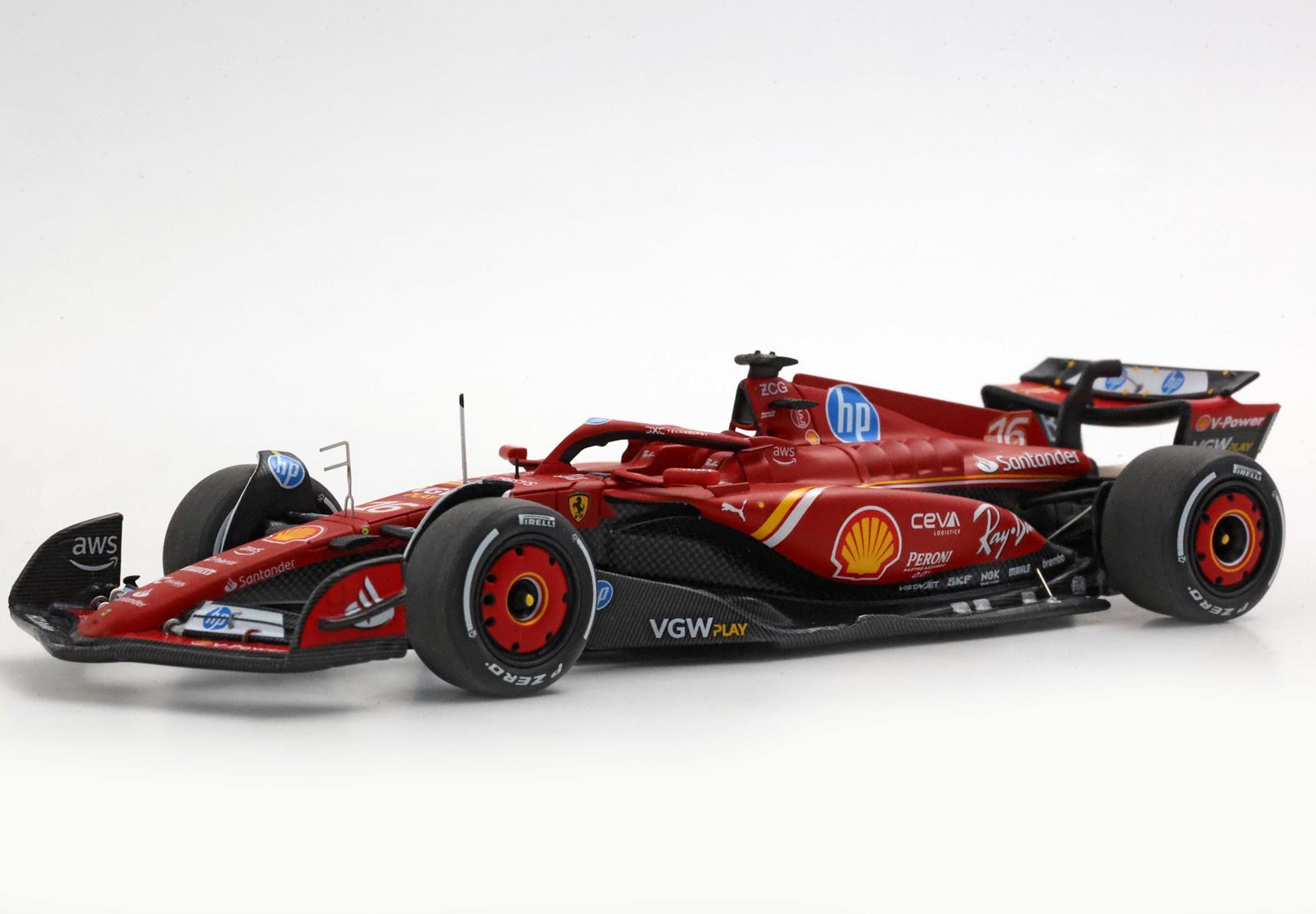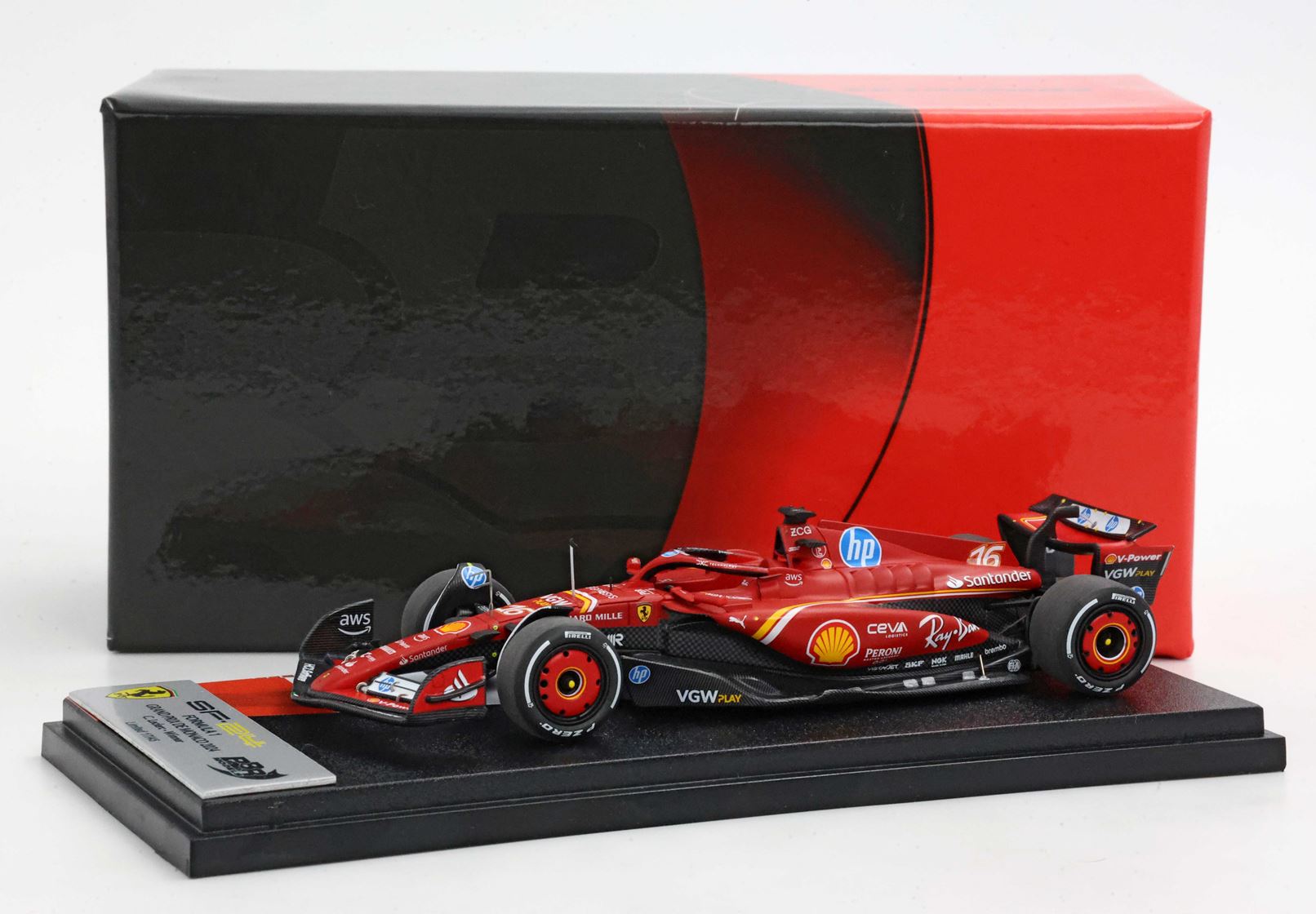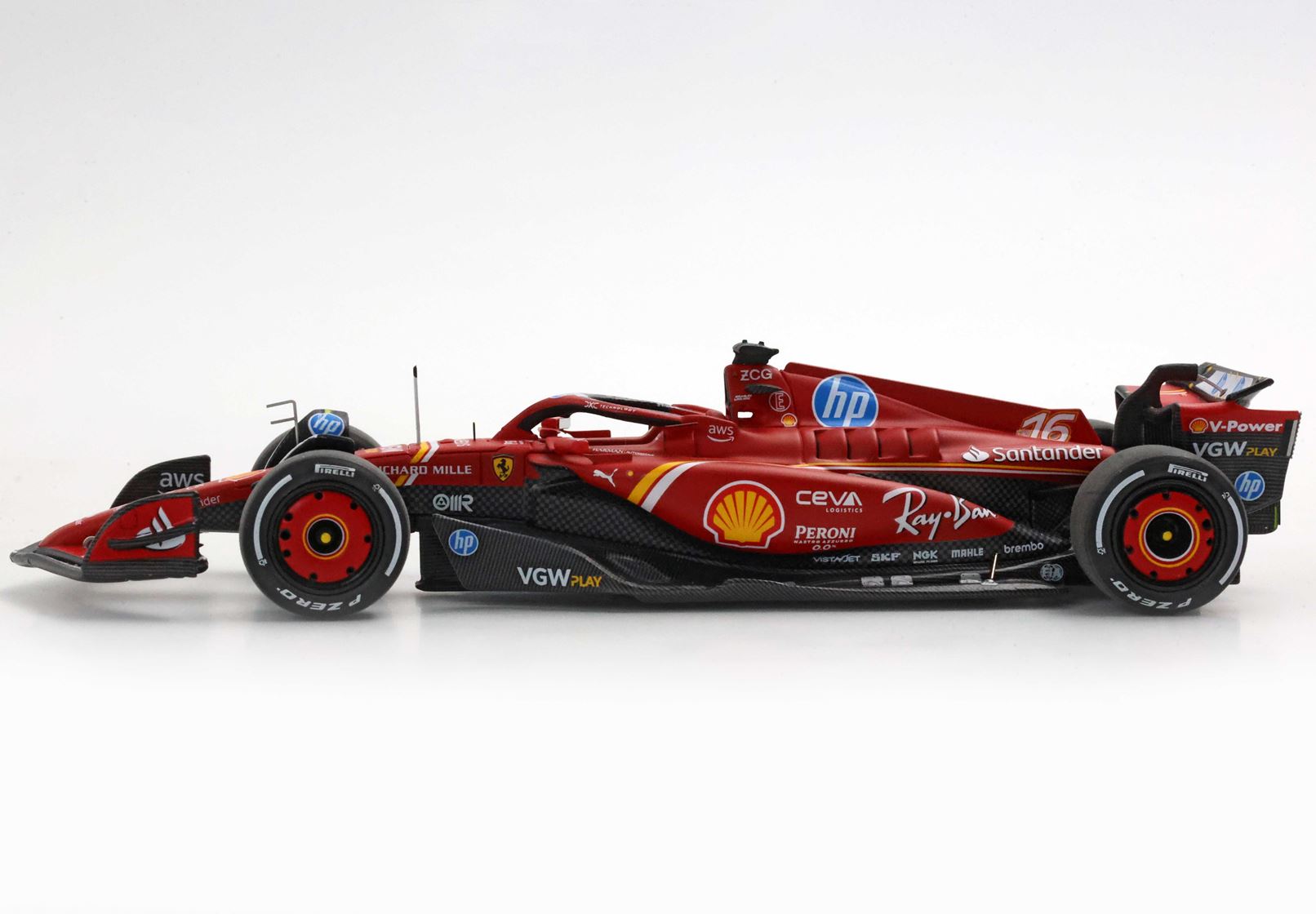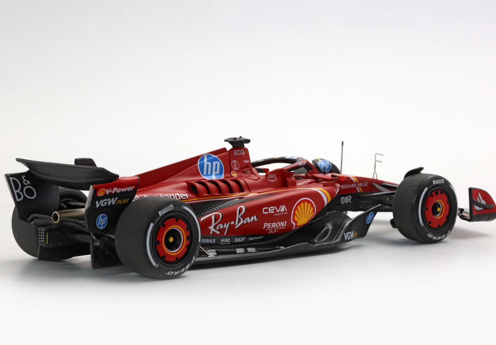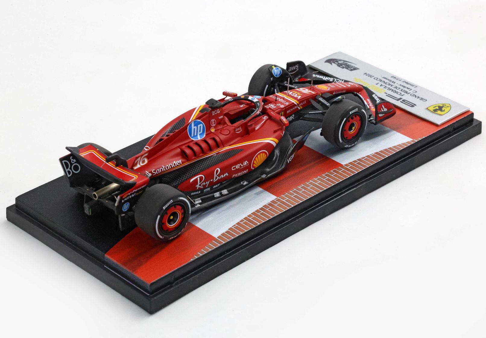 In esclusiva BBR propone un automodello in scala 1/43, replica della SF24 di Leclerc su una delle più note curve del circuito di Montecarlo. Ben evidente sulla base il cordolo e i mattoncini che contornano il circuito stradale monegasco.