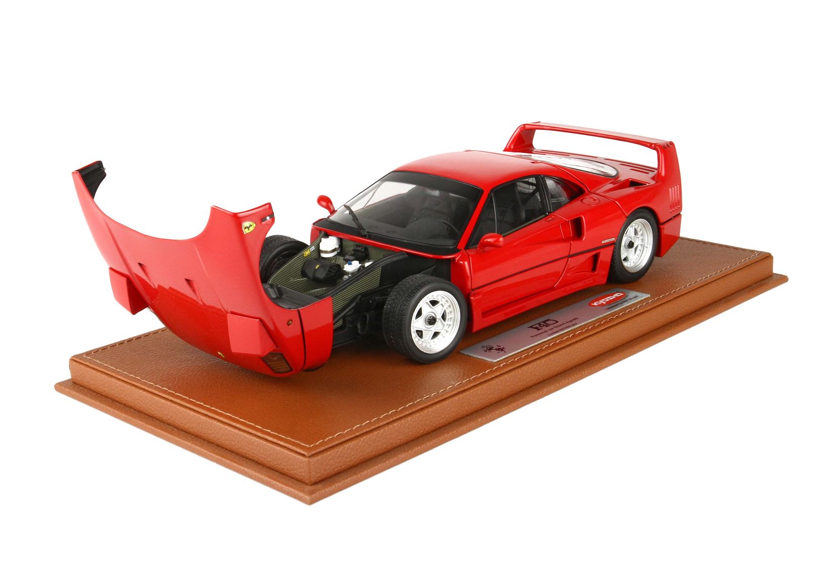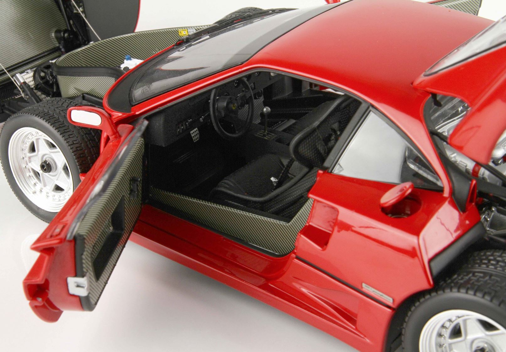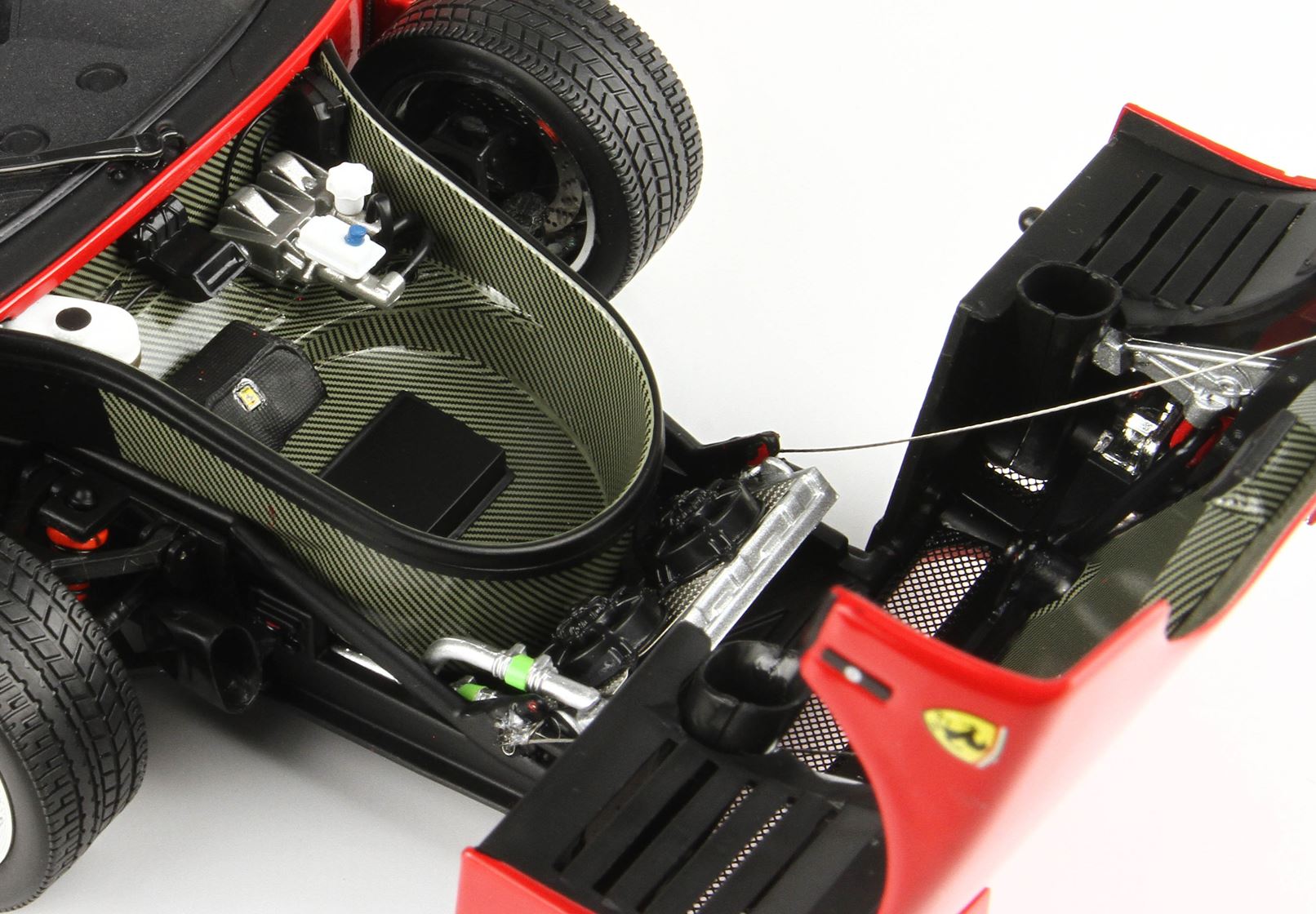 La Ferrari dava la disponibilità dell’auto in un’unica colorazione, il rosso, sia per l’interno che per l’esterno, come da tradizione del Cavallino rampante. Per volere di Enzo Ferrari l’auto fu spartana negli interni – doveva essere un ritorno alle origini come le vecchie auto da corsa – con vetri manuali e sportelli che si aprivano grazie ad un tirante posizionato all’interno della portiera, e l’unica concessione a livello di confort fu l’aria condizionata. Questa scelta di rendere l’auto completamente spartana con i pannelli interni non verniciati o avvolti di pelle, unite alle pedaliere di acciaio forato ed ad un semplice volante in pelle a 3 razze.