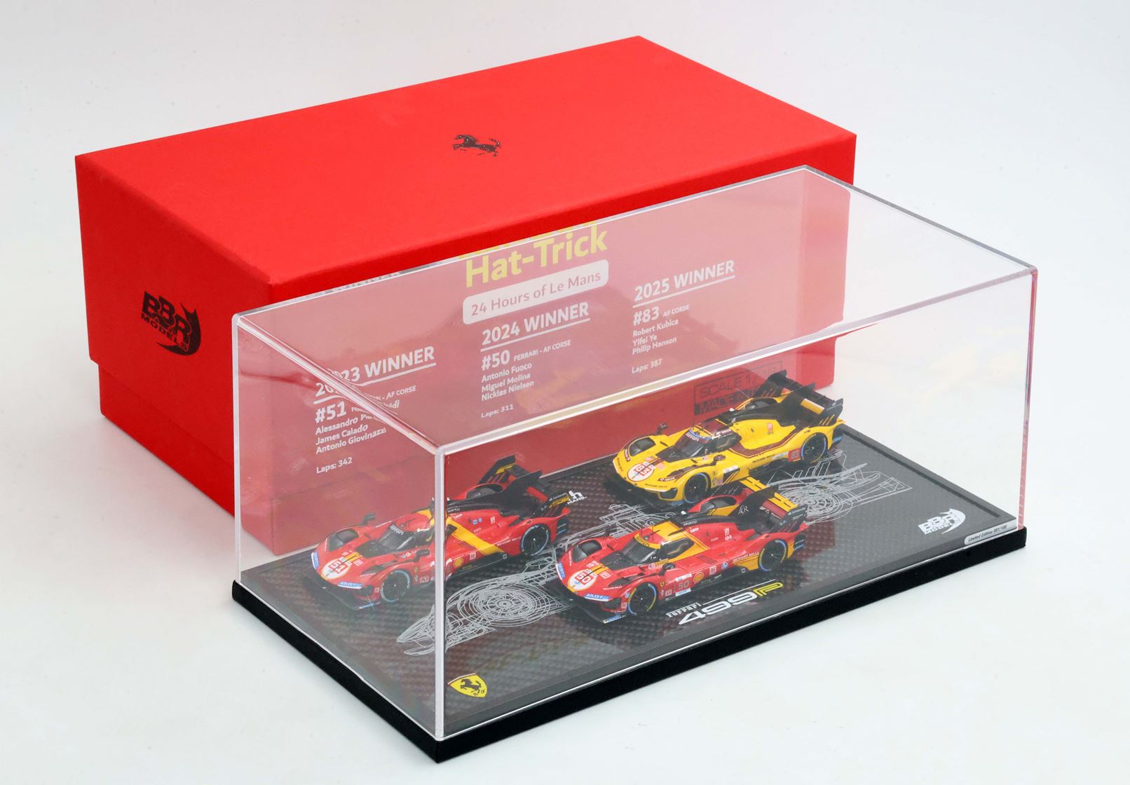Esclusivo cofanetto per celebrare la tripletta di Ferrari alla 24 ore di Le Mans, replica delle tre vetture 2023-2024-2025.