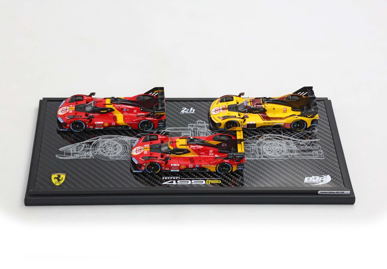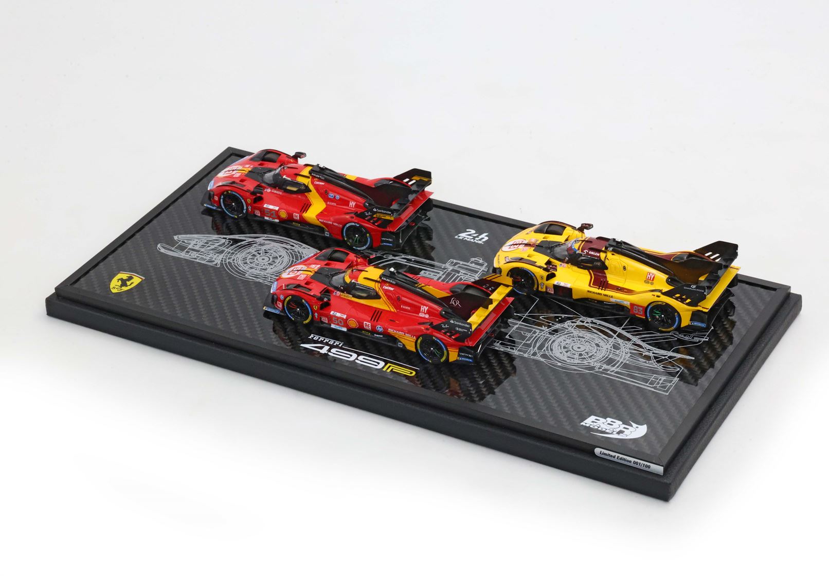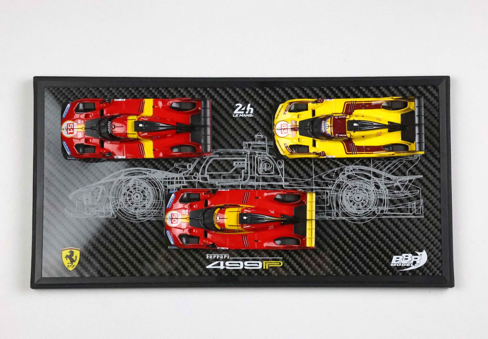 Base in vero Carbonio con disegno originale della 499P stampato e realizzato nel laboratorio italiano BBR. Vetrina Stampata con i nomi dei piloti di queste tre edizioni gloriose, per un vero e proprio pezzo da collezione.