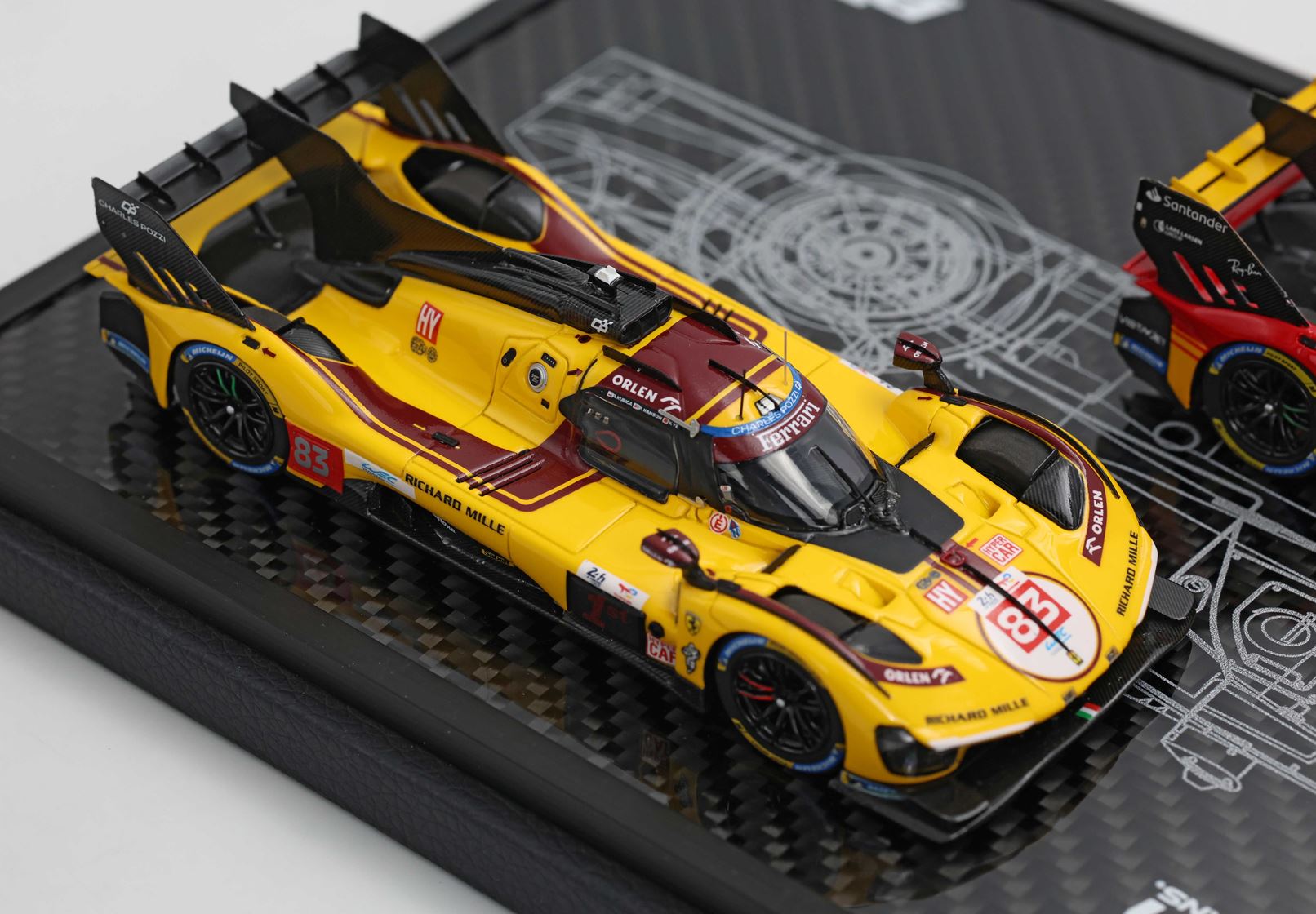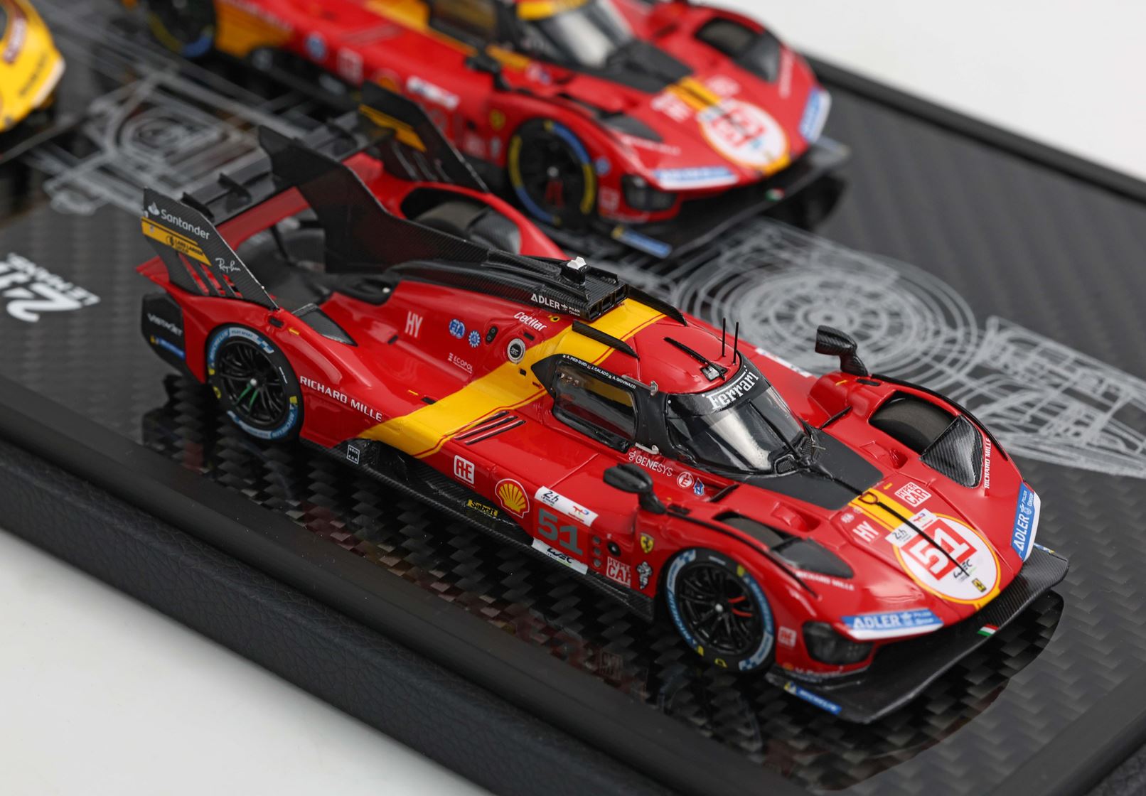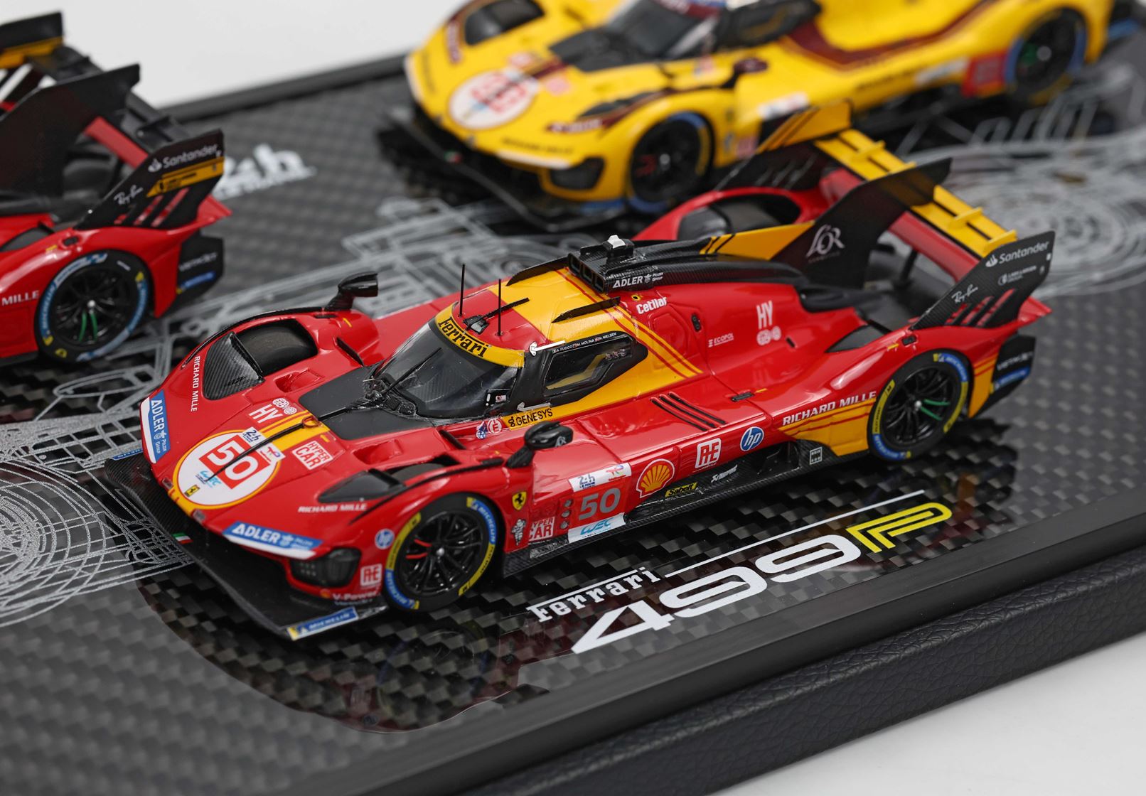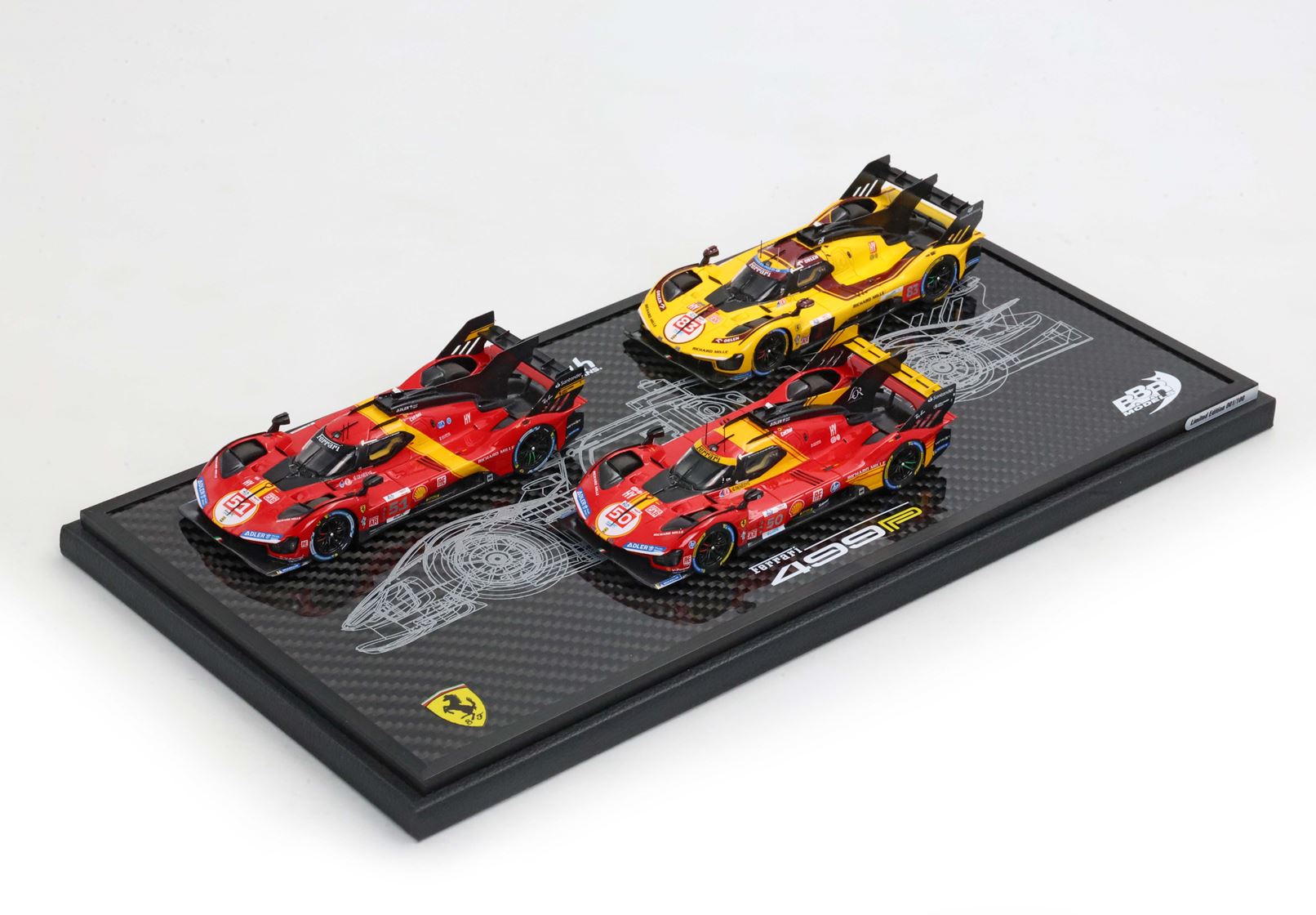 Base in vero Carbonio con disegno originale della 499P stampato e realizzato nel laboratorio italiano BBR. Vetrina Stampata con i nomi dei piloti di queste tre edizioni gloriose, per un vero e proprio pezzo da collezione.