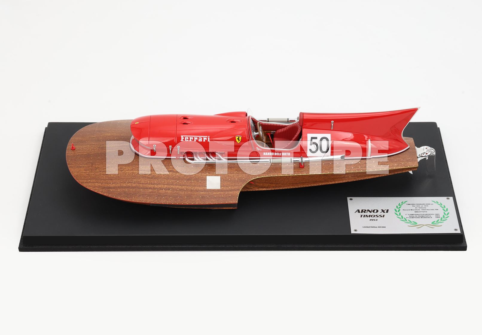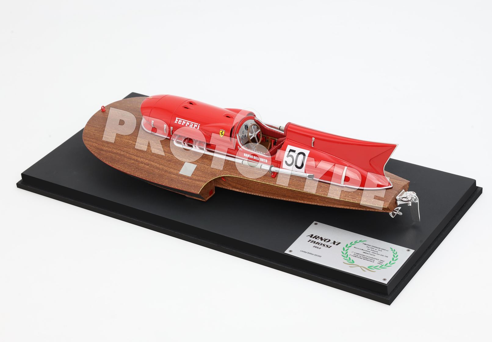 L'Arno XI, un'icona di potenza e velocità, è un idroplano da record costruito nel 1953 dai Cantieri Timossi per Achille Castoldi. Questo gioiello della motonautica è spinto da un motore Ferrari V12 da 4.5 litri, lo stesso utilizzato sulla Ferrari 375 di Formula 1, potenziato con due compressori volumetrici. Il 15 ottobre 1953, sulle acque del Lago d'Iseo, Castoldi stabilì un record mondiale di velocità per idroplani a motore, raggiungendo i 242,708 km/h. Record ancora imbattuto.