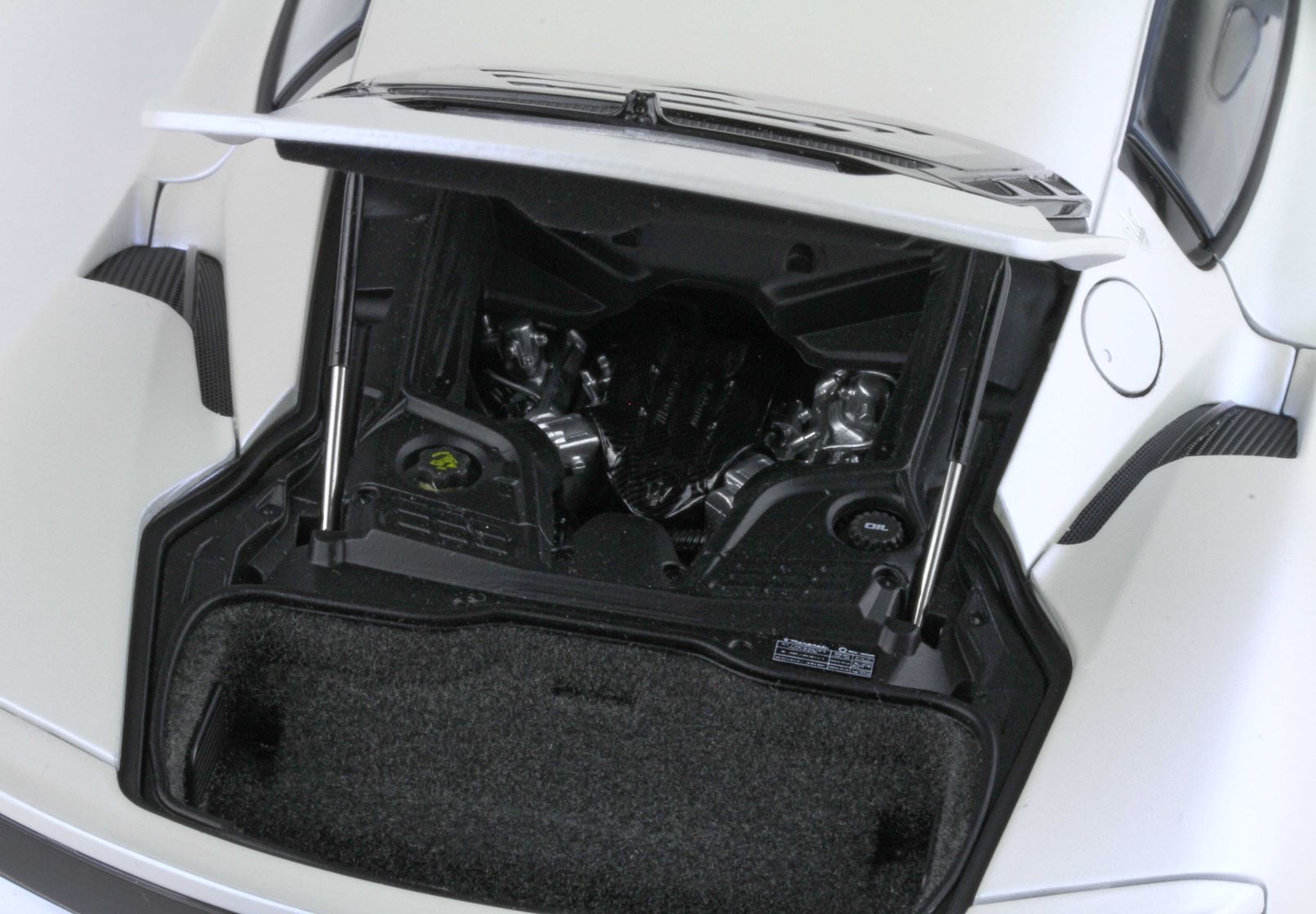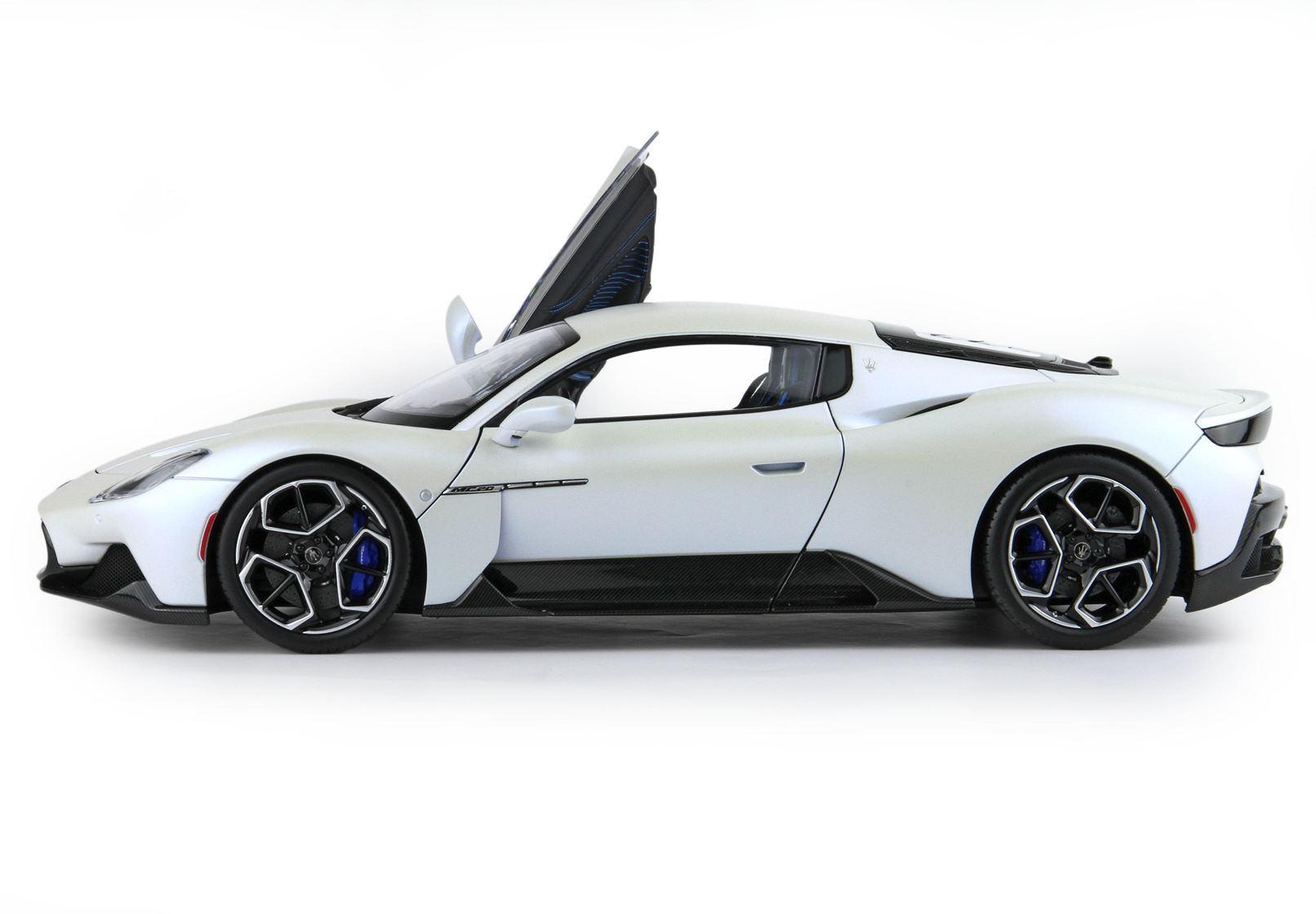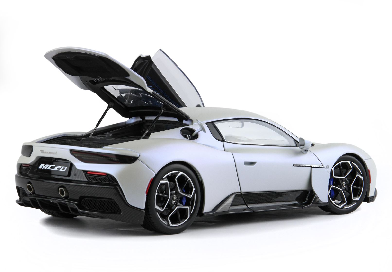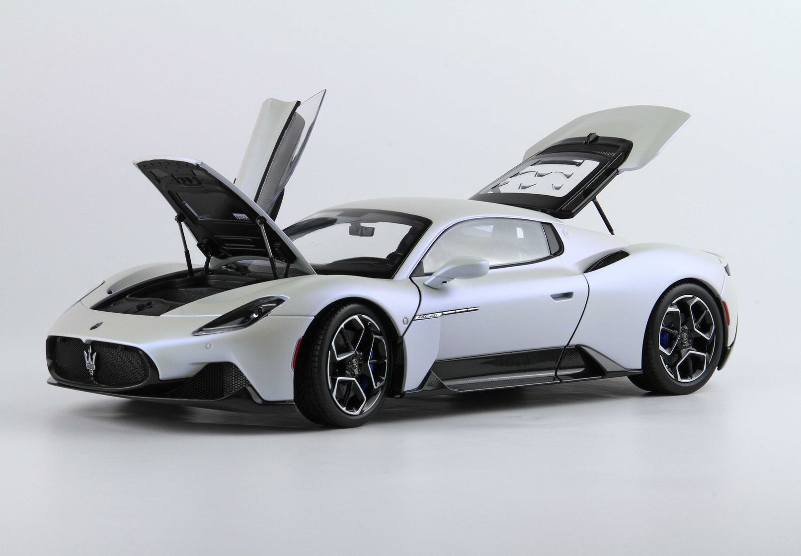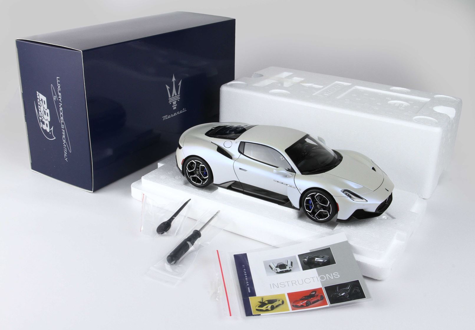 Questo modello Die-Cast di questa fantastica vettura è tutto apribile, dalle portiere al tappo della benzina. Un assemblaggio minuzioso di più di 800 componenti che ha visto fianco a fianco il team BBR e Maserati.