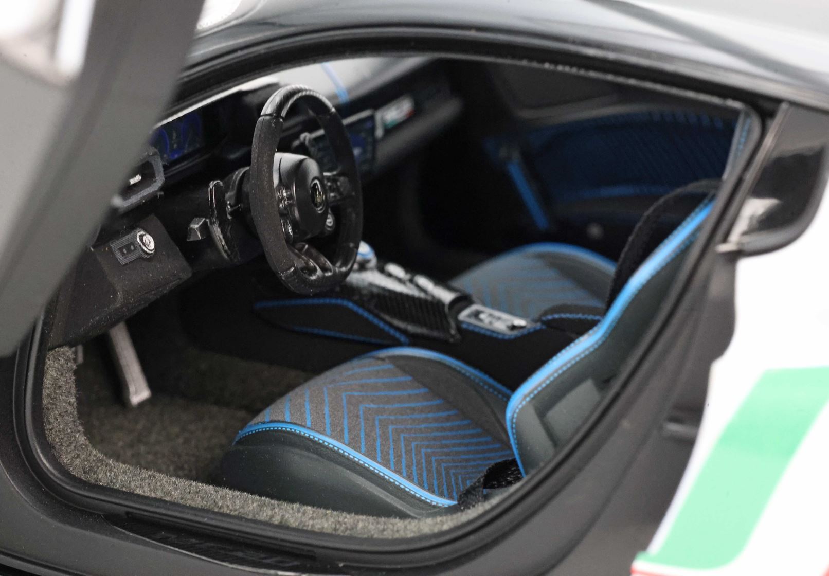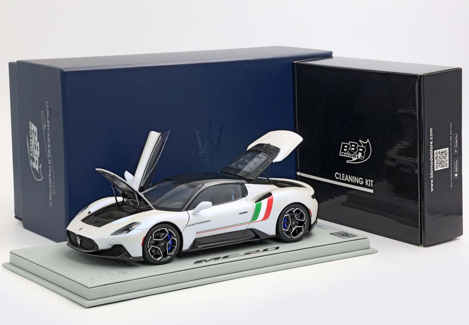 BBR propone un modello Die-Cast, completamente apribile. Il cofano del bagagliaio anteriore e il vano motore sono dotati di cerniere ma anche di pistoni oleodinamici che permettono l'apertura e soprattutto la chiusura con delicatezza. Ben visibile sulla livrea la bandiera italiana sul colore di base Bianco Audace.