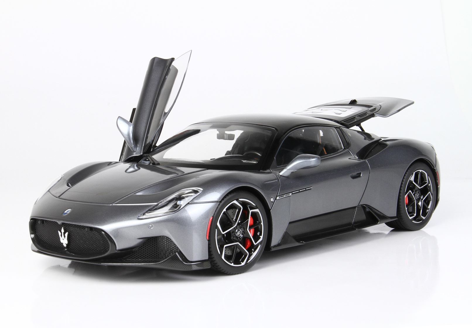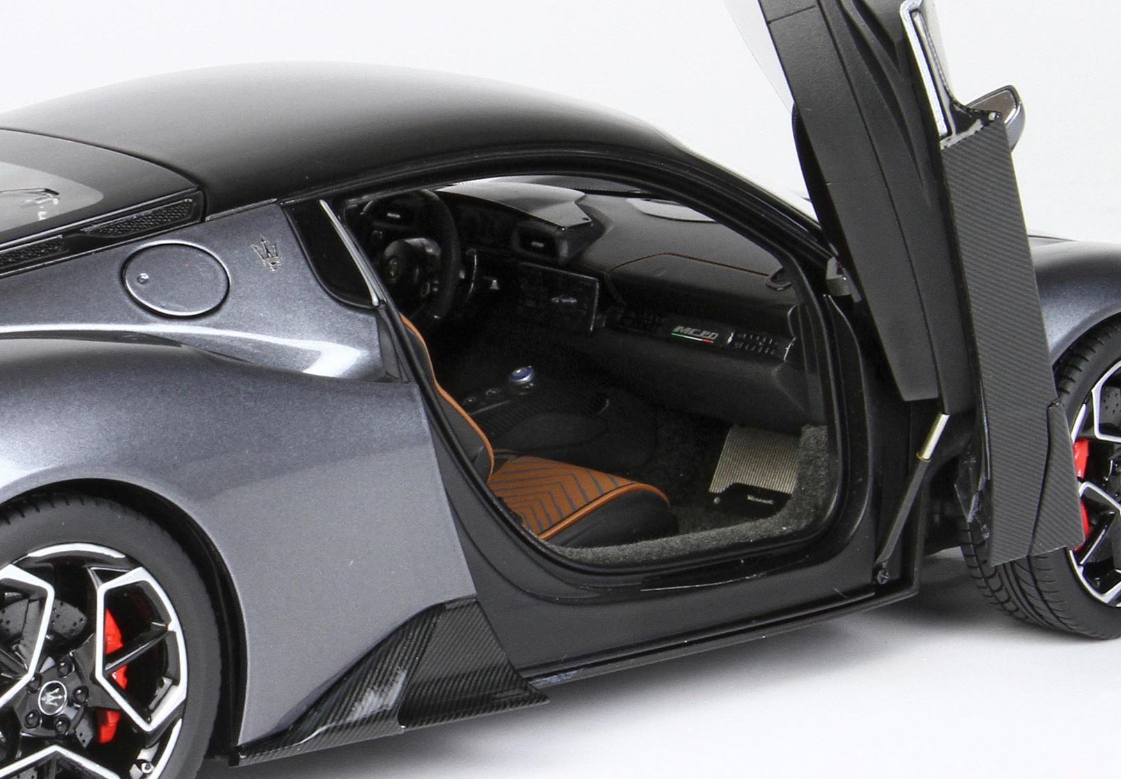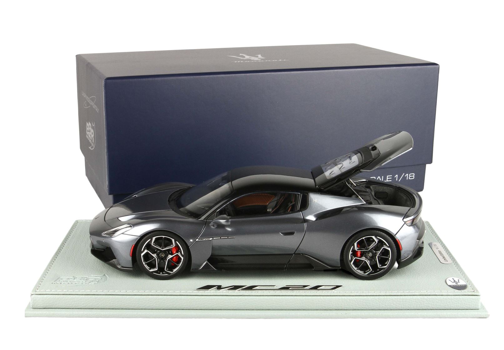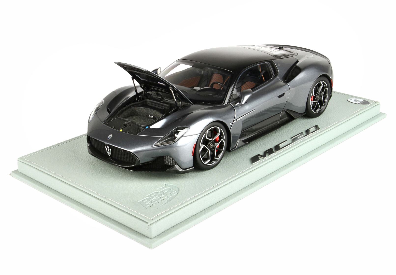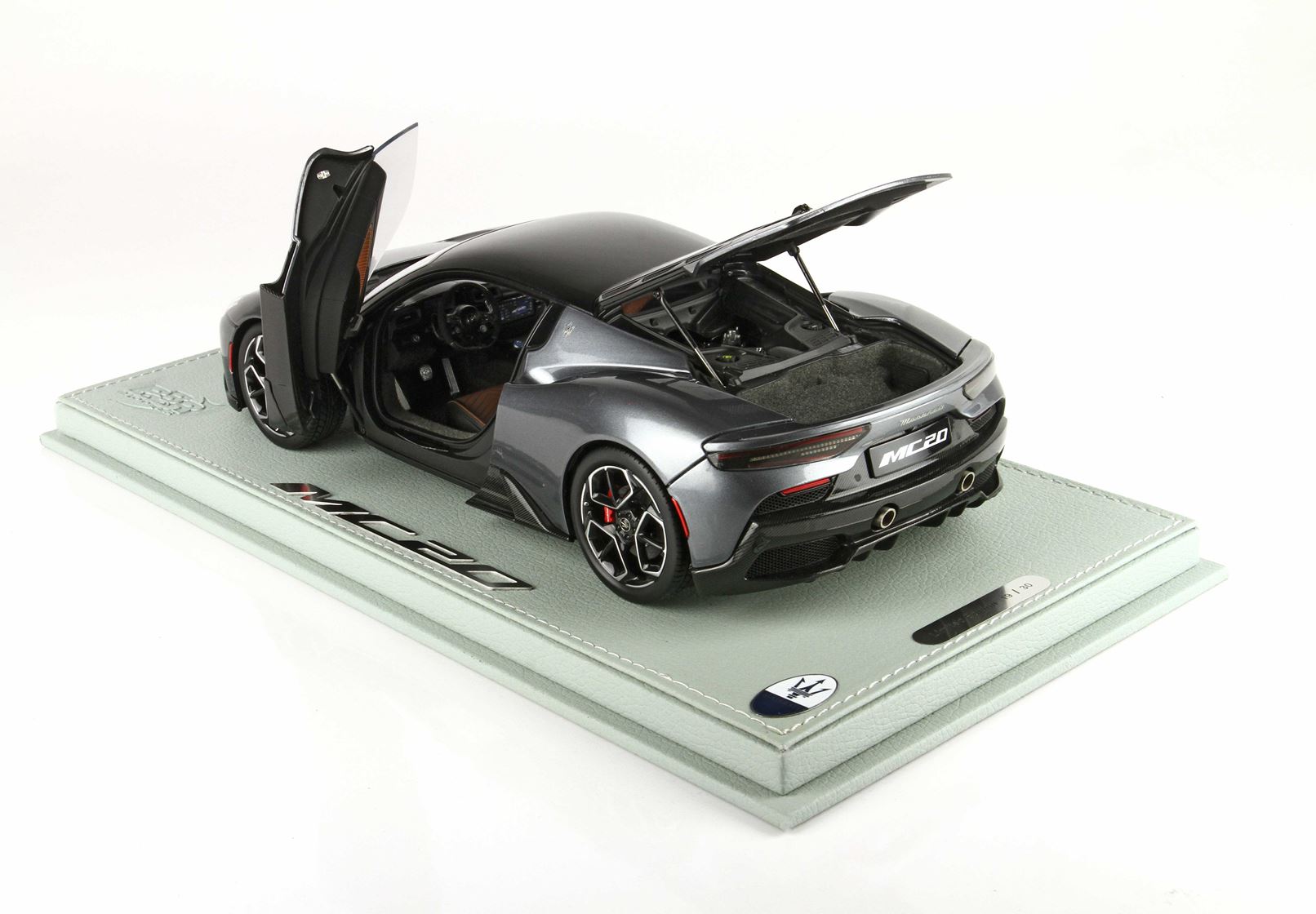 Automodello confezionato su base in ecopelle, logo ufficiale Maserati MC20 in acciaio, vetrina in plexiglass assemblata a mano.