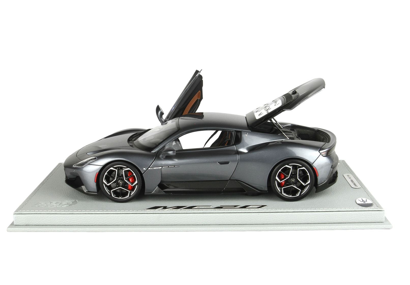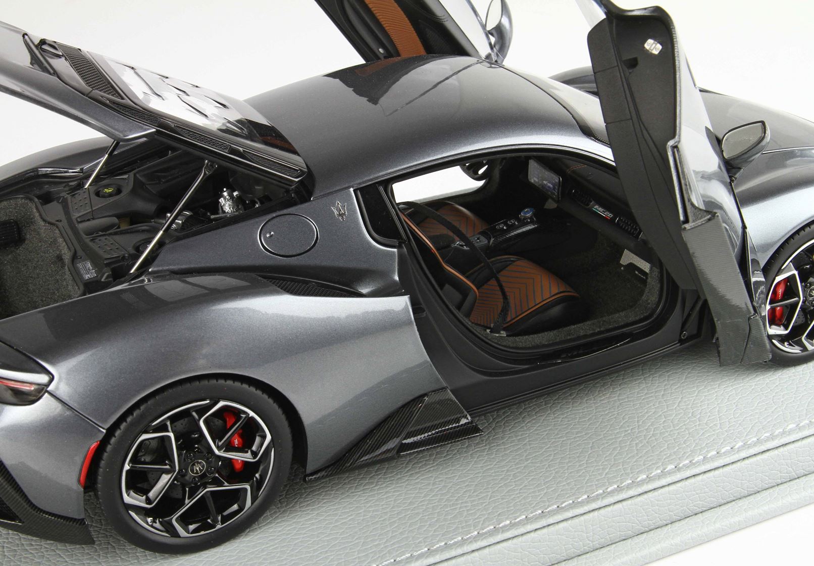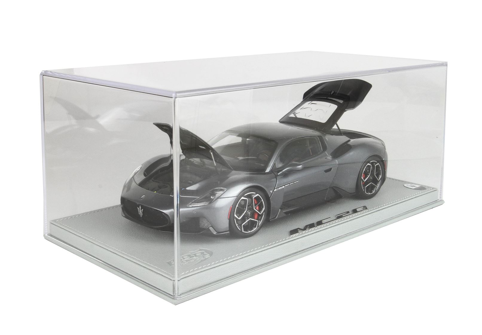 Automodello confezionato su base in ecopelle, logo ufficiale Maserati MC20 in acciaio, vetrina in plexiglass assemblata a mano.