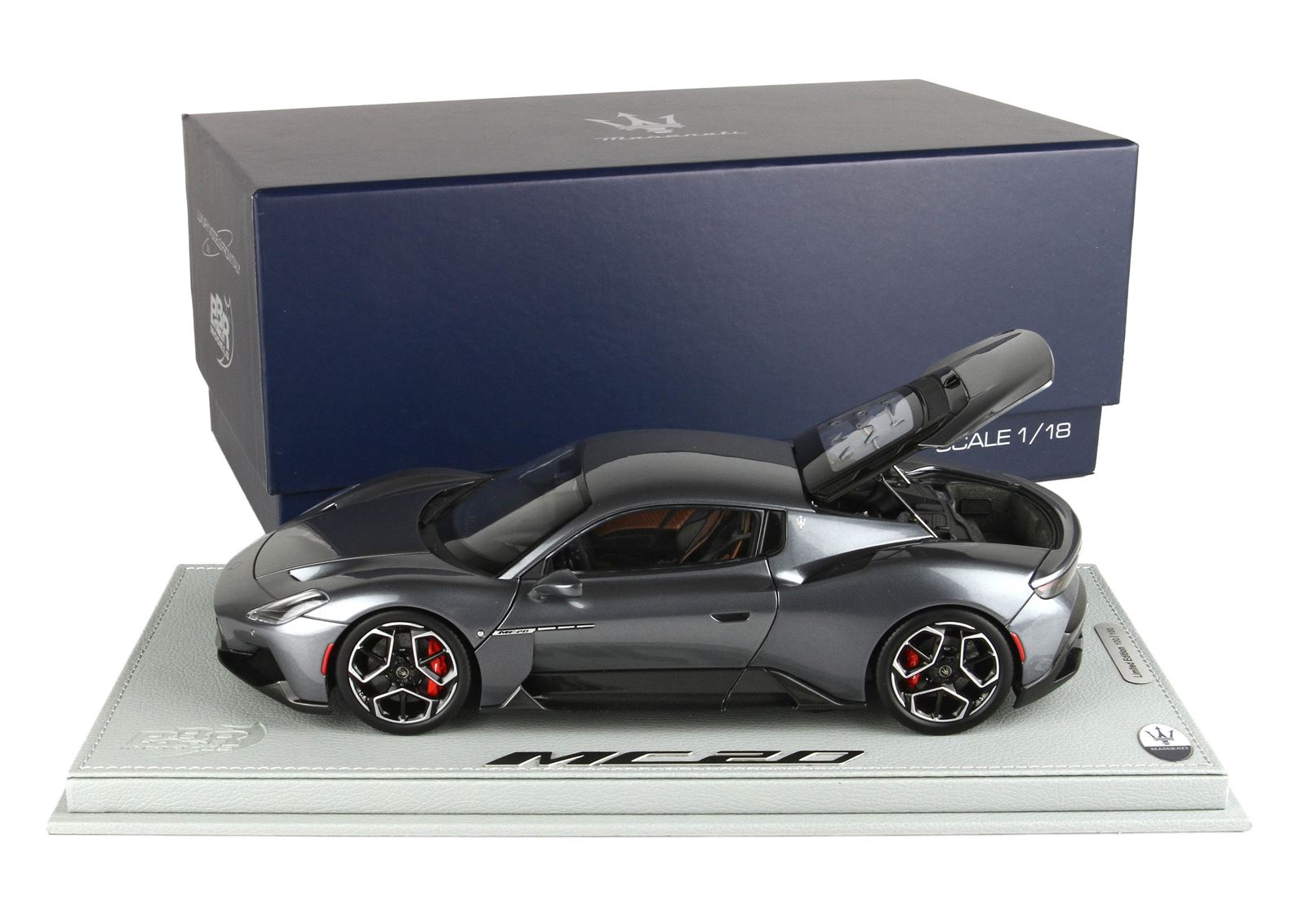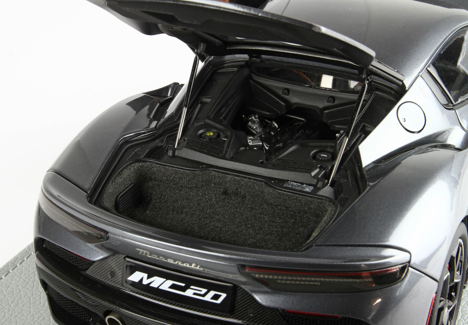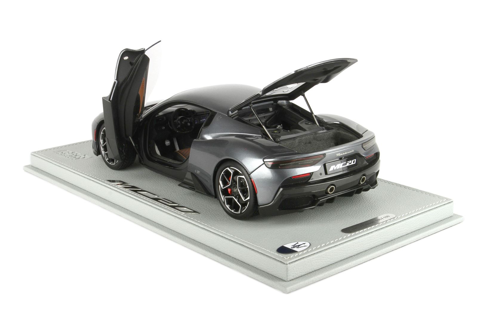 Automodello confezionato su base in ecopelle, logo ufficiale Maserati MC20 in acciaio, vetrina in plexiglass assemblata a mano.