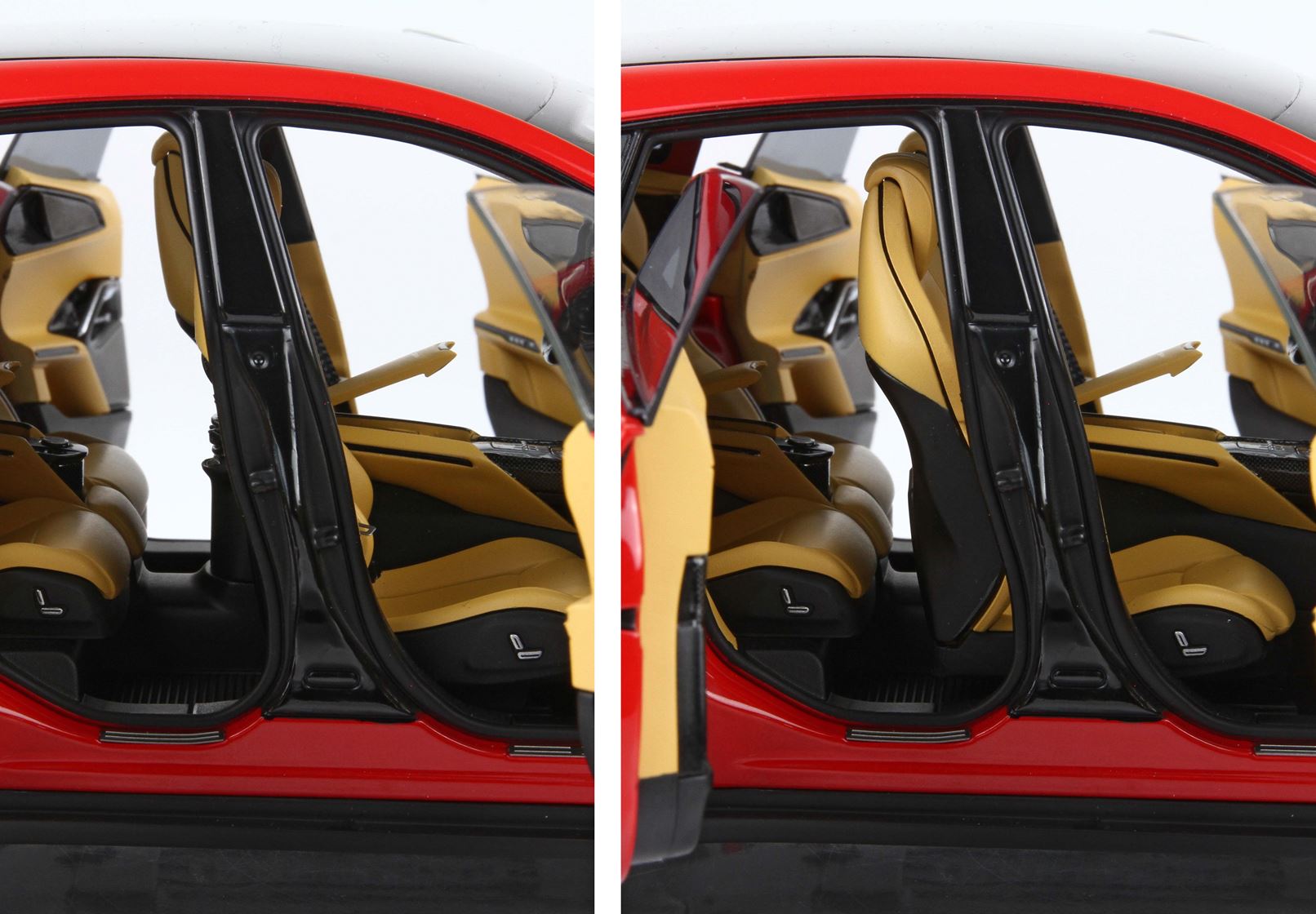 Esclusiva mondiale di Purosangue in scala 1/18 diecast completamente apribile. Rendono unico il modello firmato BBR, una fedele riproduzione dell’aperture di porte e cofani (tramite pistoncini telescopici) ma anche la possibilità di aprire braccioli interni e tappo benzina. Parti in metallo e abs si alternano a fotoincisioni e decals per un risultato di alta qualità. Quattro ruote realmente ammortizzate e sterzanti con due diversi tipi di cerchi: l’interruttore sul fondo permette inoltre di direzionare le ruote posteriori in direzione parallela o opposta. Tutto come nell'auto da strada ma racchiuso in pochi centimetri. Versione con tetto panoramico.