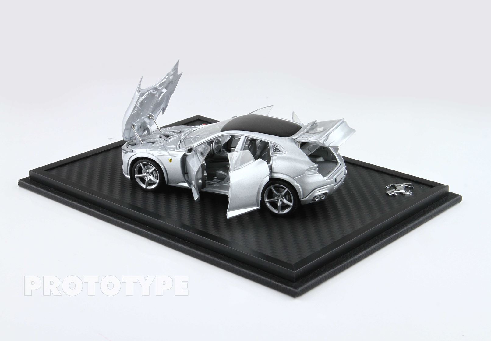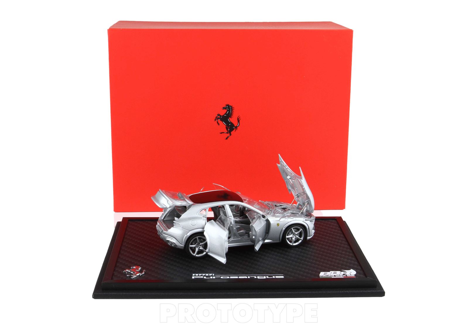 Esclusiva mondiale di Purosangue die-cast completamente apribile in scala 1/43. Rende unico il modello firmato BBR, la riproduzione fedele dell’apertura delle porte comprese quelle controvento posteriori che caratterizzano la prima quattro porte nella storia di Ferrari. Anche l’apertura del cofano anteriore consente di ammirare la miniatura del motore prodotto in ogni dettaglio. Aprendo il baule invece, si può vedere da vicino il lusso degli interni. Ben 105 parti in metallo e abs si alternano a fotoincisioni e decals per un risultato di alta qualità.