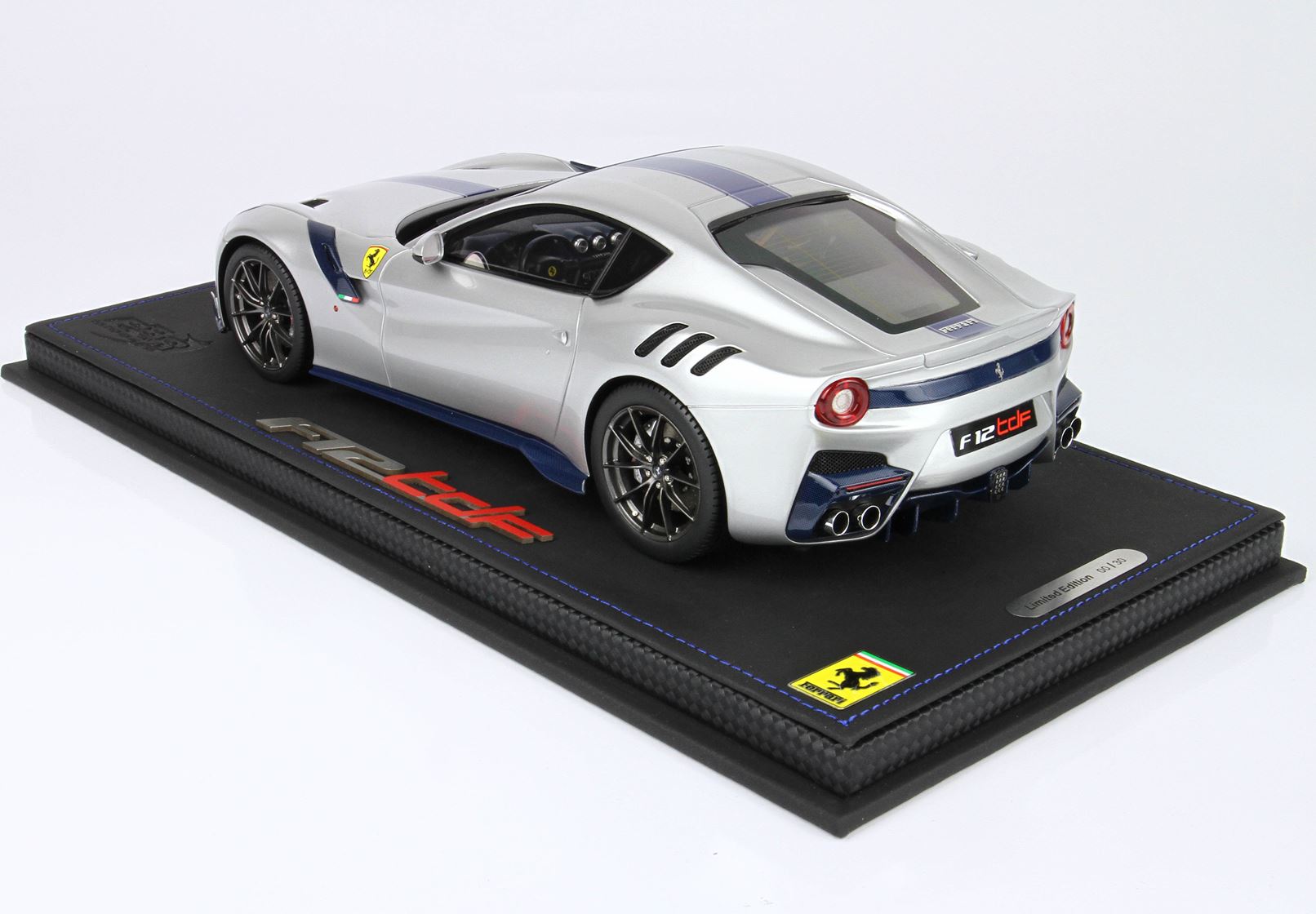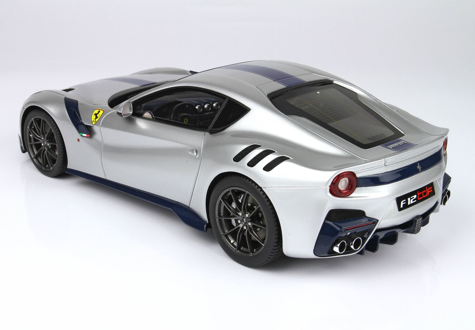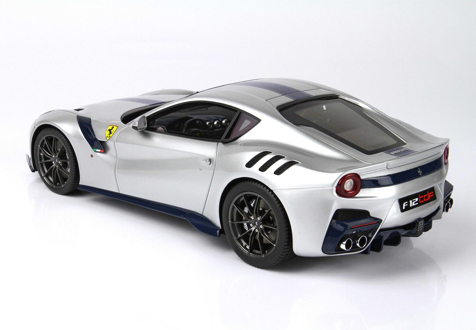Tutta la fibra di carbonio esterna è blu, scudetto Ferrari più grande, tubi scappamento cromati.