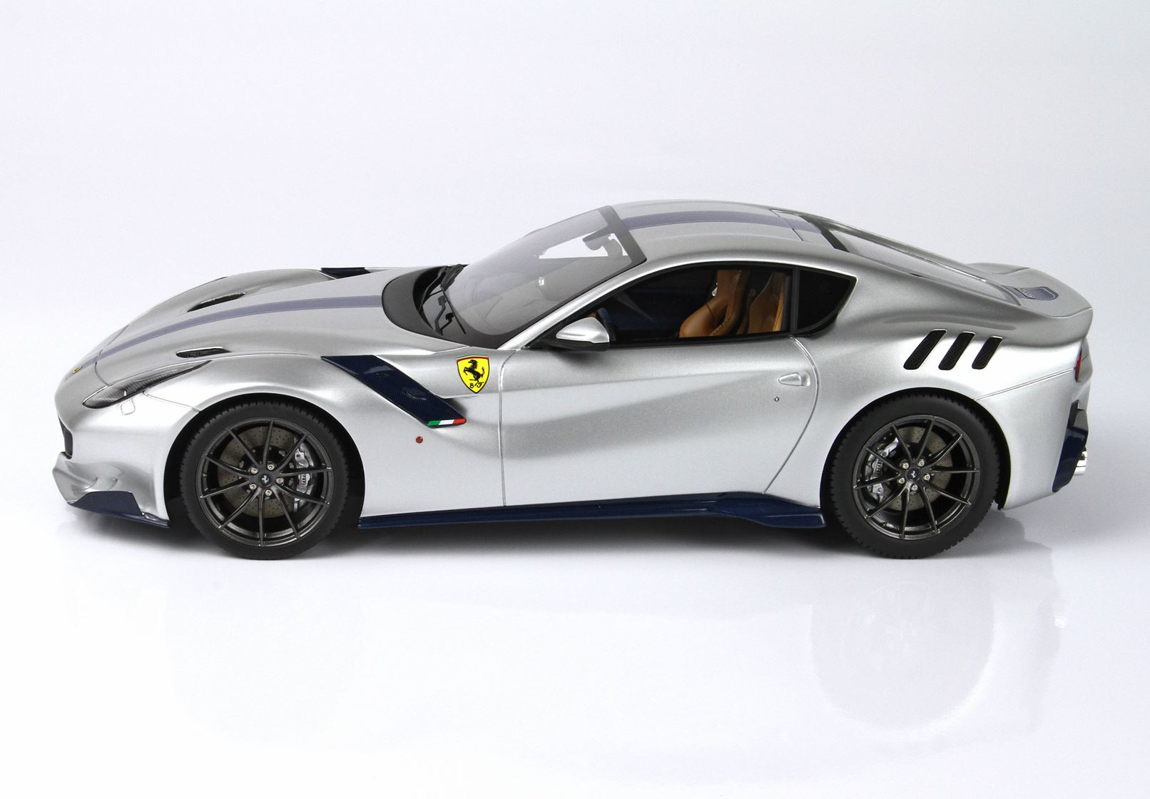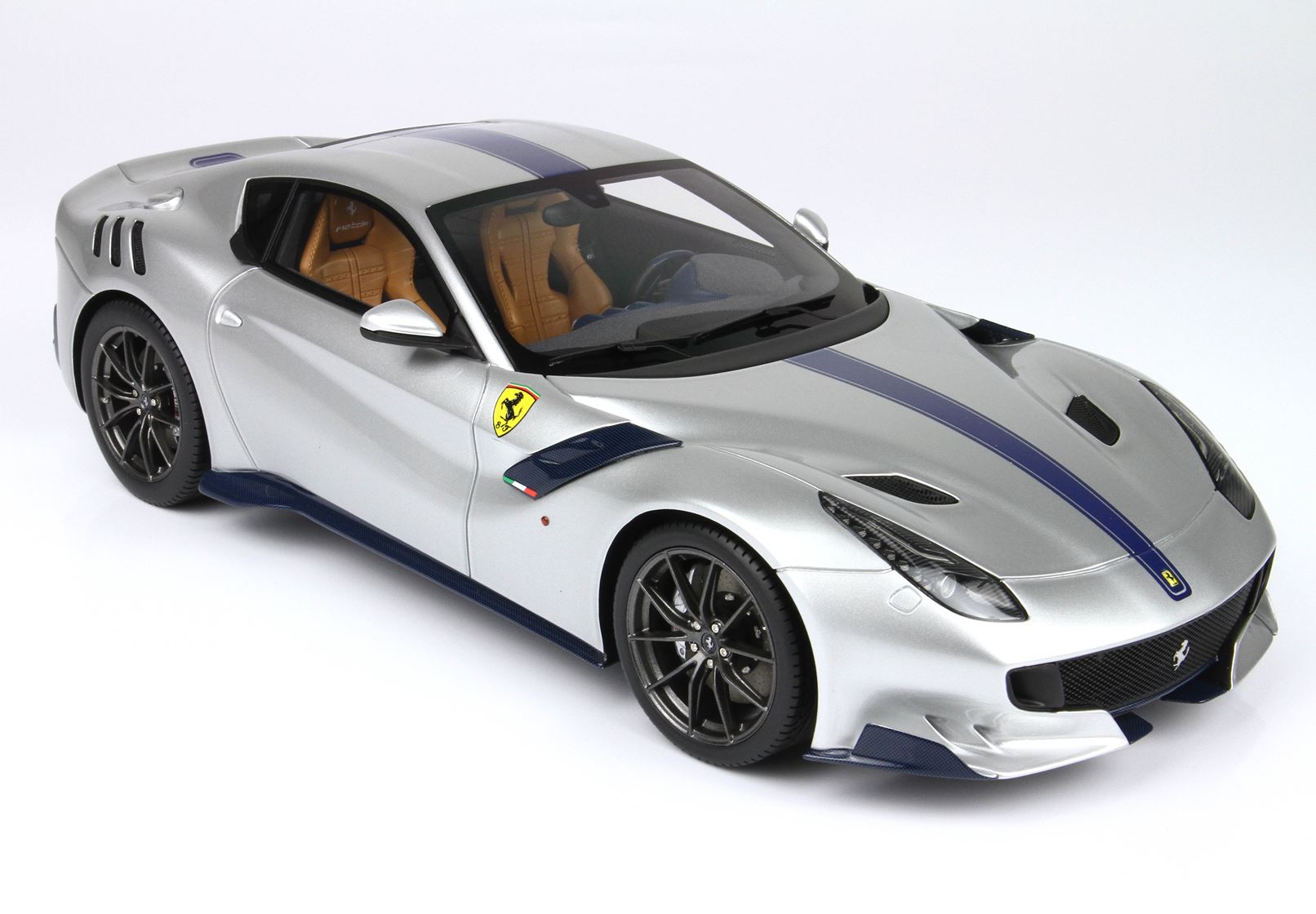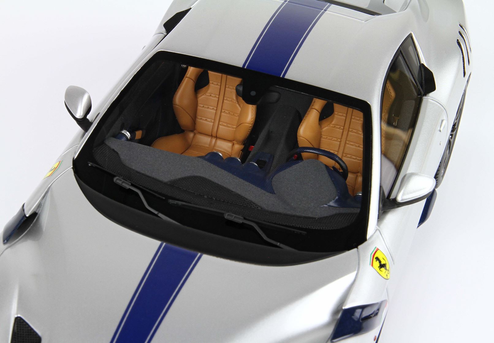 Tutta la fibra di carbonio esterna è blu, scudetto Ferrari più grande, tubi scappamento cromati.