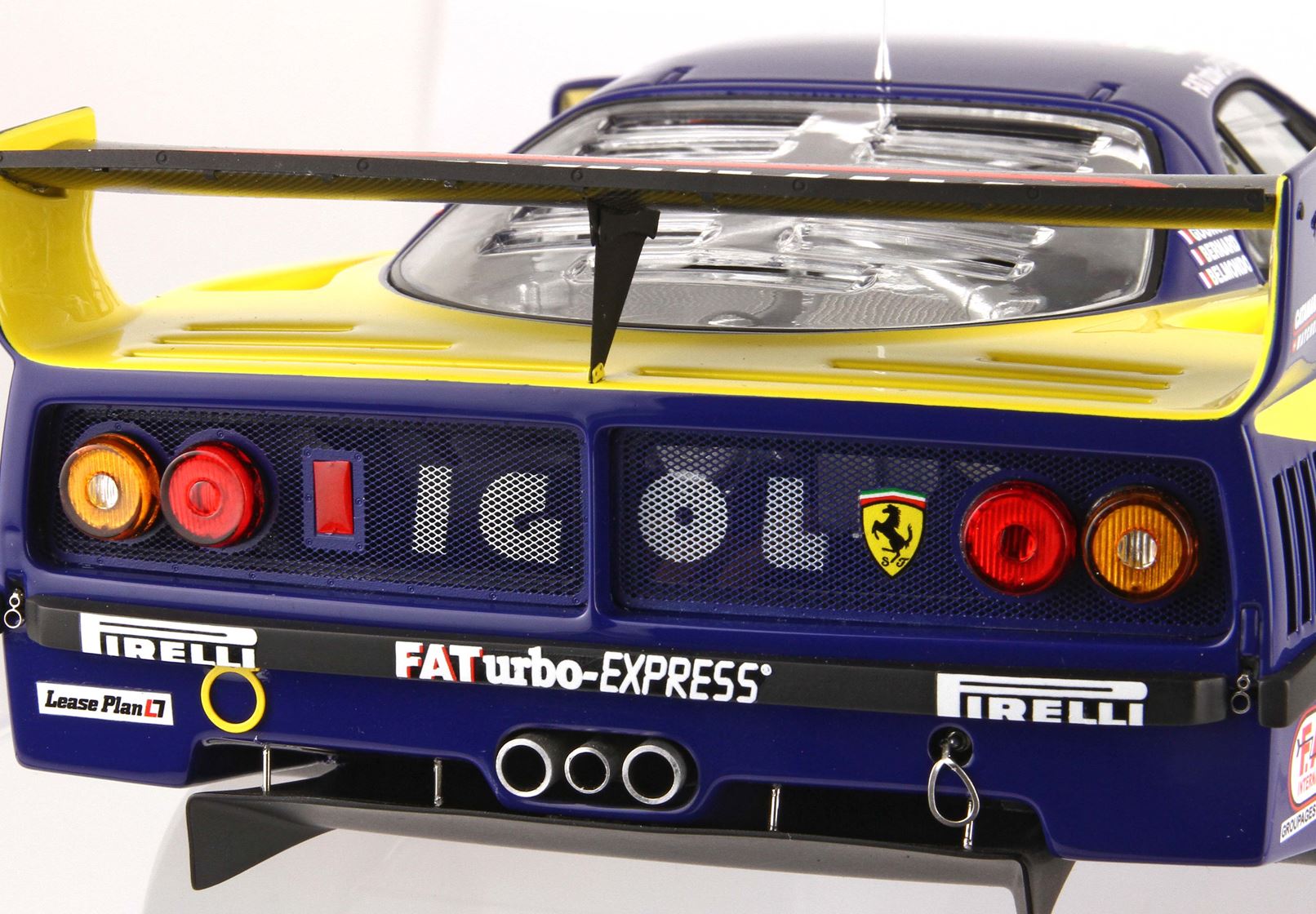 Nella parte posteriore della F40 LM si vede subito la modifica aerodinamica rispetto agli anni precedenti: l’alettone posteriore è più grande e la vettura è modificata per sostenere questo nuovo progetto aerodinamico.