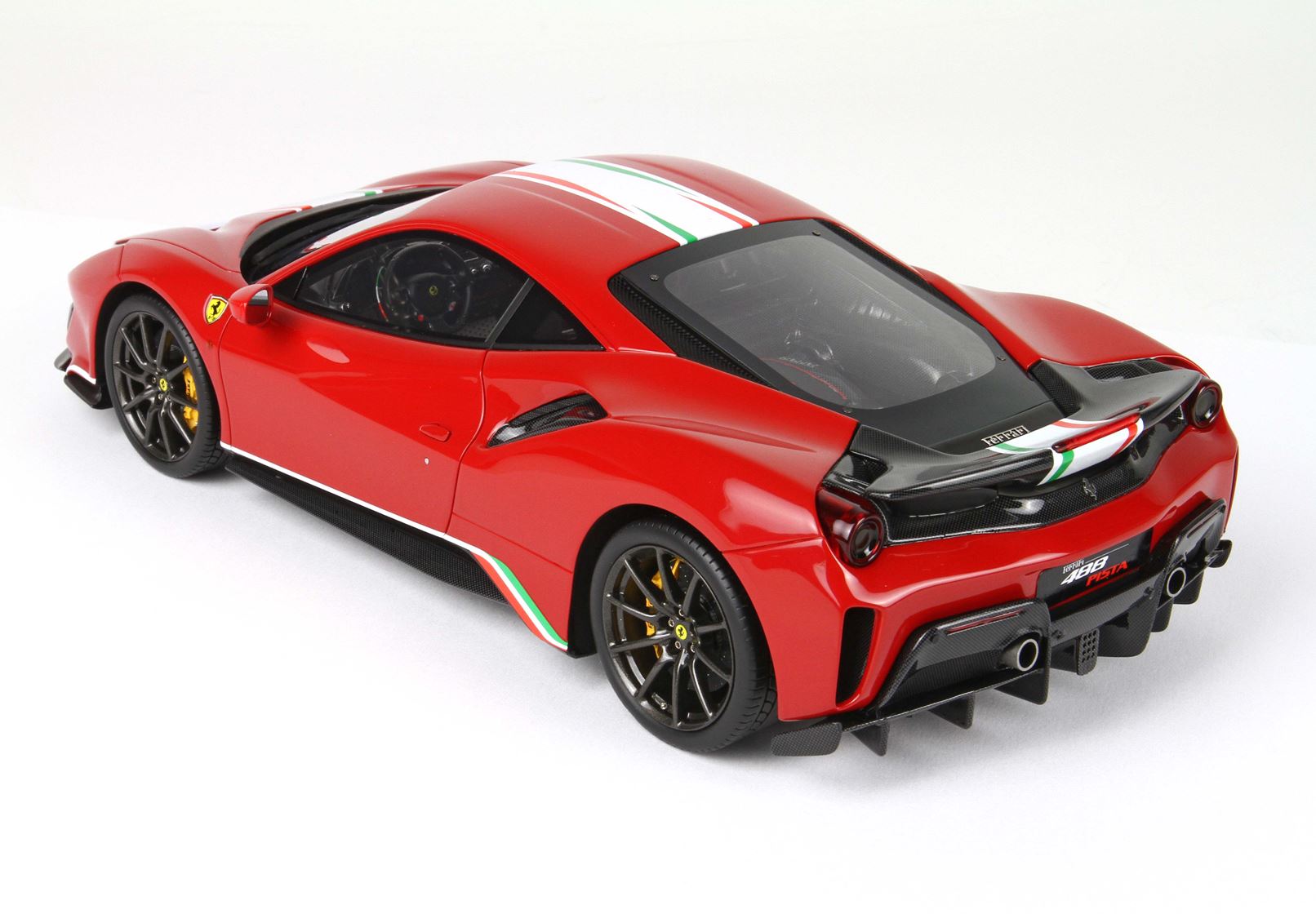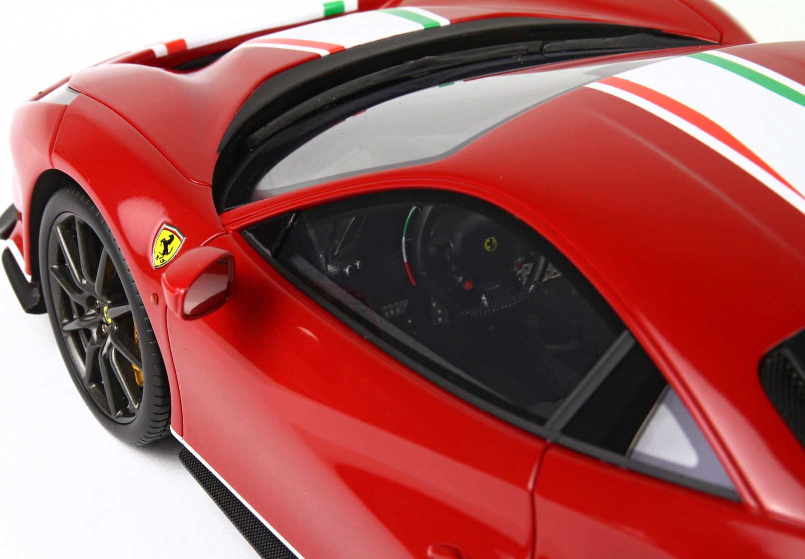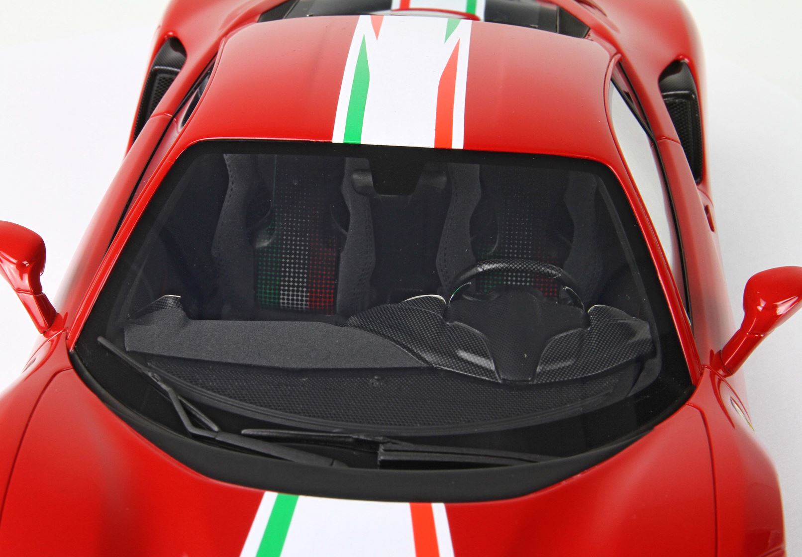 Passando agli interni, i rivestimenti dei sedili sono in una speciale Alcantara nera e traforata; al centro dello schienale viene ripresa una bandiera tricolore sfumata, tema ripreso anche sui tappetini e sul bordo delle palette del cambio.