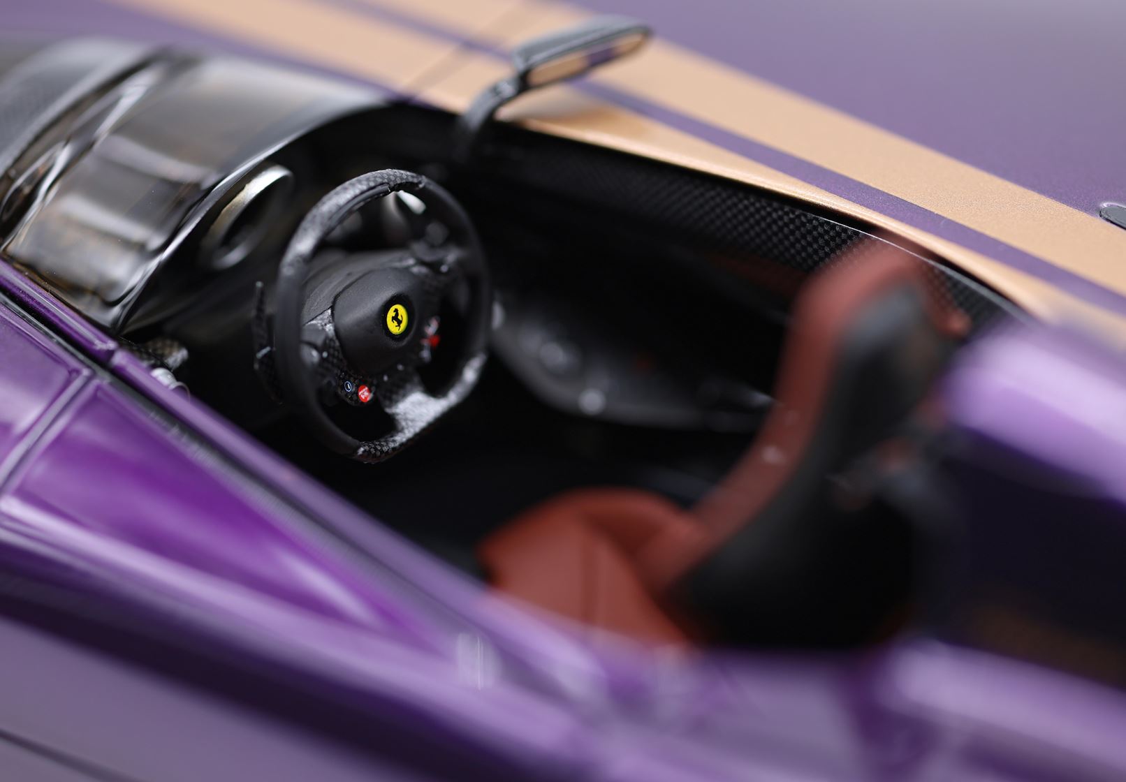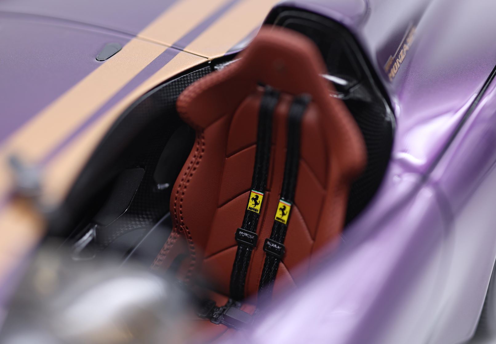 Ferrari ICONA SP1 porta su strada il concetto di monoposto. Il disegno all'apparenza sbilanciato con il sedile sul lato sinistro, ha in realtà una efficace resa aerodinamica.