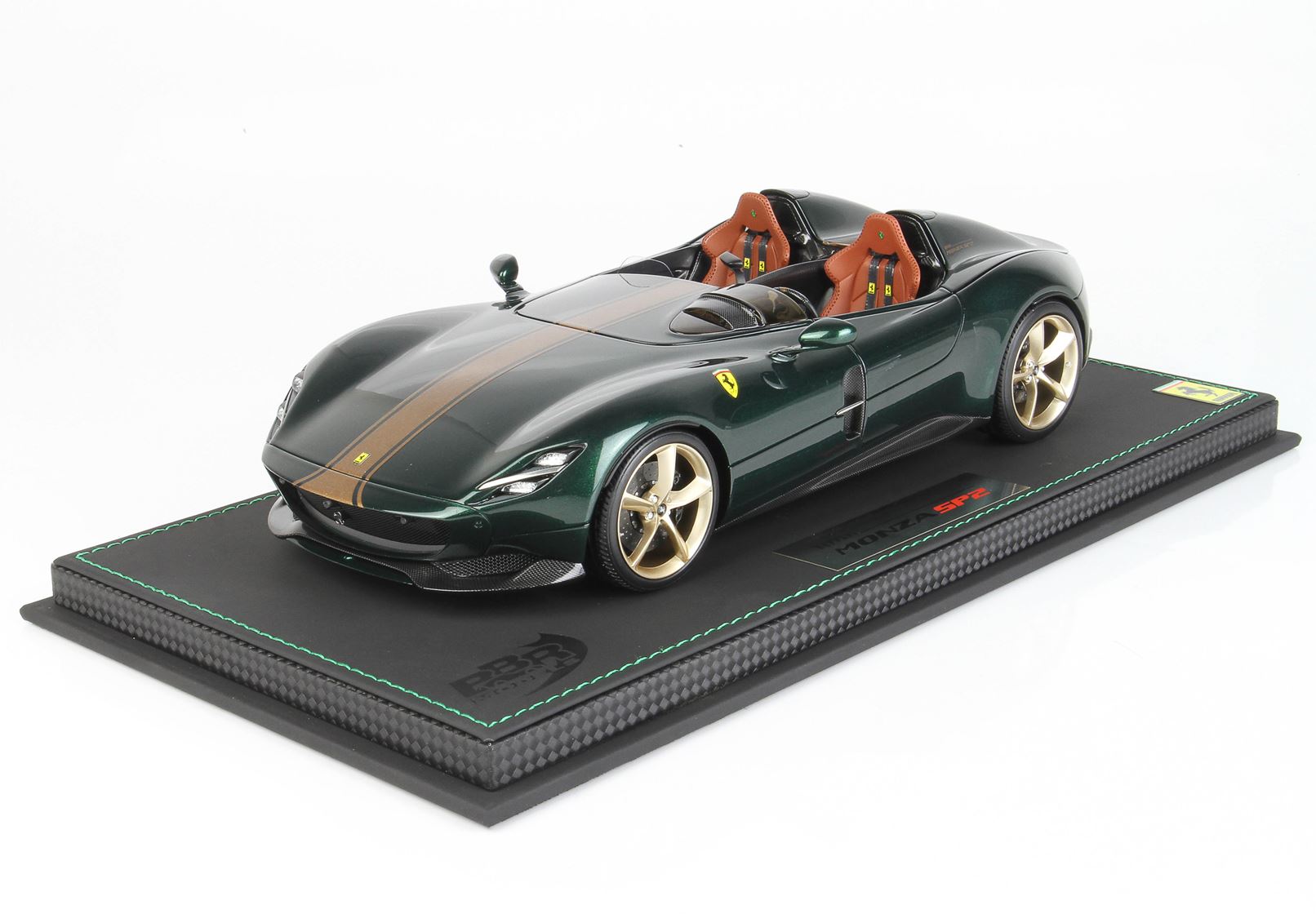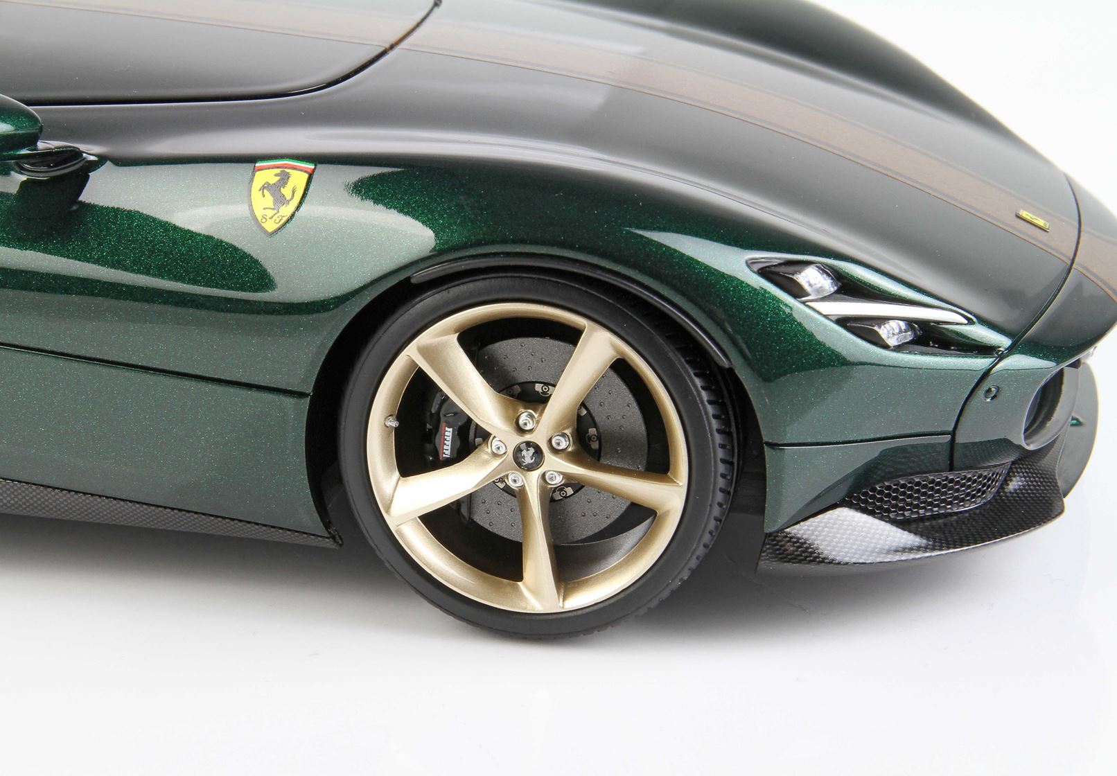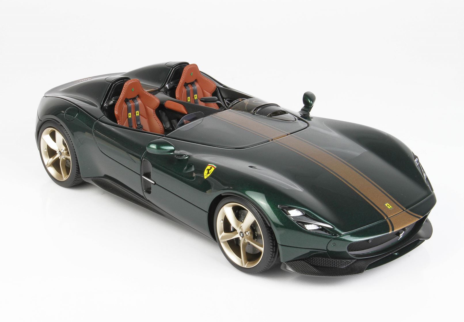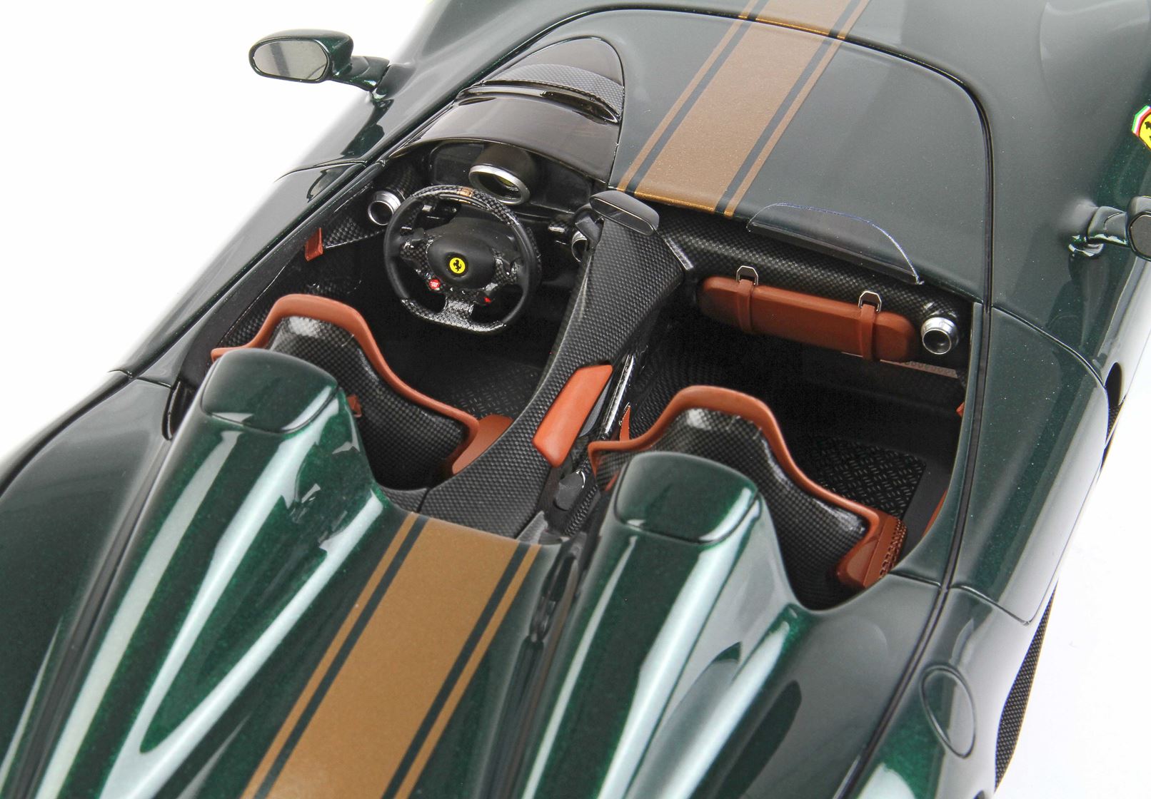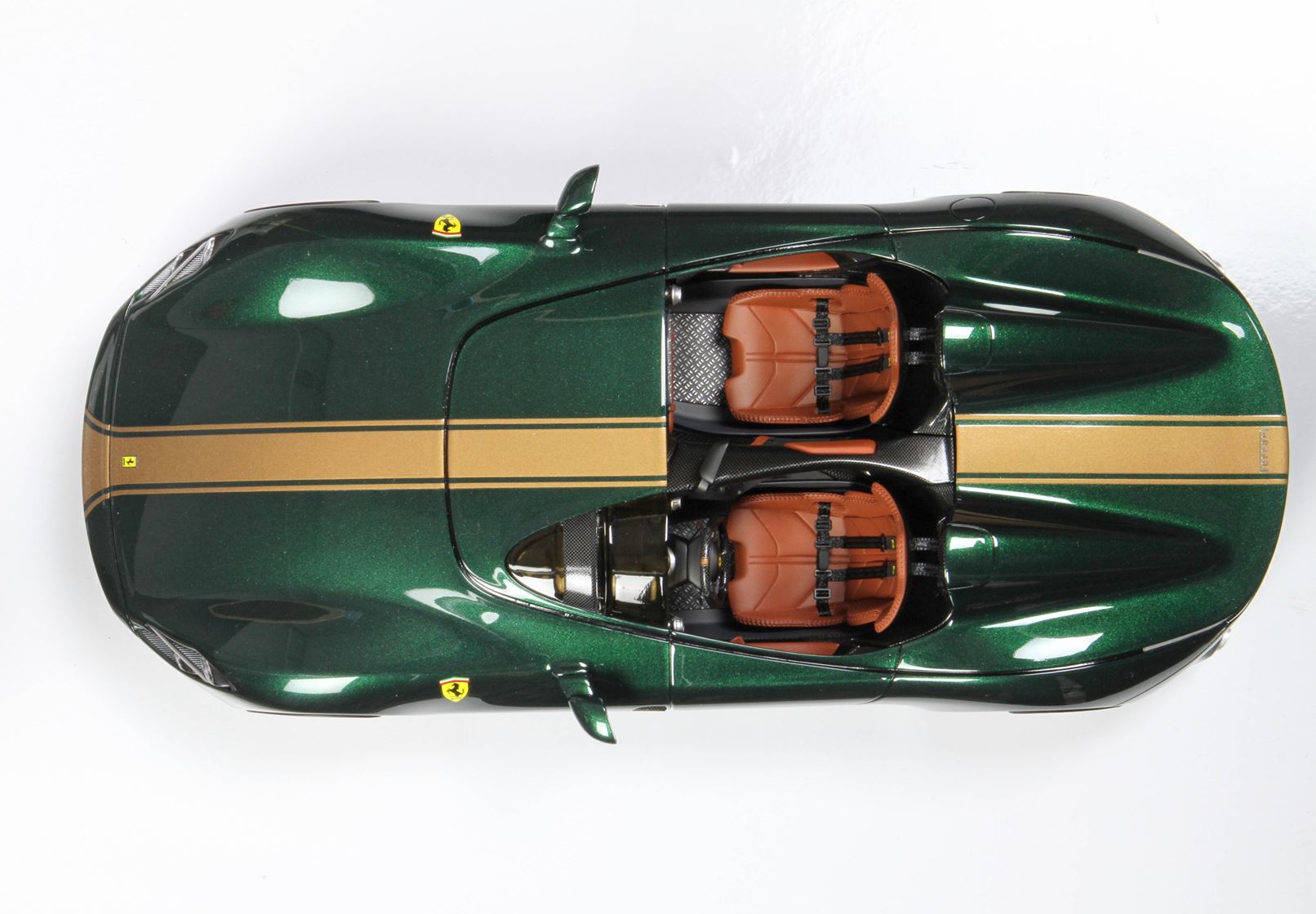 Stupenda versione in verde scuro metallizzato con strisce oro e accattivanti sedili in colore cuoio.