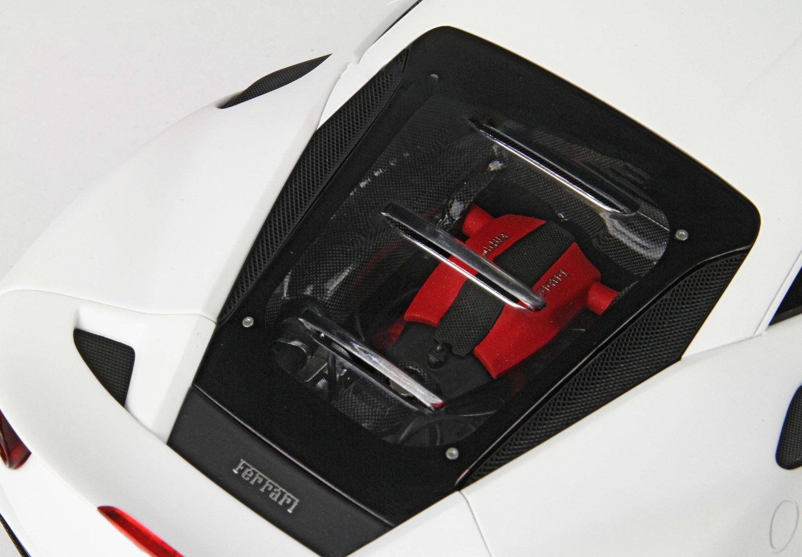 Il motore è fedelmente replicato con particolare vernice rossa , tutta la parte del motore è rivestita con decals fibra carbonio .