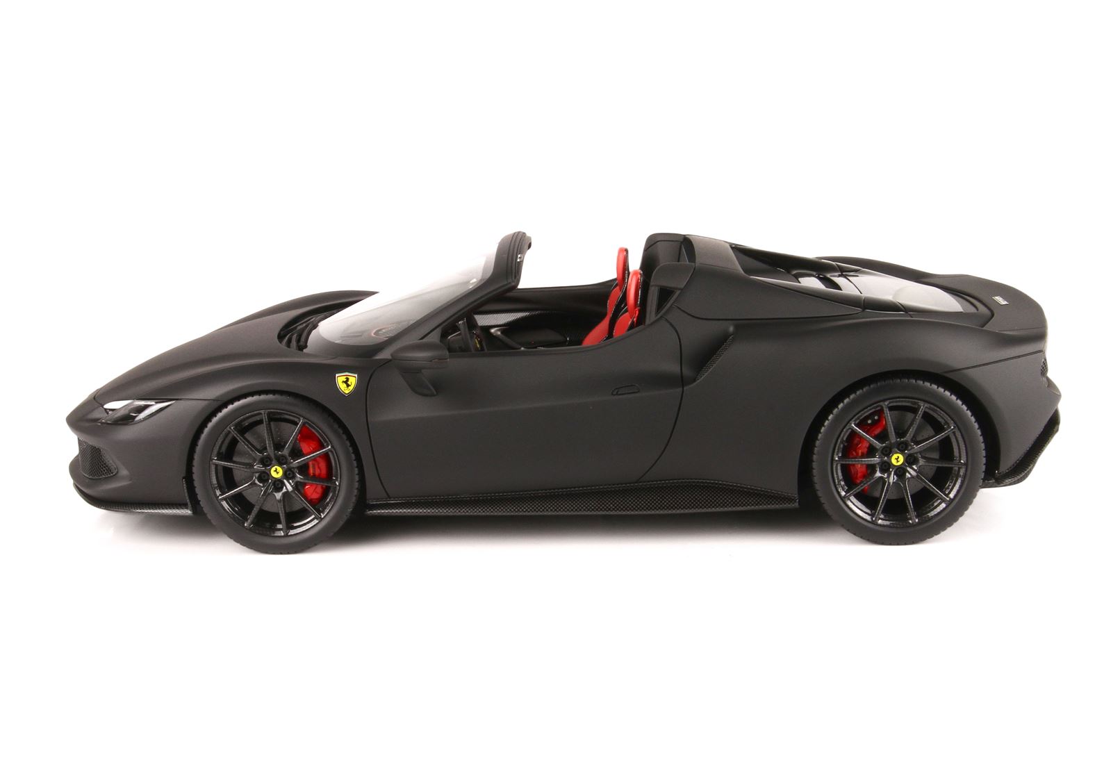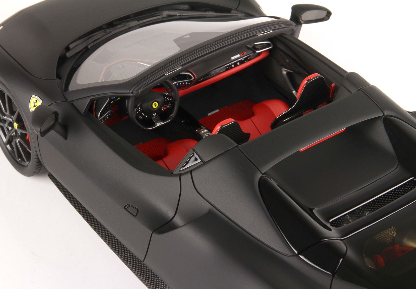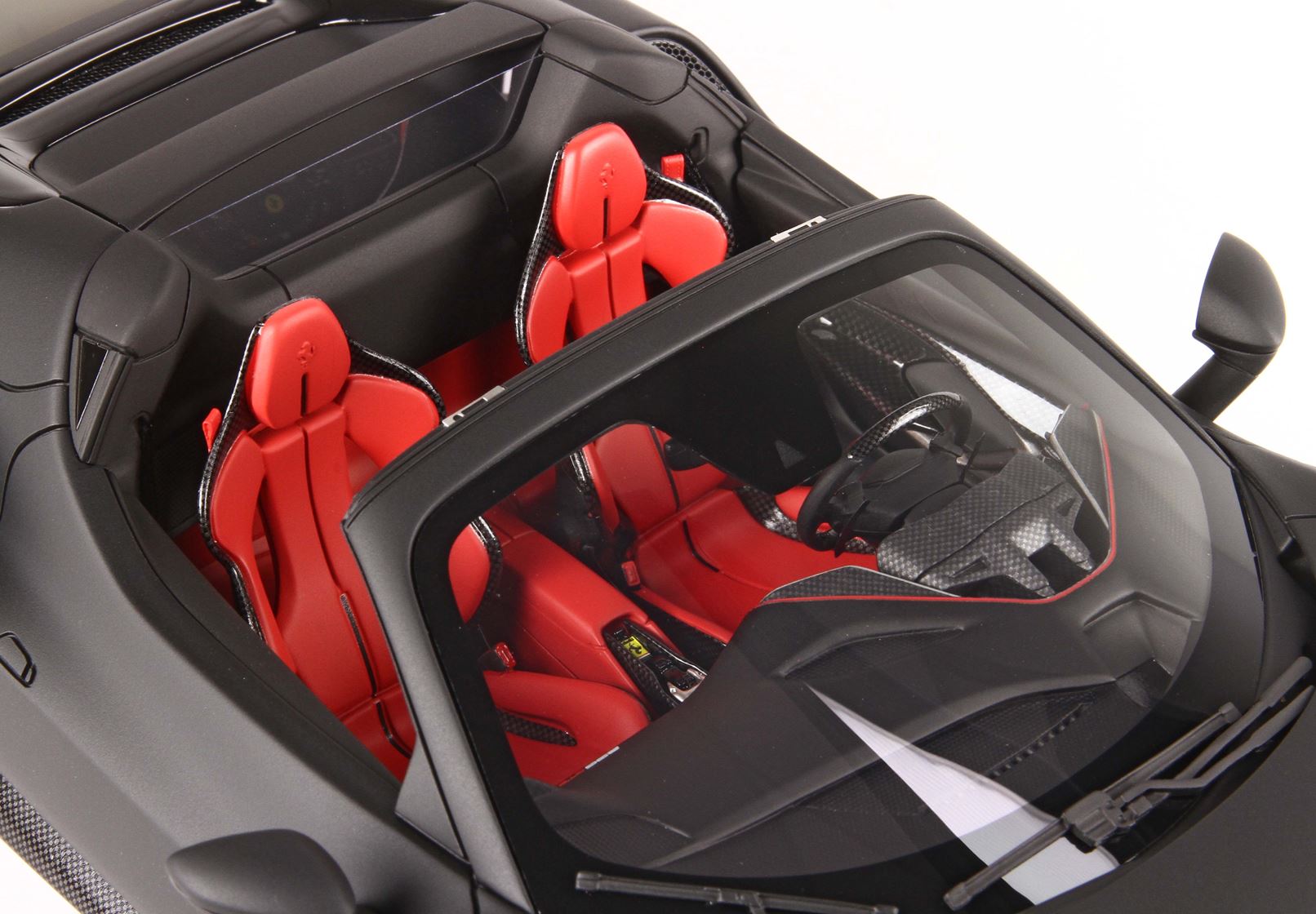 Nero Opaco con sedili sportivi in colore rosso Cartier e ruote in replica fibra di carbonio.