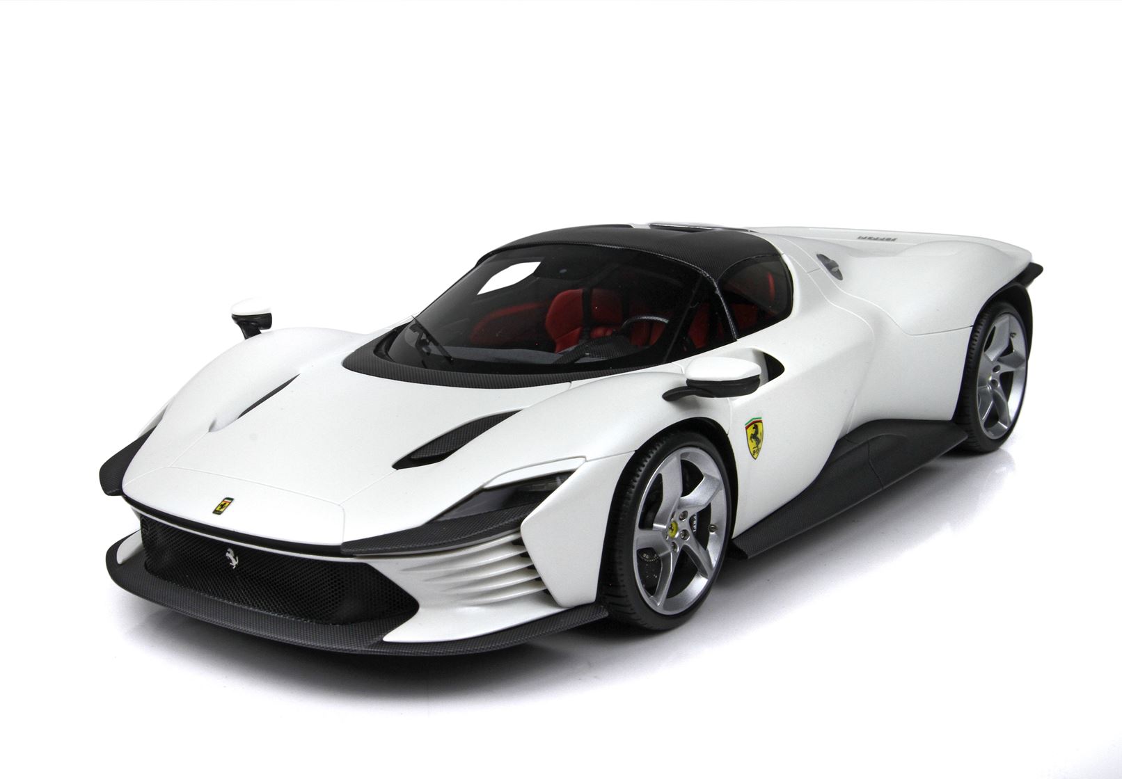 Il colore proposto è il Bianco Italia metallizzato opaco, con interni rosso Cartier.