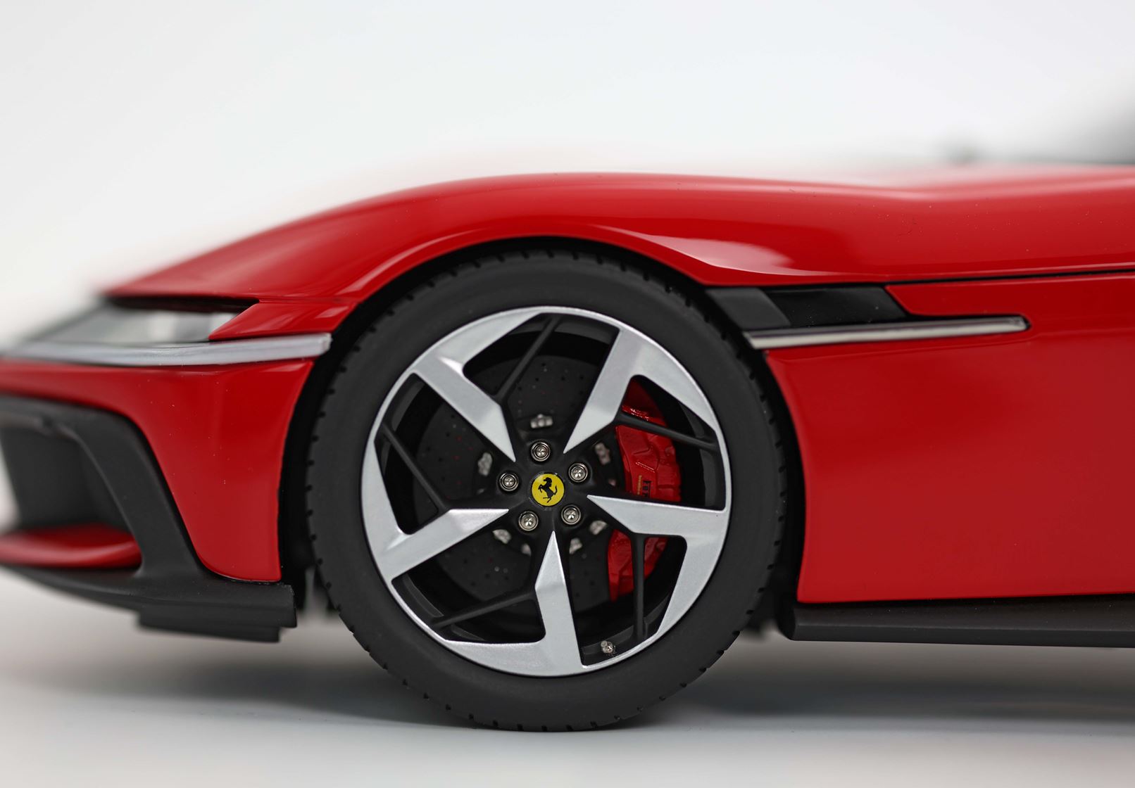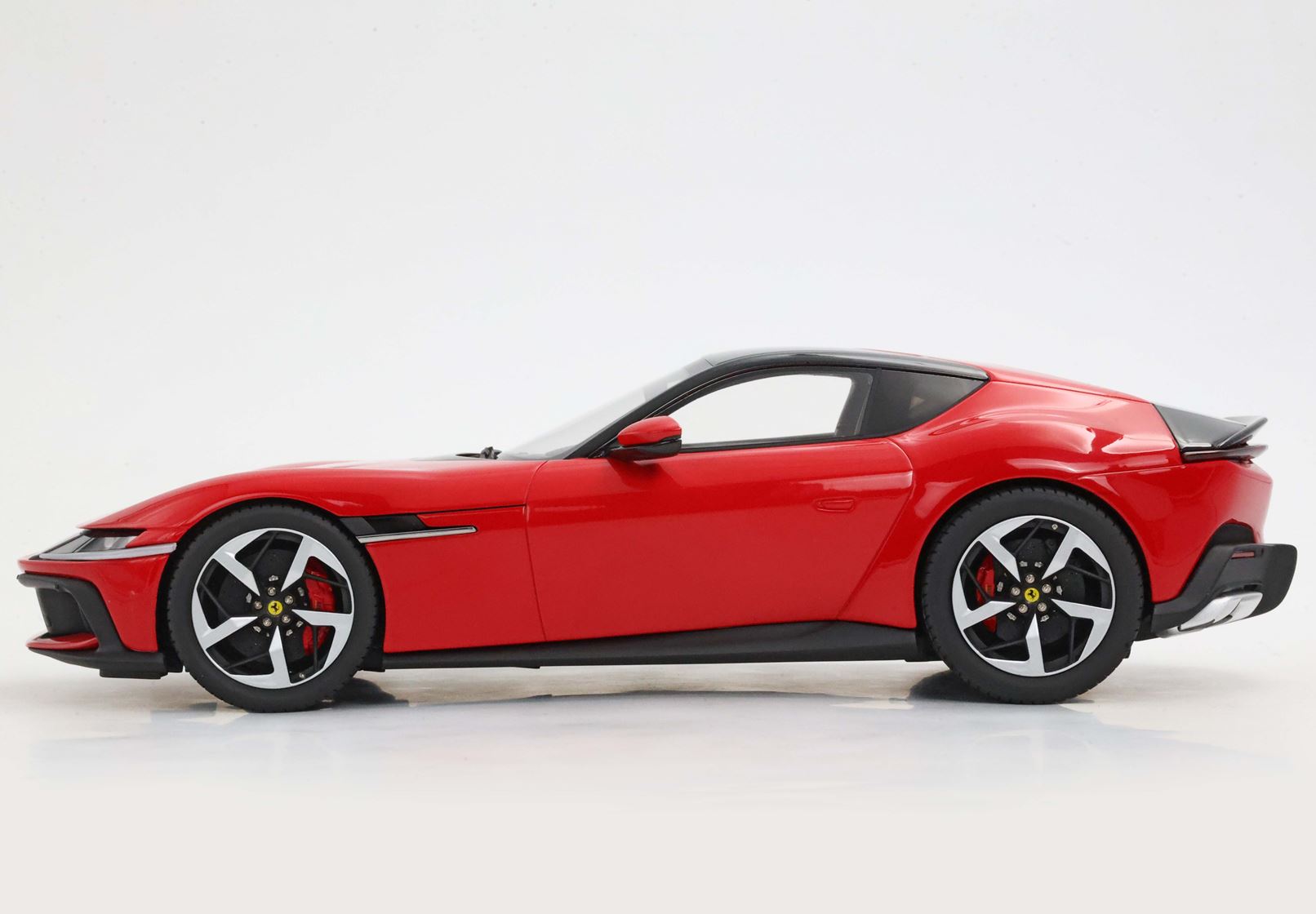 Le linee essenziali sono rese muscolari dai parafanghi. Quello posteriore prominente ma senza eccessi, è perfettamente integrato nella geometria dell'auto. Quello anteriore, con evidente richiamo alla 365GTB Daytona, mostra il suo fascino sinuoso impreziosendo la fiancata. Nel frontale, un'unica fascia avvolgente integra i fari e i DRL come due lame di luce. Proporzioni perfette per una GT: muso lunghissimo, abitacolo compatto e retro corto.