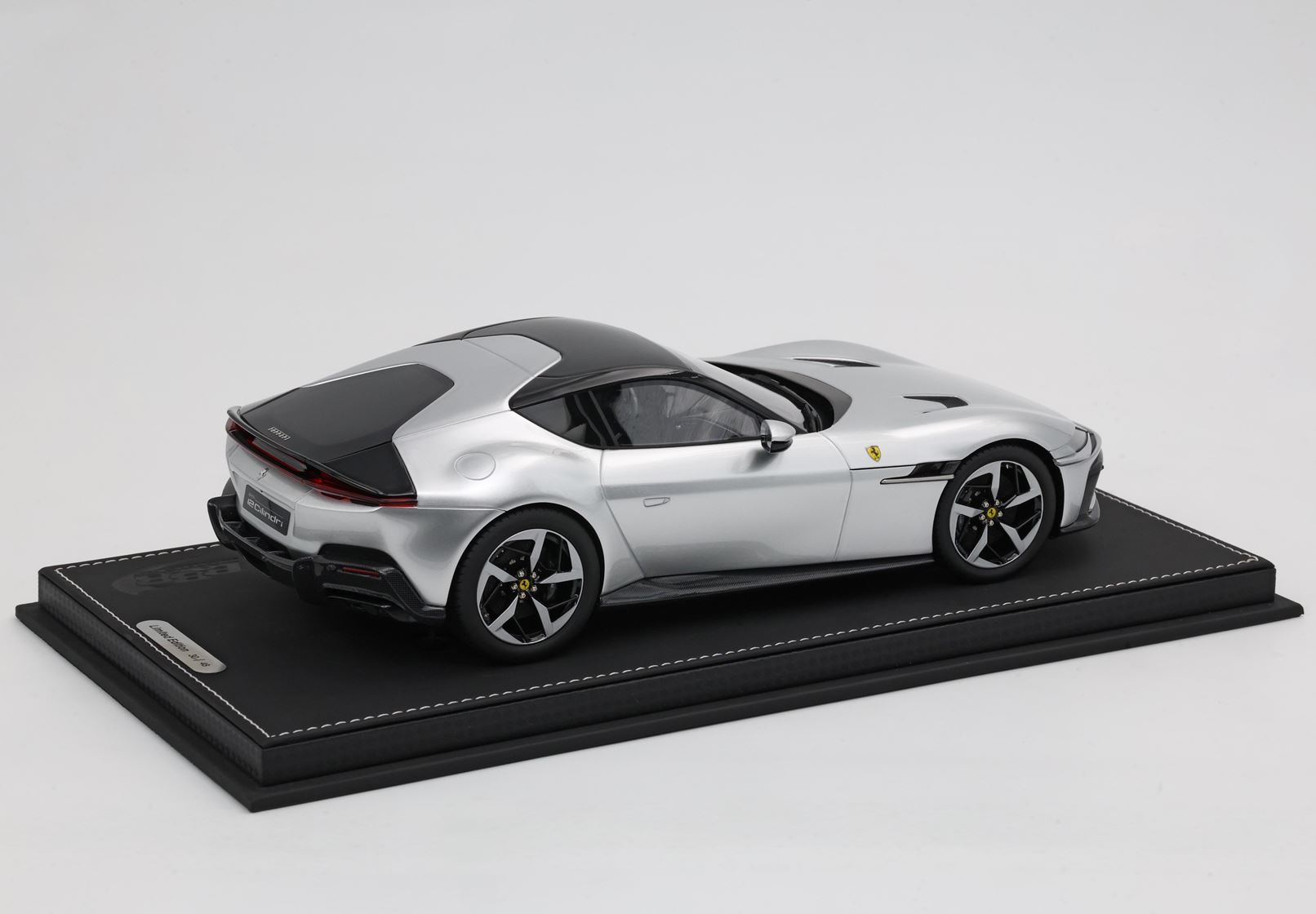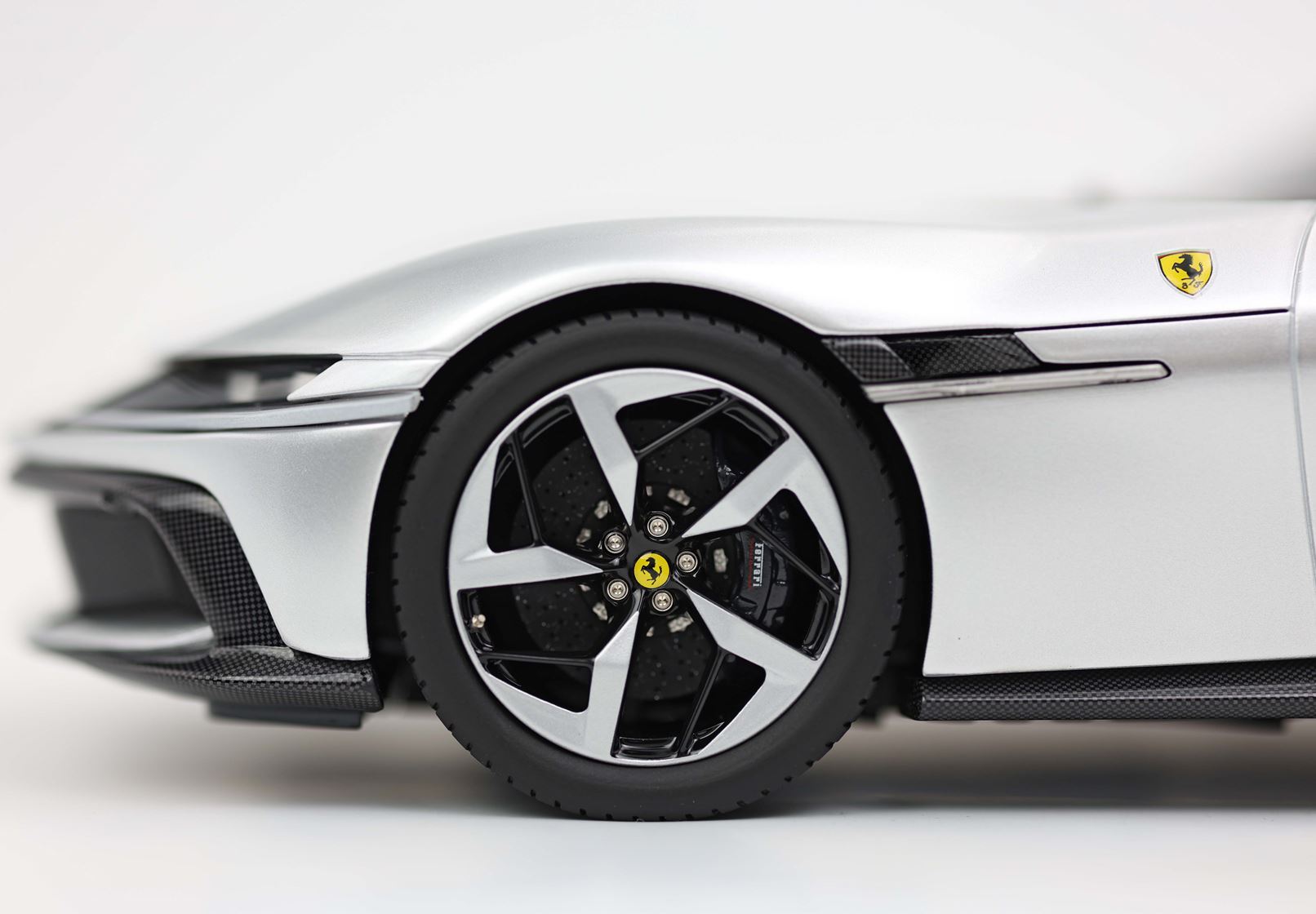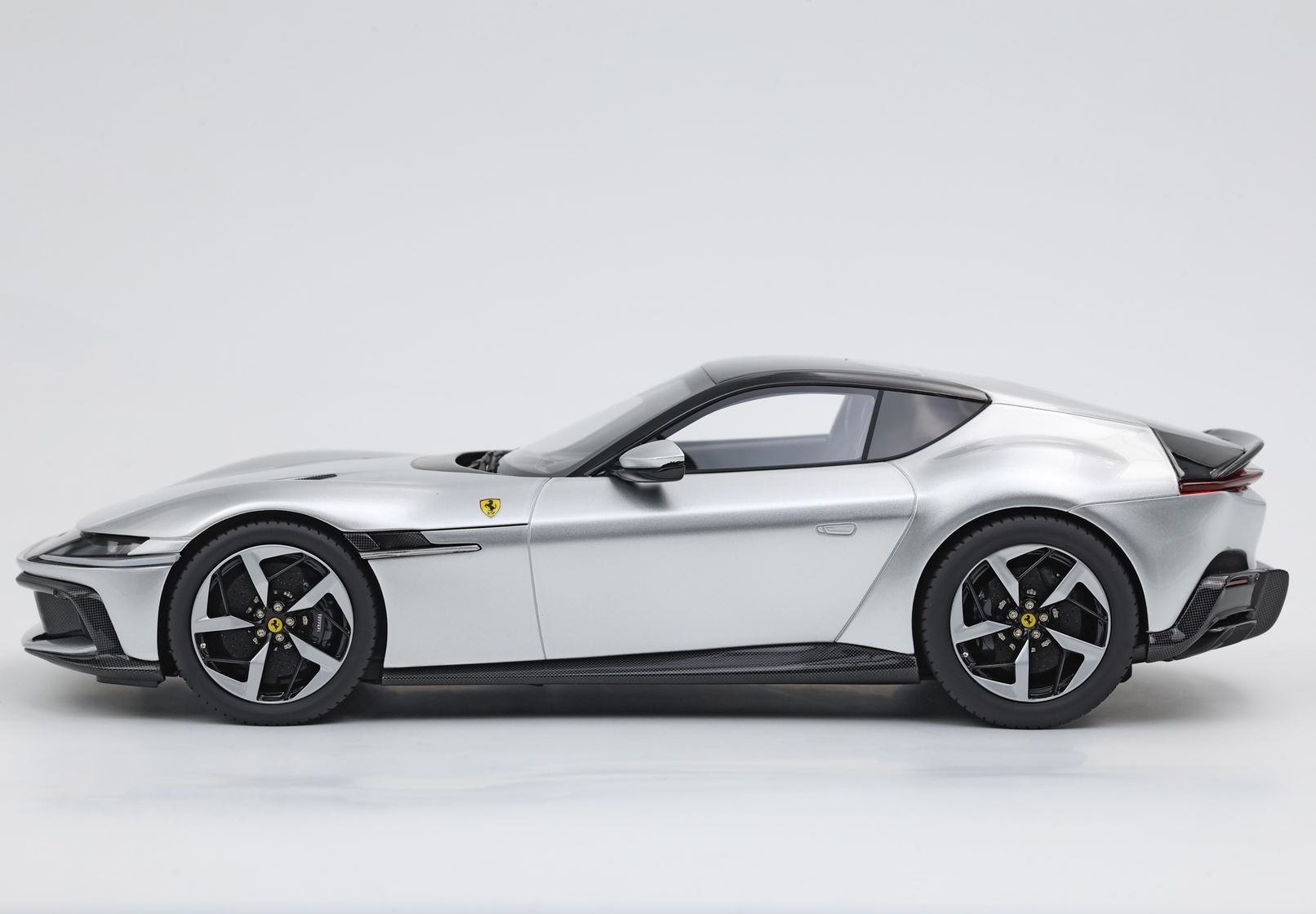 Le linee essenziali sono rese muscolari dai parafanghi. Quello posteriore prominente ma senza eccessi, è perfettamente integrato nella geometria dell'auto. Quello anteriore, con evidente richiamo alla 365GTB Daytona, mostra il suo fascino sinuoso impreziosendo la fiancata. Nel frontale, un'unica fascia avvolgente integra i fari e i DRL come due lame di luce. Proporzioni perfette per una GT: muso lunghissimo, abitacolo compatto e retro corto.