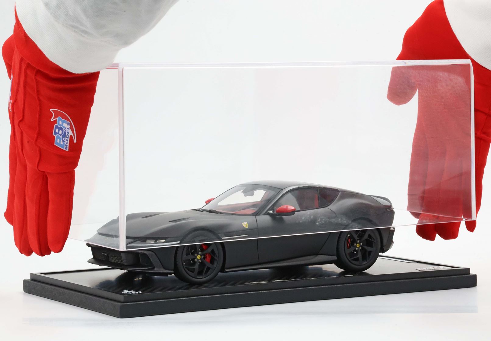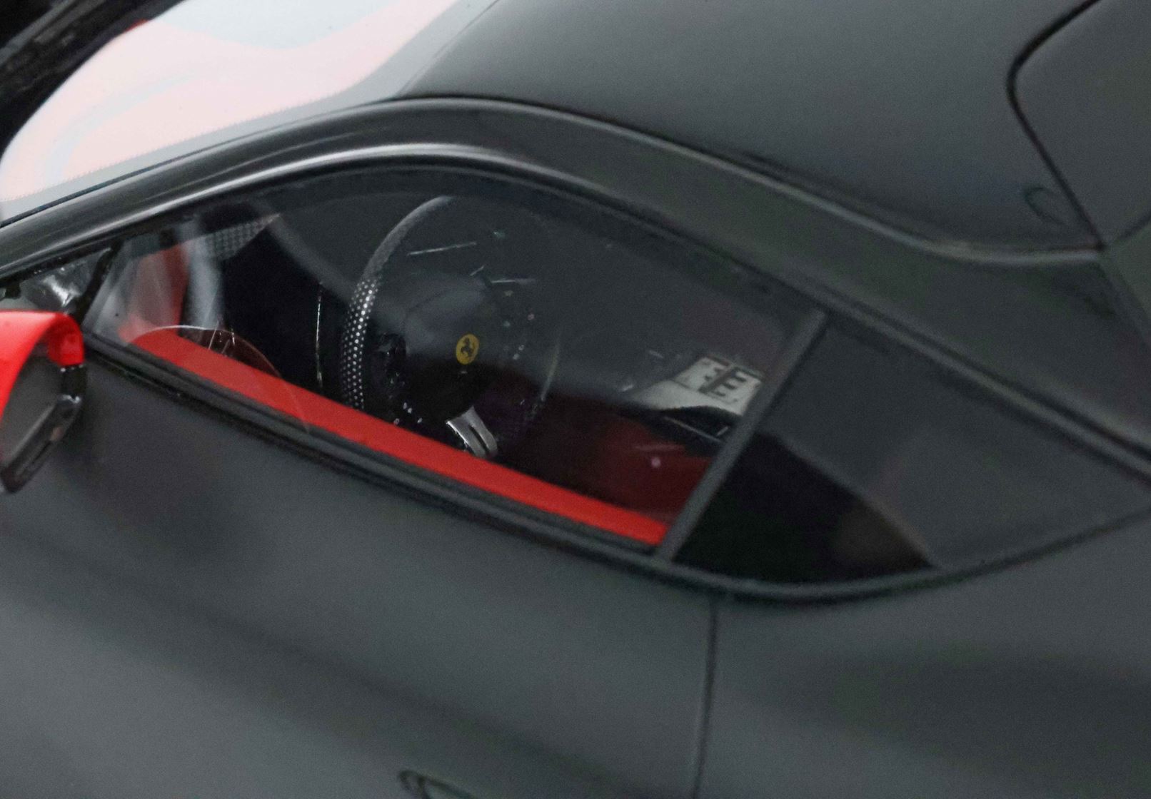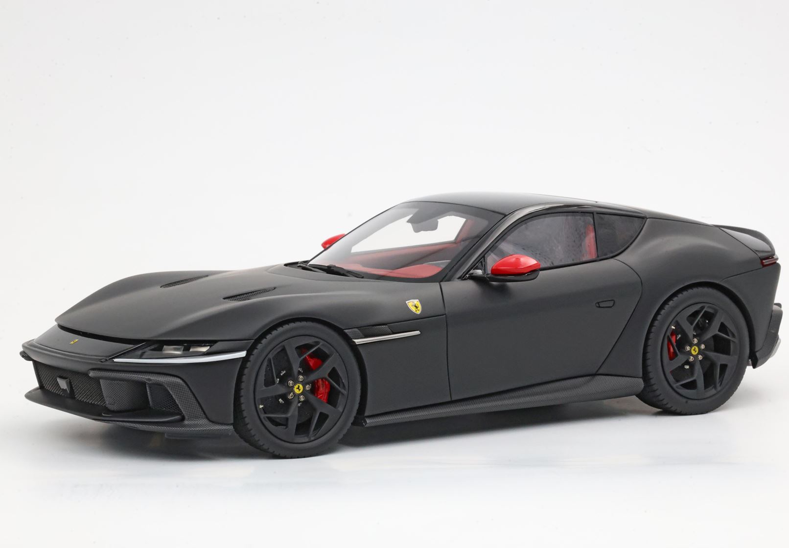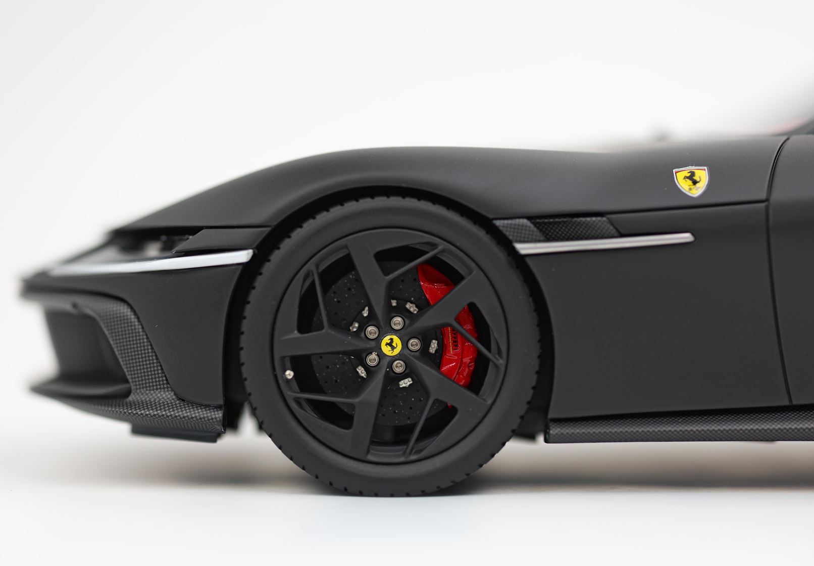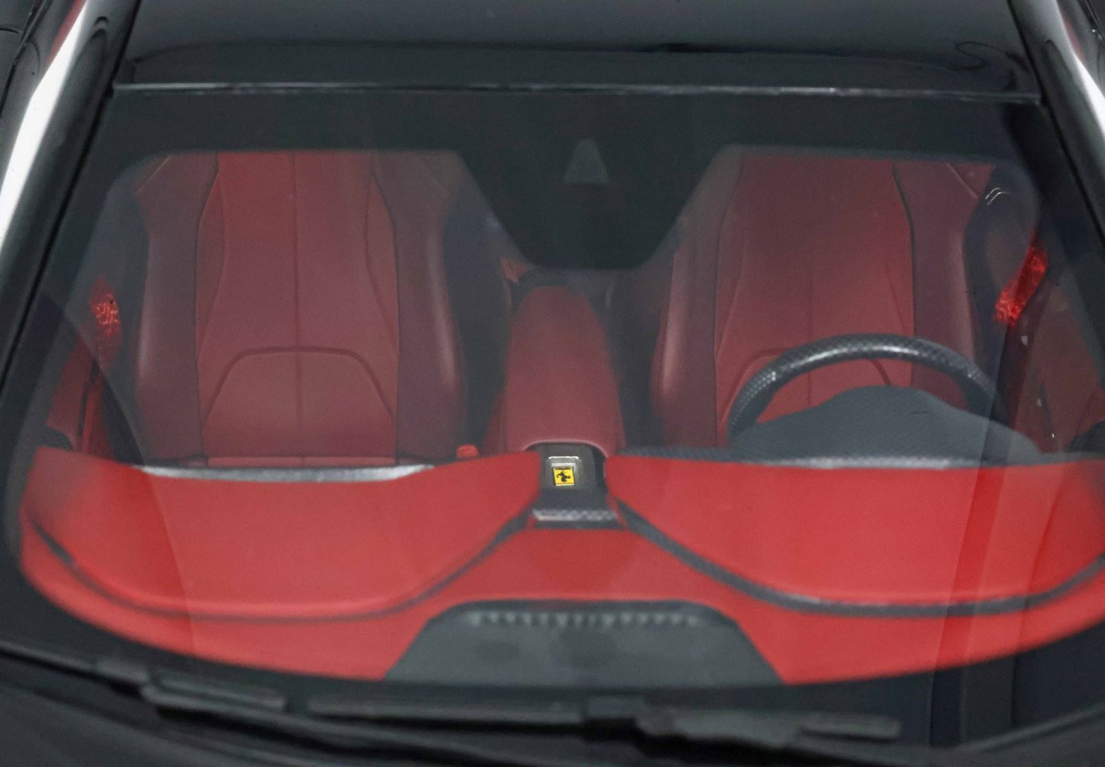 Le linee essenziali sono rese muscolari dai parafanghi. Quello posteriore prominente ma senza eccessi, è perfettamente integrato nella geometria dell'auto. Quello anteriore, con evidente richiamo alla 365GTB Daytona, mostra il suo fascino sinuoso impreziosendo la fiancata. Nel frontale, un'unica fascia avvolgente integra i fari e i DRL come due lame di luce. Proporzioni perfette per una GT: muso lunghissimo, abitacolo compatto e retro corto.