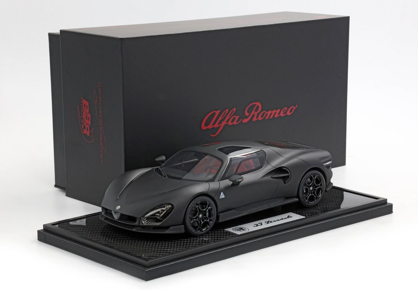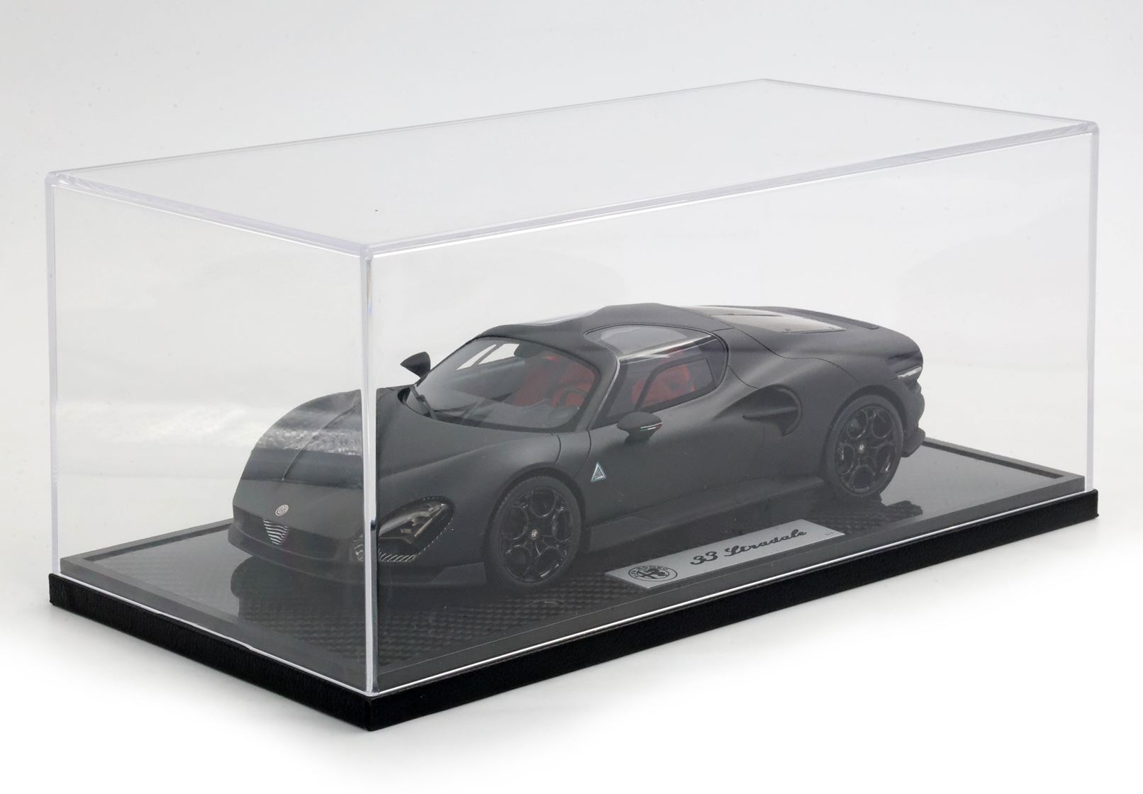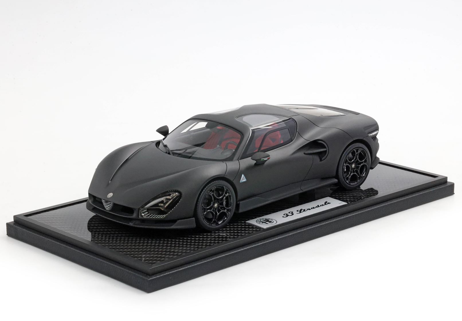 Questo modello rappresenta l'unione della esclusività di Alfa Romeo 33 Stradale la performance tecnica del carbonio. VERSIONE SPECIALE CON BASE IN CARBONIO E VETRINA INCLUSE.