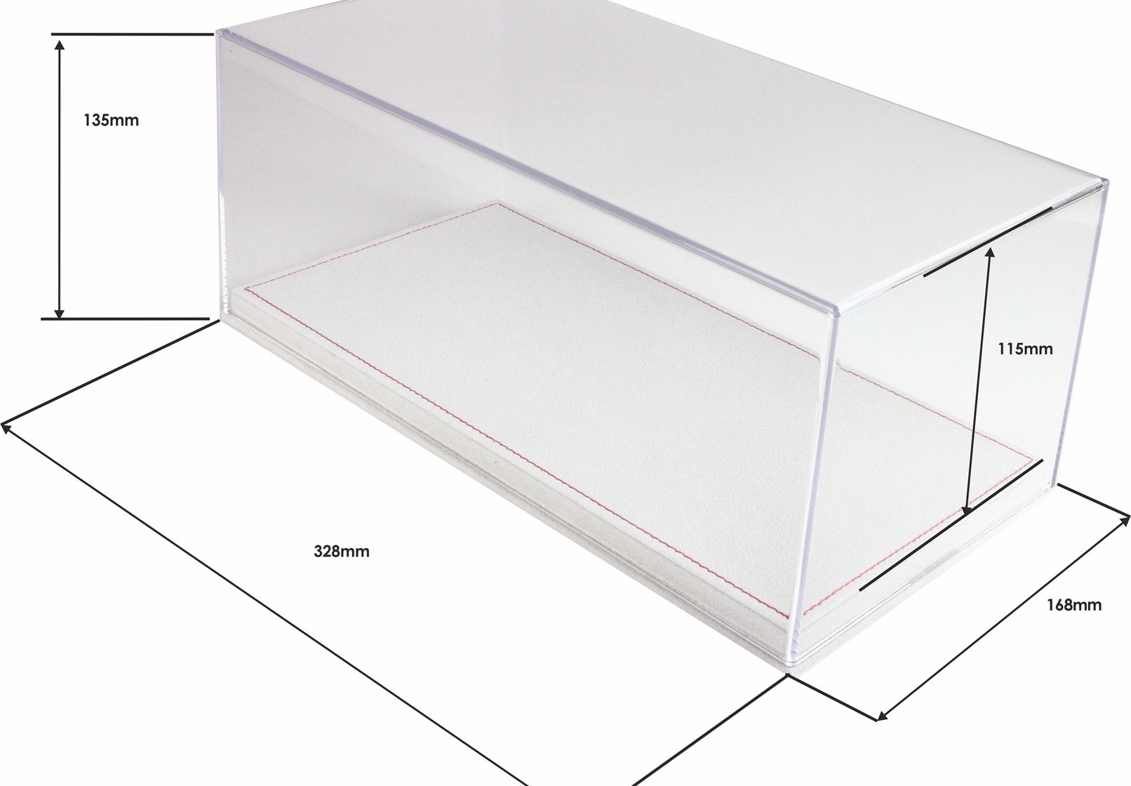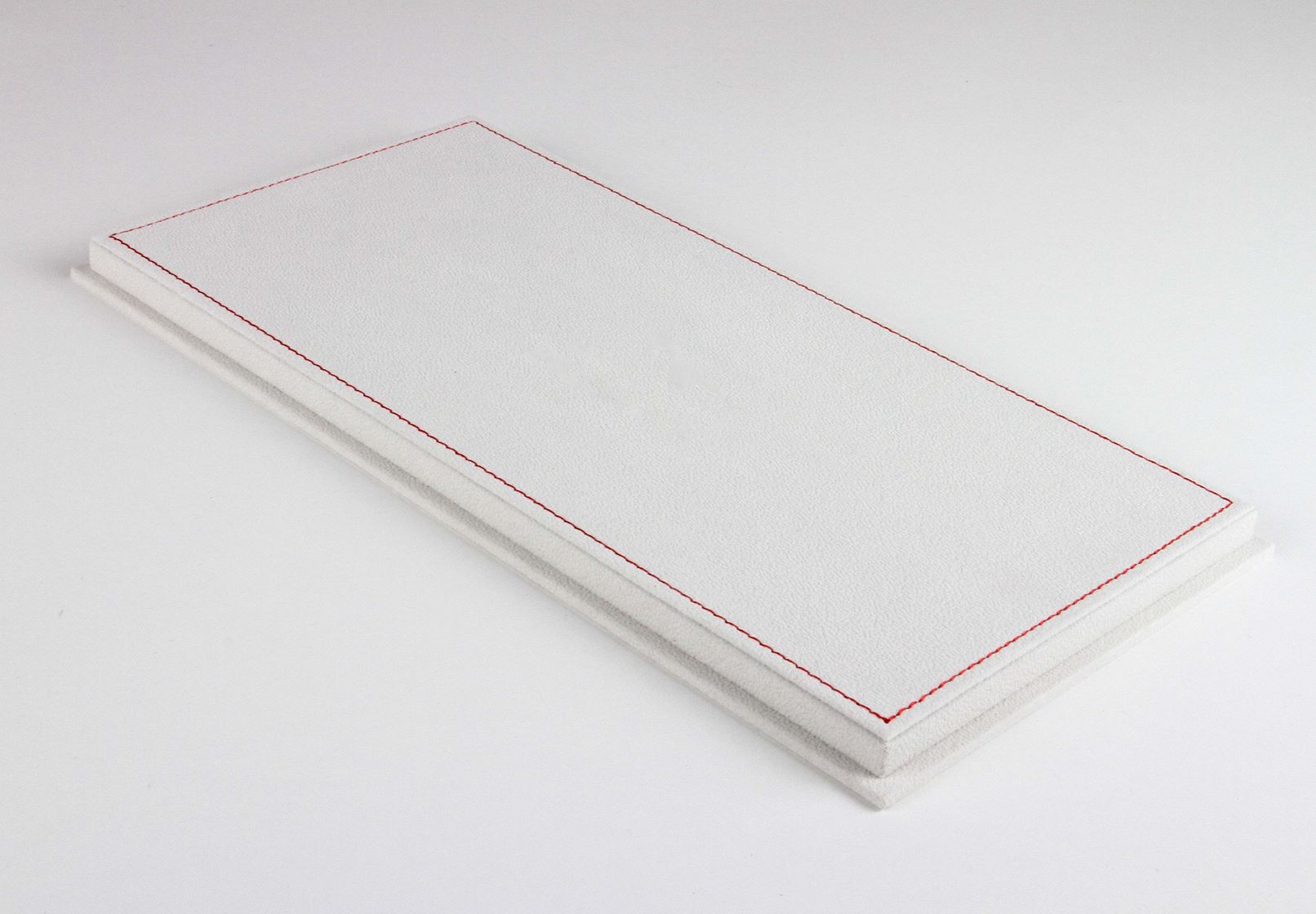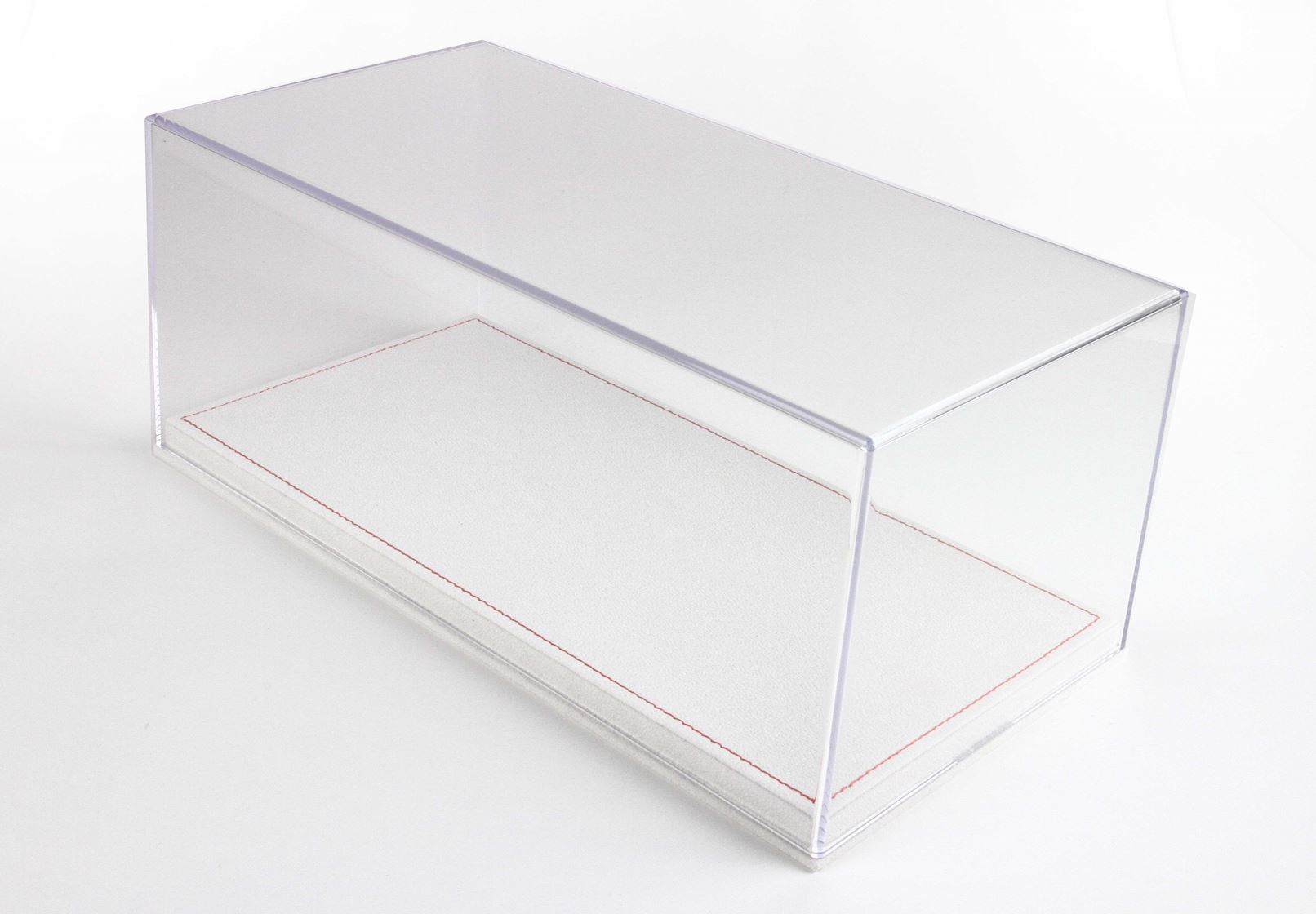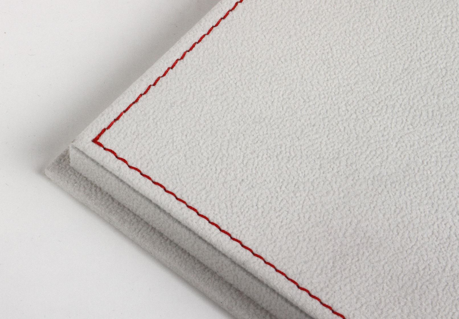 Vetrina con base in alcantara beige chiaro e cuciture rosse